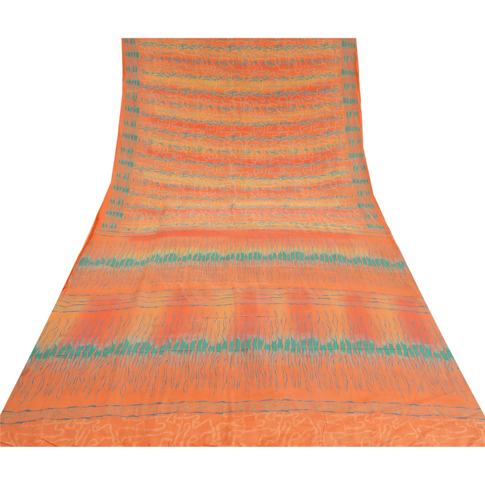 Beautiful peach colored pure crepe silk printed saree. Pallu & Border has printed abstract design. Similar design in center part of saree. What is special about this saree? Fabulous design is really enhancing the beauty of the saree.This unique vintage saree can be used for various crafting ideas even if you don't want to use it as a sari. Design a dress, use it as window,dressing, upholstery, sarongs, throw, dress making and table linen much more. Let your creative juices flow and use this decorated Sustainable Fabric in multiple fashion.