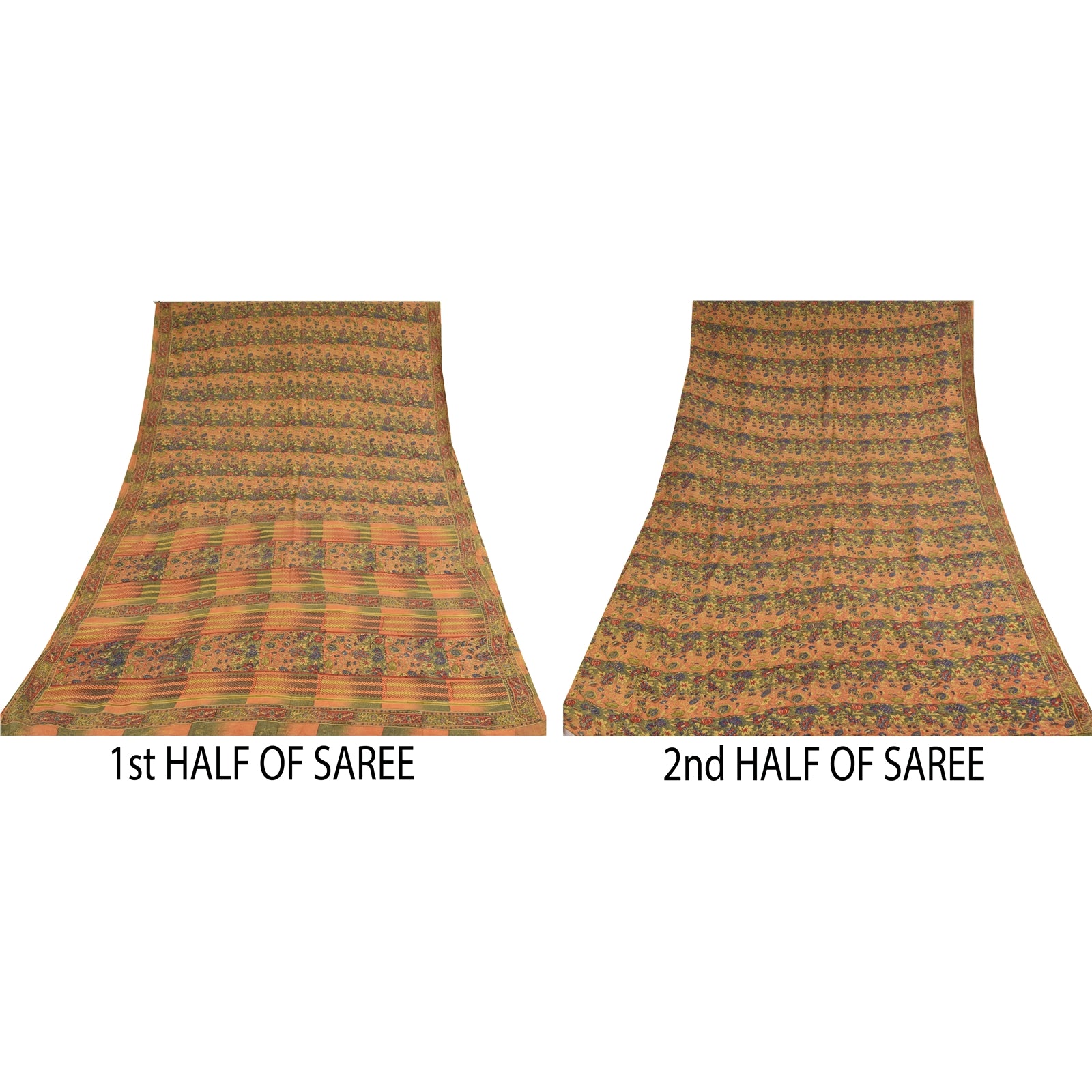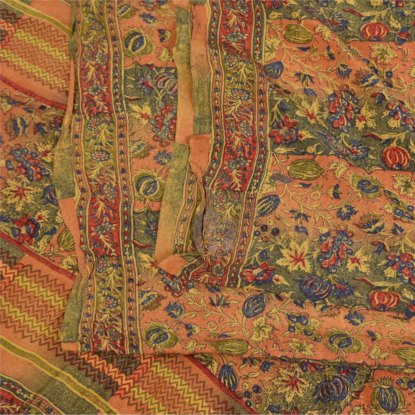 Sanskriti Vintage Sarees Peach/Green Pure Crepe Printed Sari 5+yd Craft Sustainable Fabric
