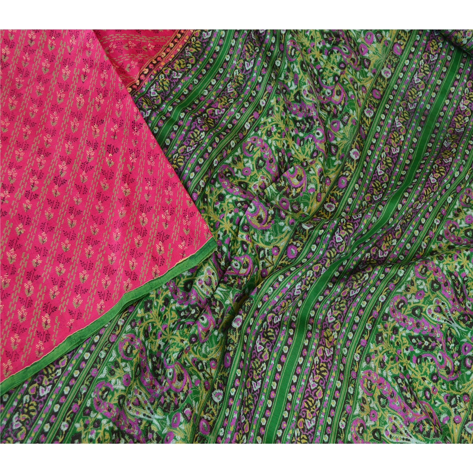 Beautiful pink & green colored pure silk printed saree. Pallu & Border has printed floral design. Printed floral design in center part of saree. What is special about this saree? Fabulous design is really enhancing the beauty of the saree.This unique vintage saree can be used for various crafting ideas even if you don't want to use it as a sari. Design a dress, use it as window,dressing, upholstery, sarongs, throw, dress making and table linen much more. Let your creative juices flow and use this decorated Sustainable Fabric in multiple fashion.