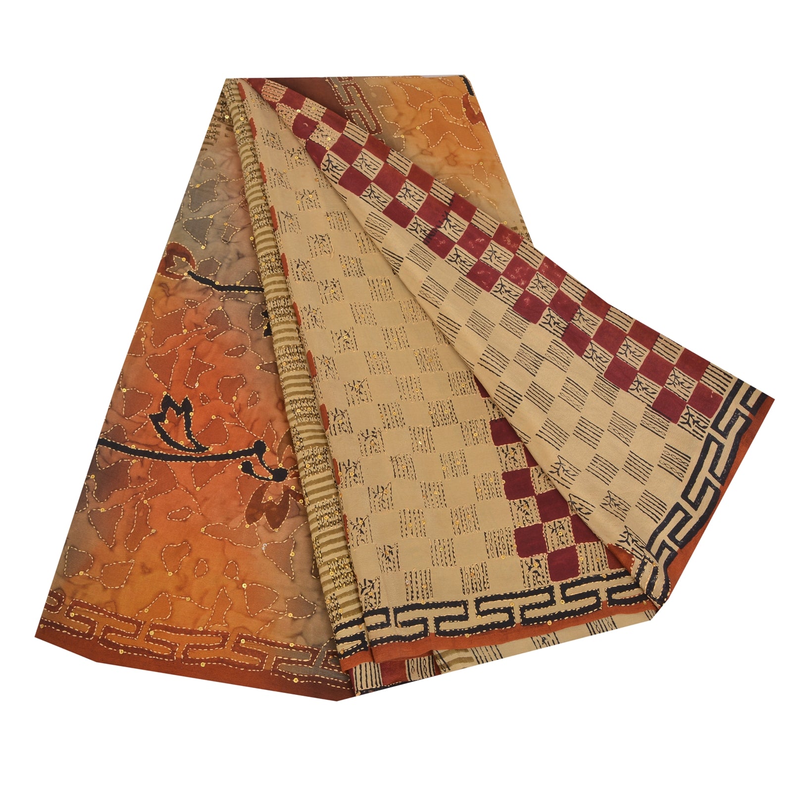 Sanskriti Vintage Sarees Pure Crepe Hand Beaded Kantha Printed Sari 5yd Sustainable Fabric