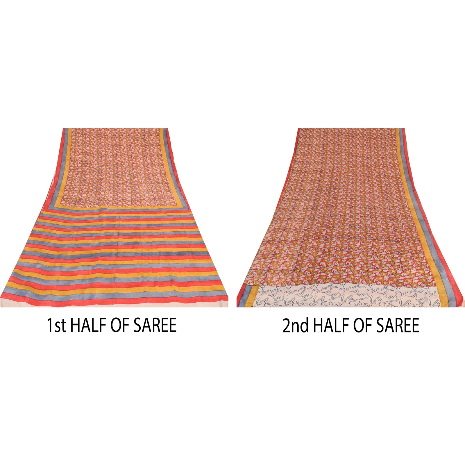 Sanskriti Vintage Sarees Red 100% Pure Crepe Silk Printed Sari 5yd Craft Sustainable Fabric