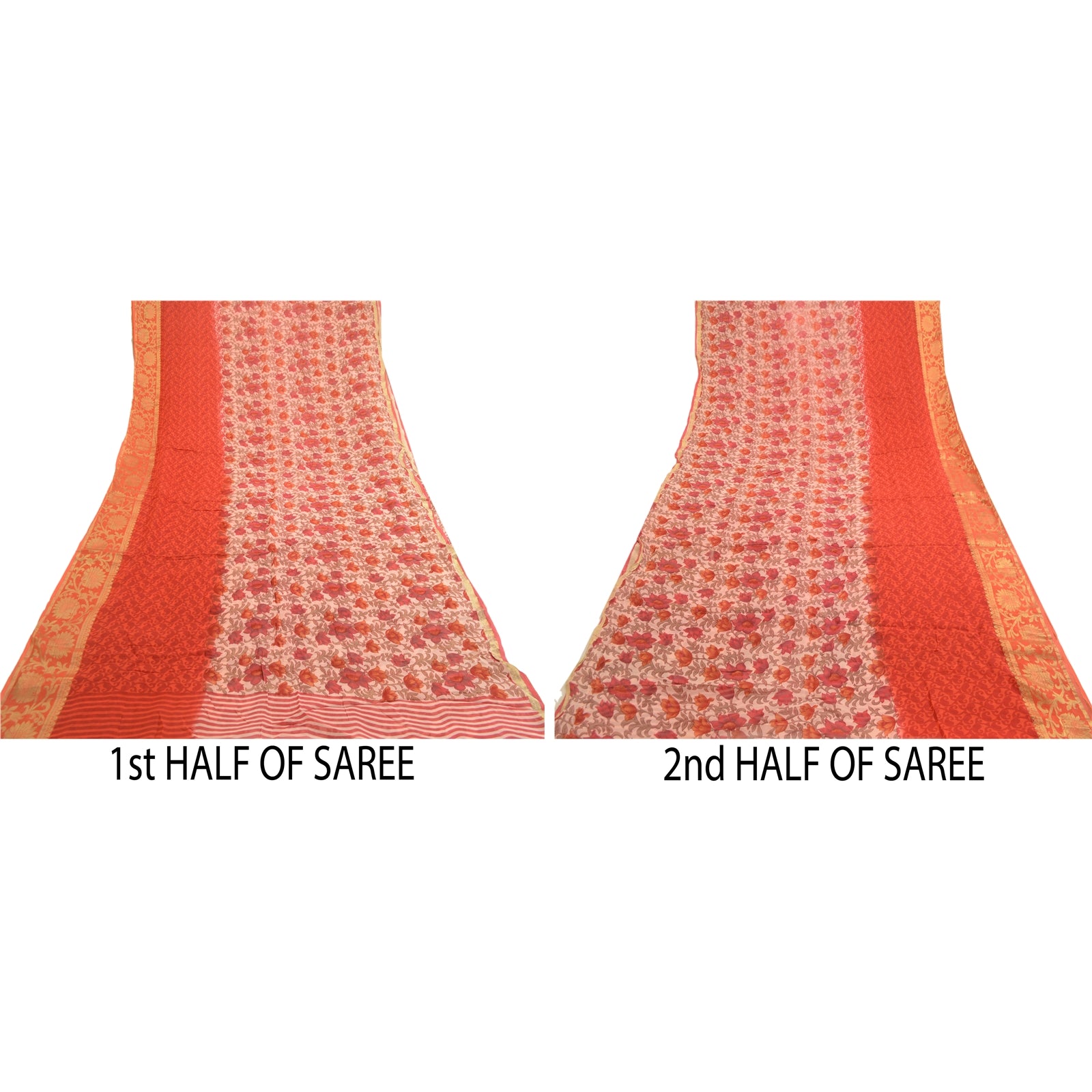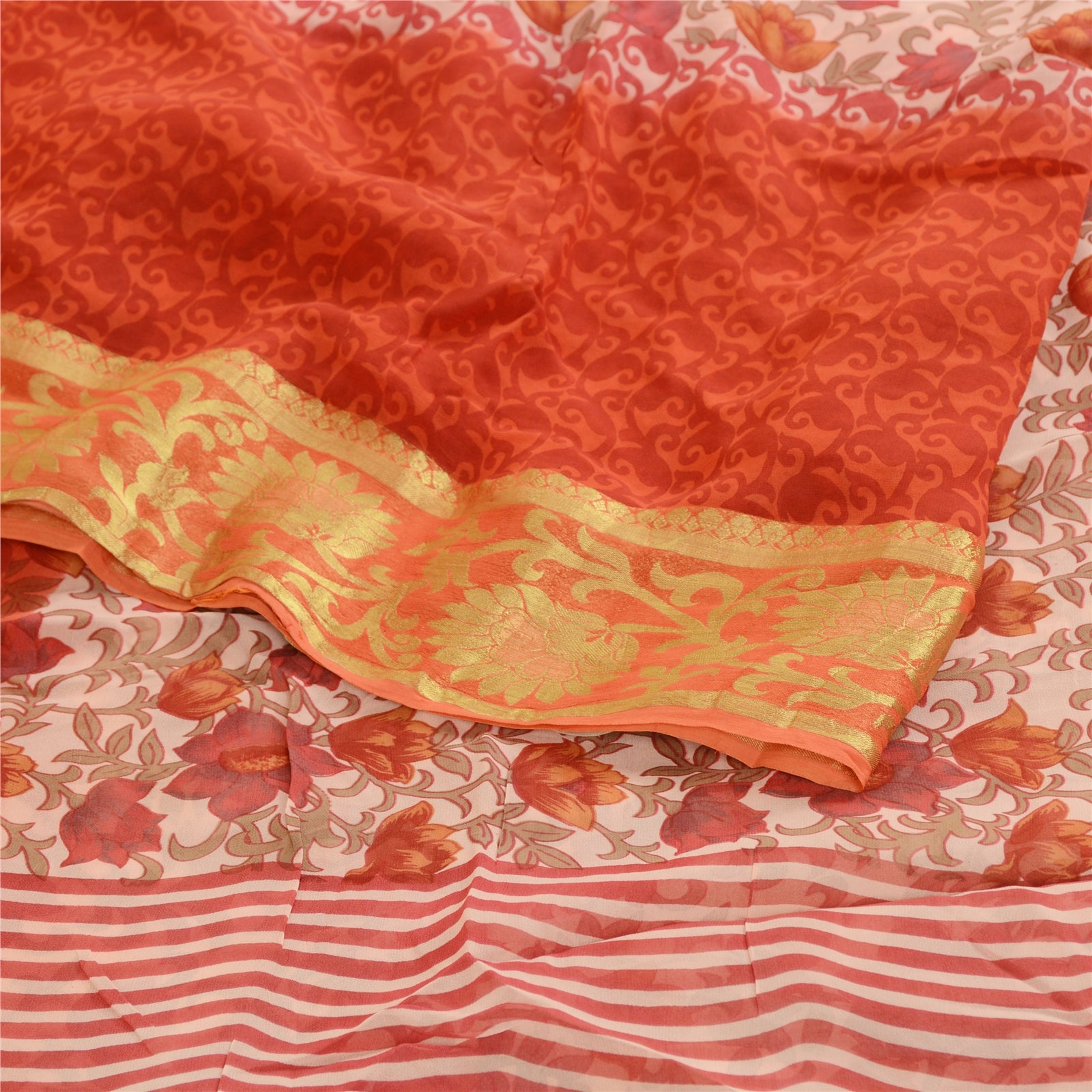 Sanskriti Vintage Sarees Red Blend Georgette Printed Zari Border Sari 5yd Sustainable Fabric