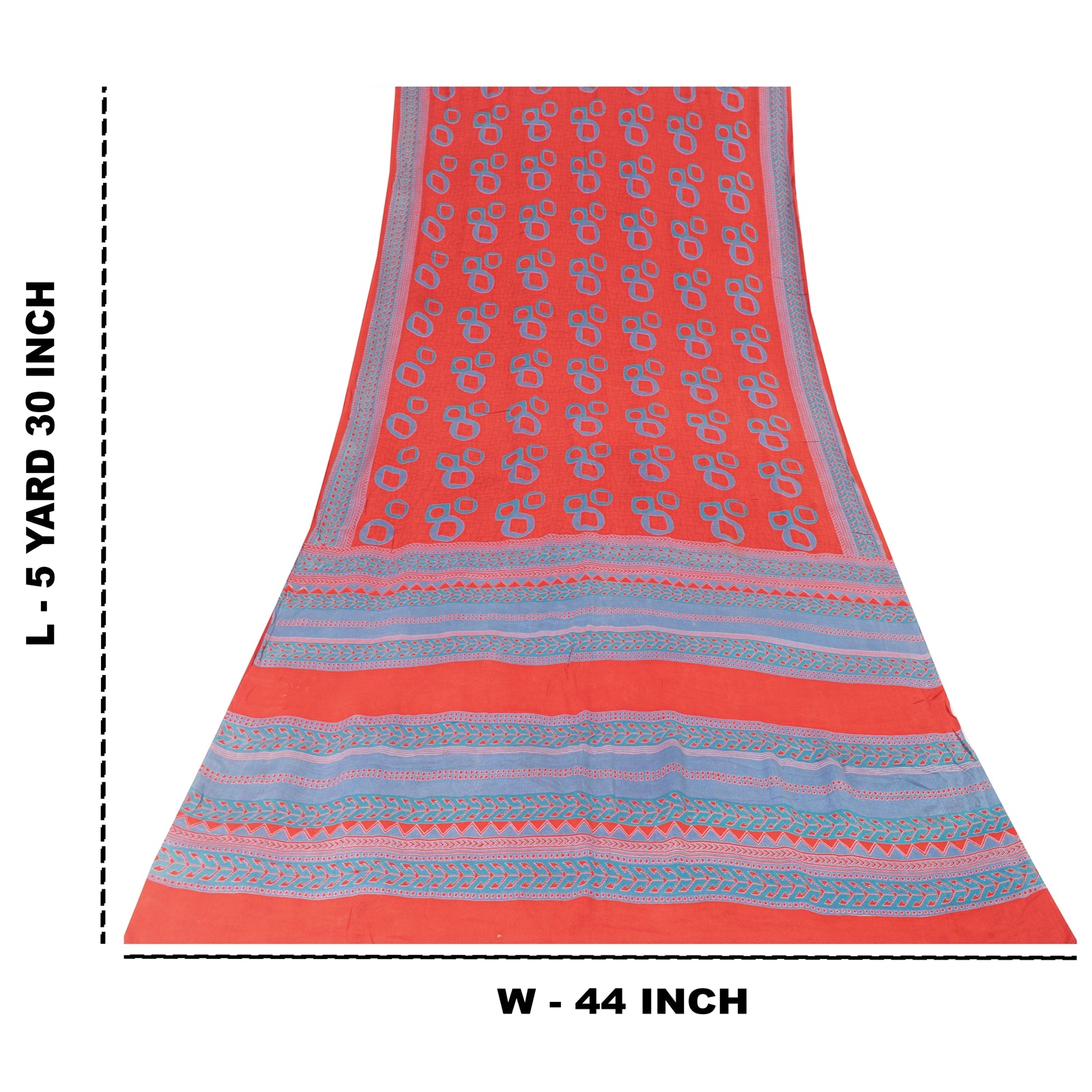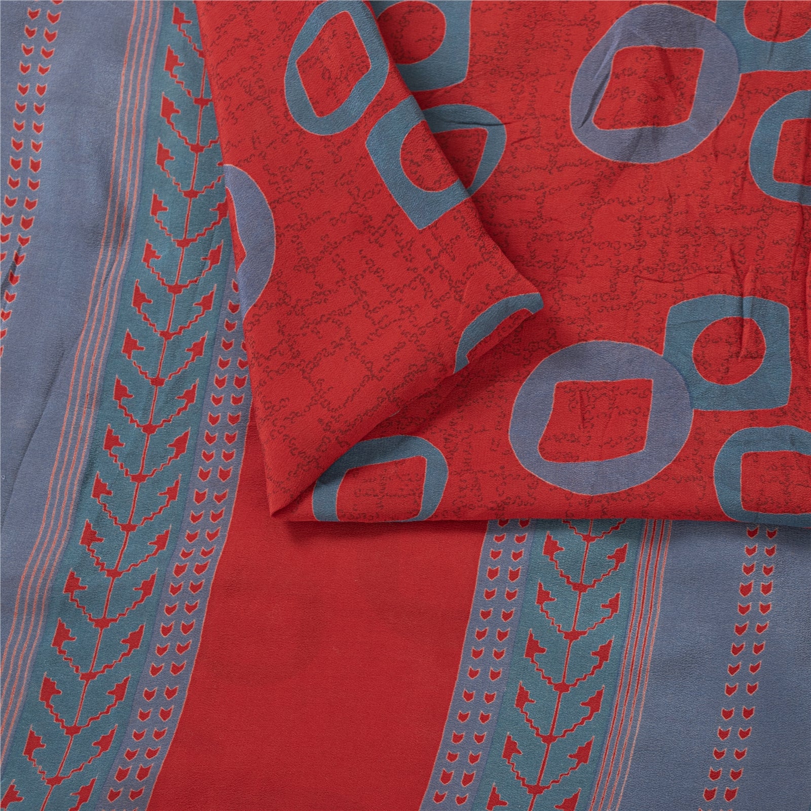 Sanskriti Vintage Sarees Red & Blue Pure Crepe Printed Sari 5+yd Craft Fabric
