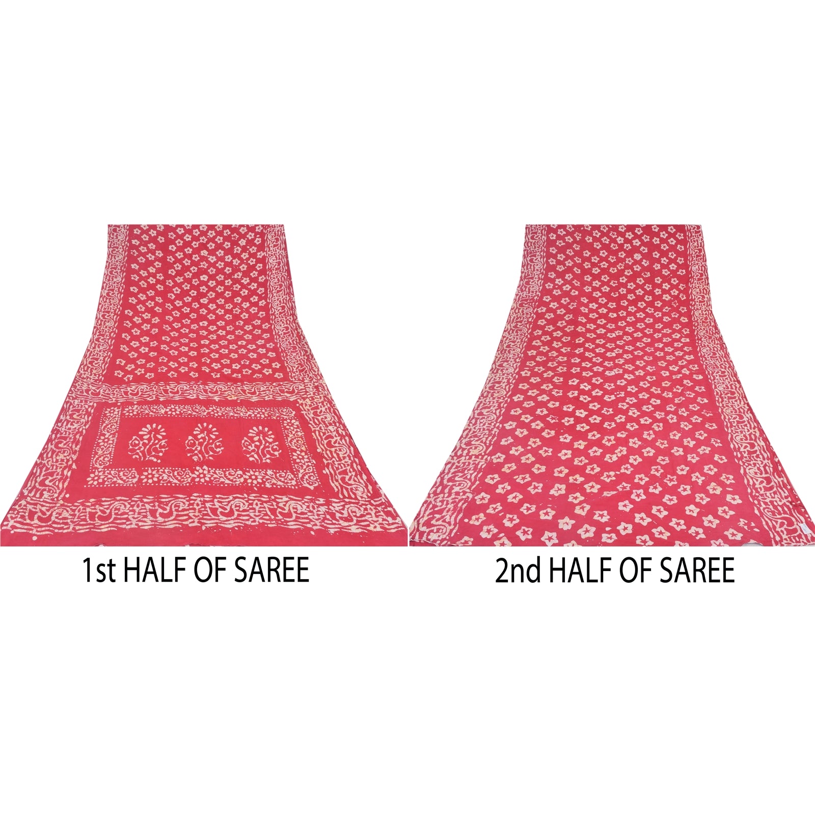 THE ITEM COLOR OR SHADE MAY BE DARKER OR LIGHTER THAN THE PICTURE. Attractive red colored pure cotton batik work sari. Pallu & Border has floral design with batik work. Similar design in center part of saree.. This unique vintage saree can be used for various crafting ideas even if you don't want to use it as a sari. Design a dress, use it as a as window dressing, upholstery, sarongs, throw, dress making and table linen much more. Let your creative juices flow and use this decorated fabric in multiple fashion. Shipping Note: 'International buyers please note: Import duties, taxes, and charges are not included in the item price or postage cost. These charges are the buyer's responsibility. Please check with your country's customs office to determine what these additional costs will be prior to bidding or buying. Buyer will pay custom duty/tax. It is calculated and charged differently by every country. As a seller I do not have any control over it. VAT or sales tax is calculated by the platform at the time of checkout. Customs charge is payable at the time of delivery.' PCS-5666