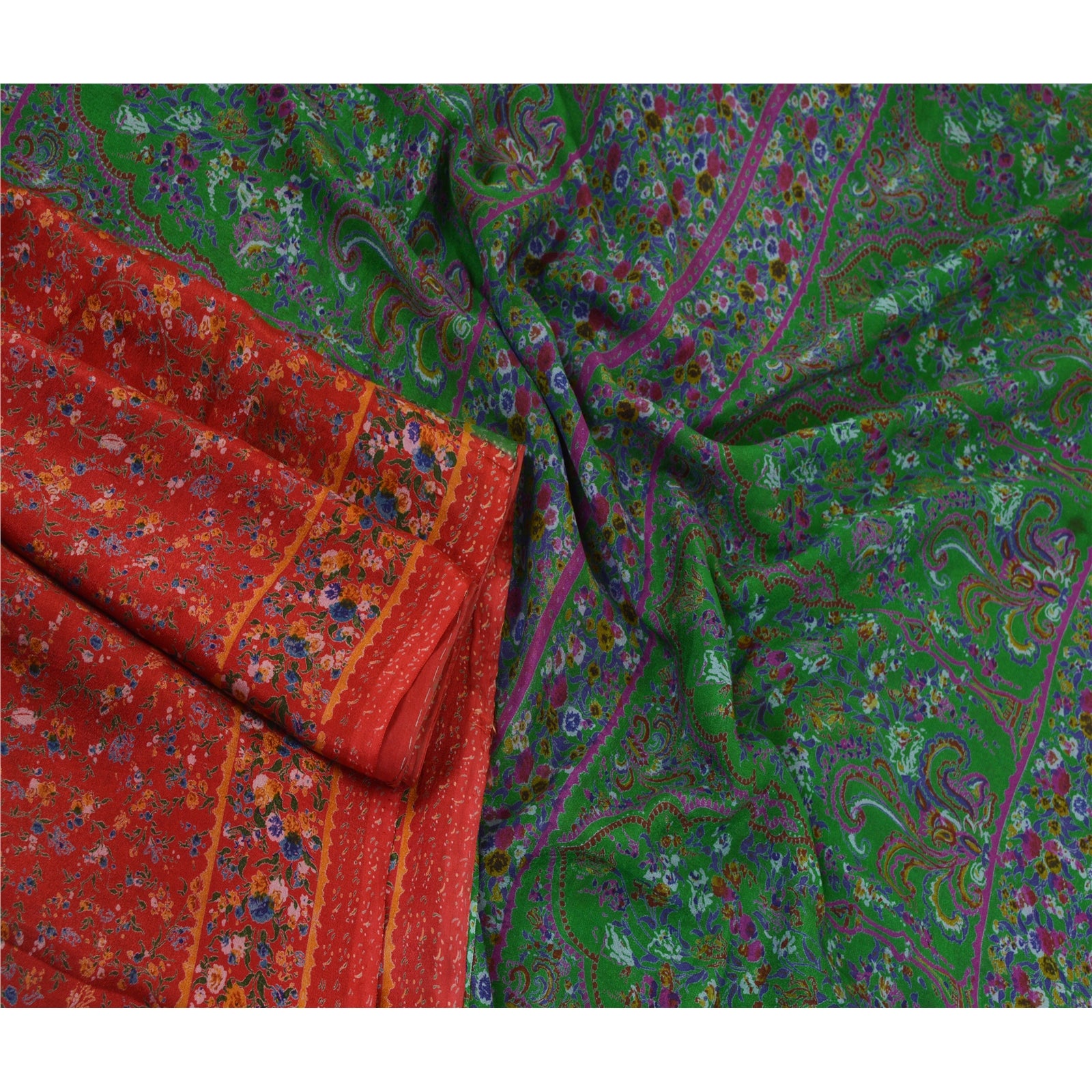 Sanskriti Vintage Sarees Red & Green 100% Pure Silk Printed Sari Craft Sustainable Fabric