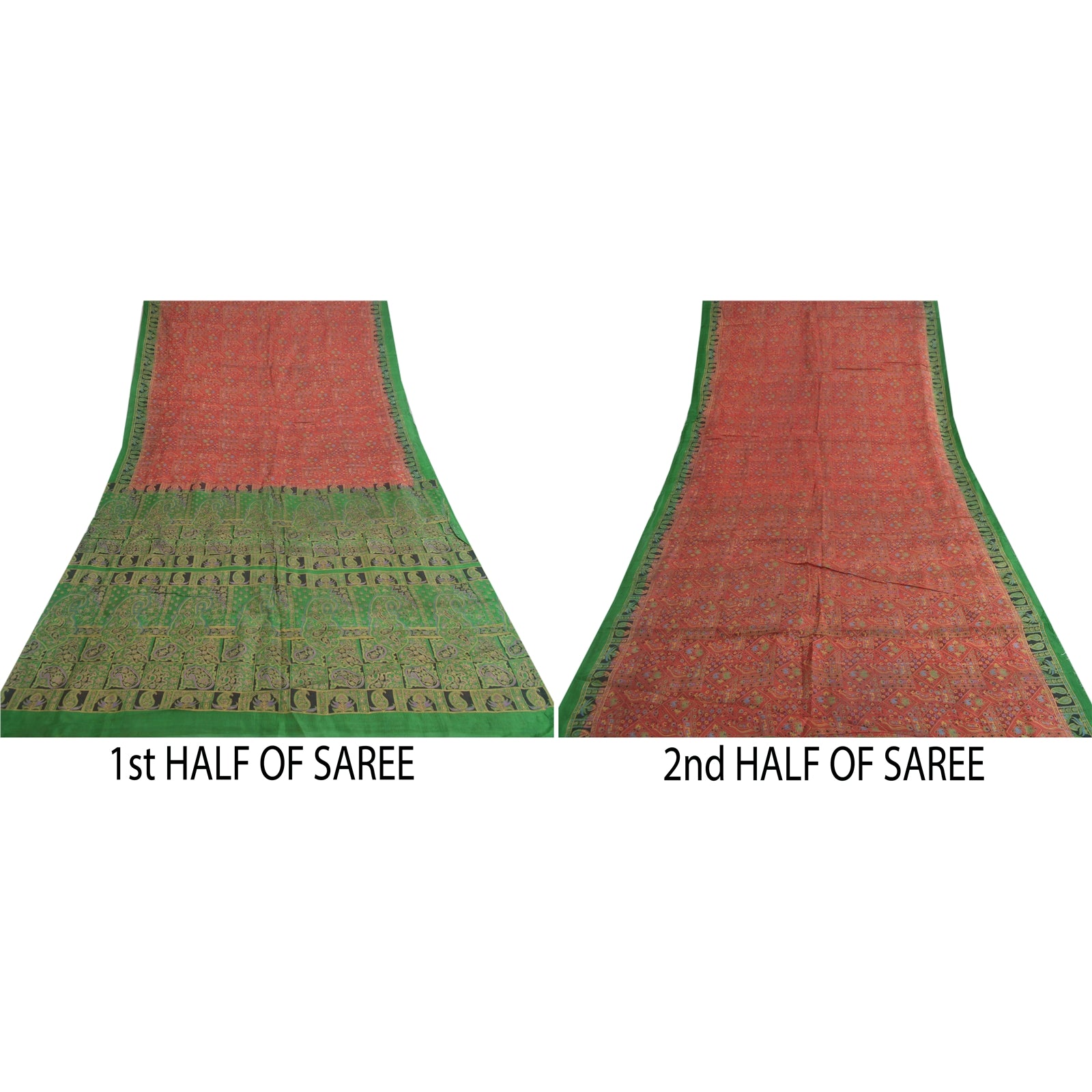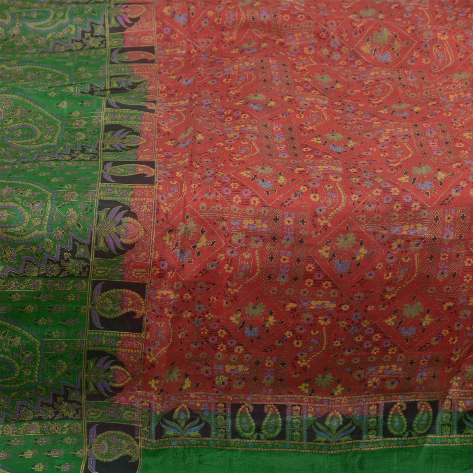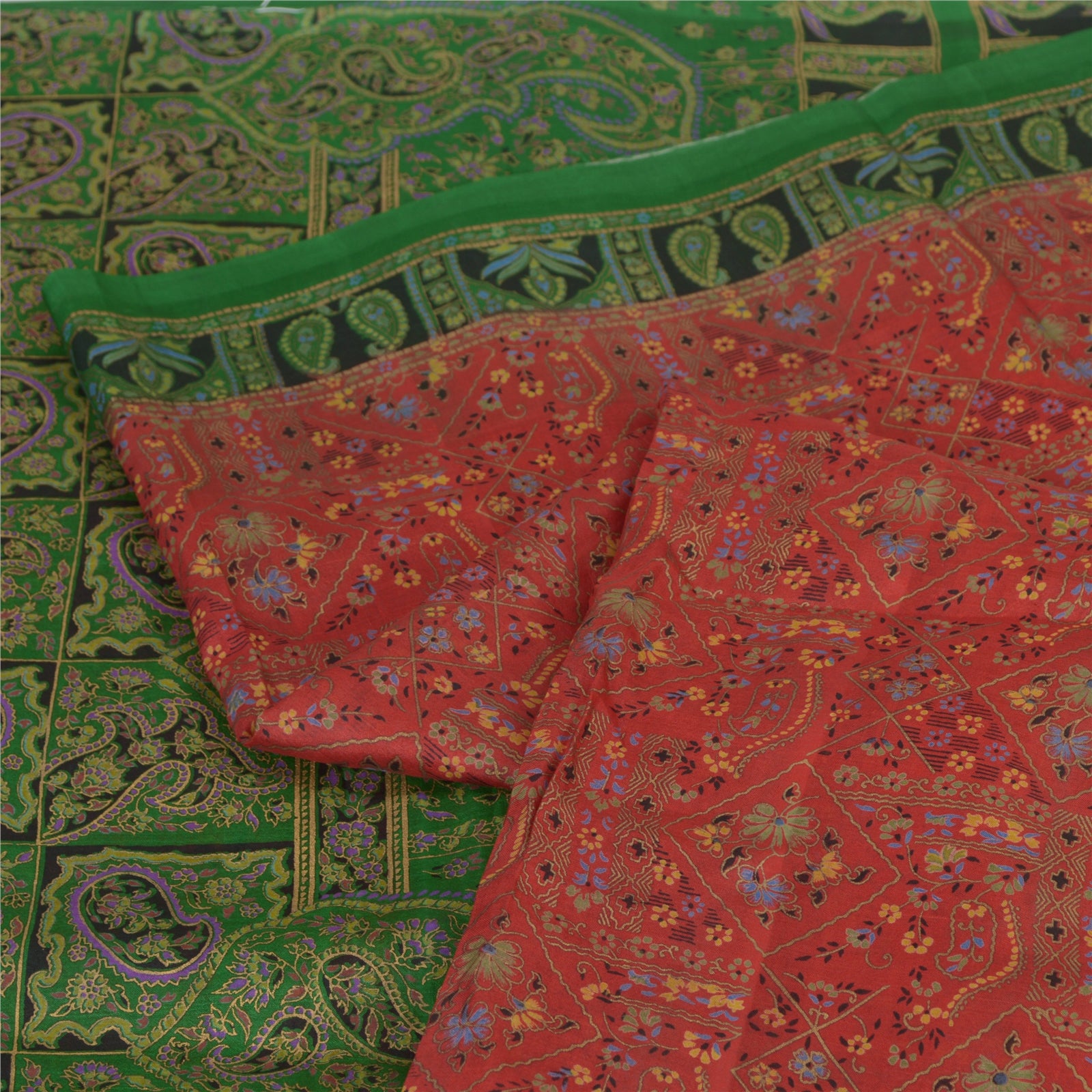 Sanskriti Vintage Sarees Red/Green Pure Silk Printed Sari Floral Craft Sustainable Fabric