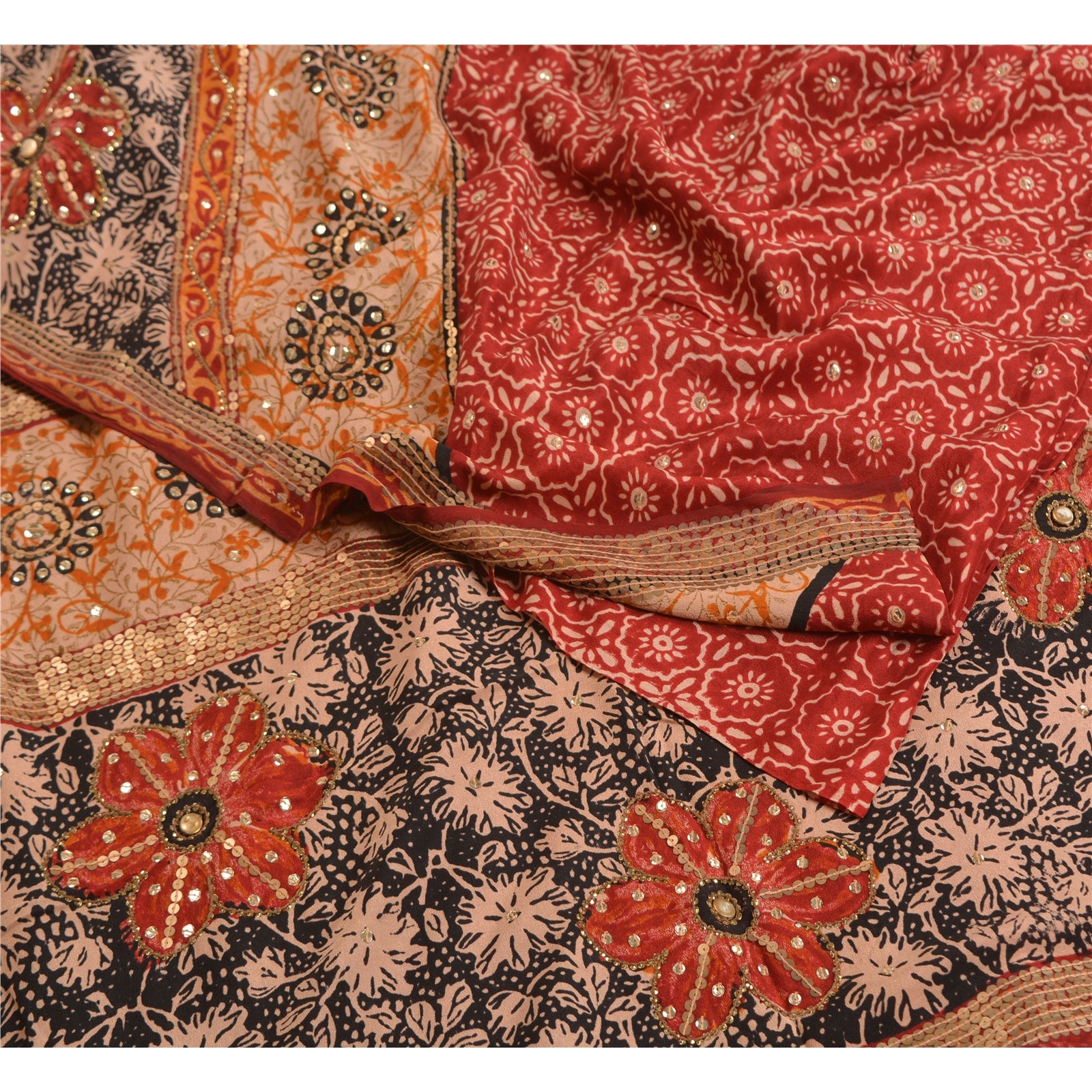 Sanskriti Vintage Sarees Red Hand Beaded Pure Crepe Silk Print Sari Craft Sustainable Fabric