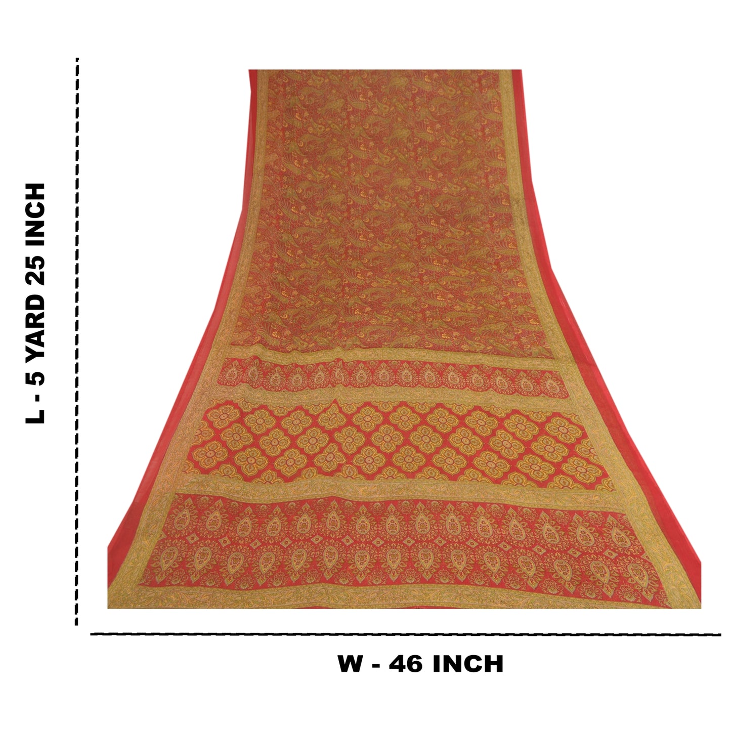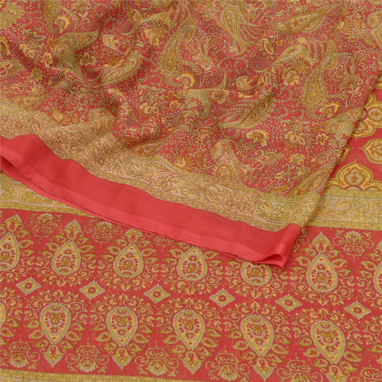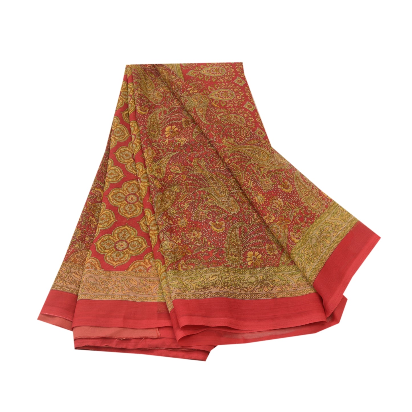 Amazing red colored georgette printed saree. Pallu & border has printed floral design. Floral design in center part of saree. What is special about this saree? Brilliant design on soft Sustainable Fabric is really enhancing the beauty of the saree.This unique vintage saree can be used for various crafting ideas even if you don't want to use it as a sari. Design a dress, use it as a as window dressing, upholstery, sarongs, throw, dress making and table linen much more. Let your creative juices flow and use this decorated Sustainable Fabric in multiple fashion.