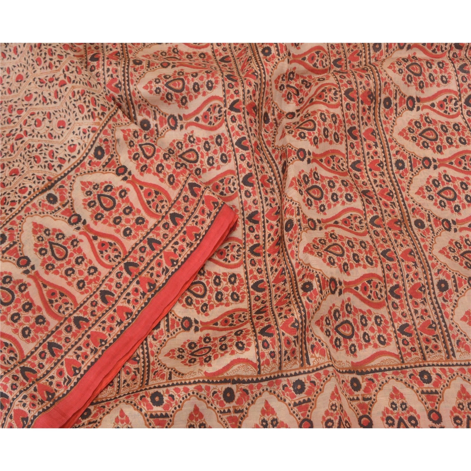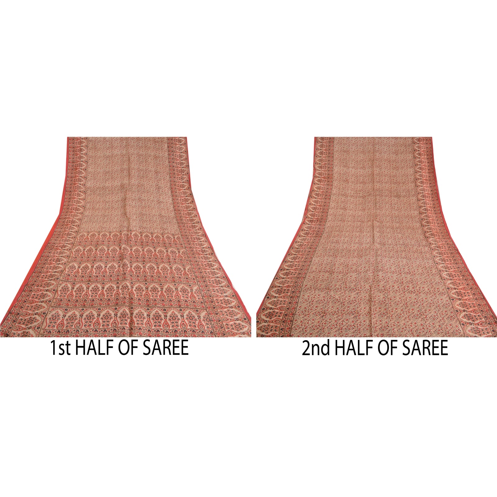 Beautiful red & cream colored pure silk printed saree. Pallu & border has printed floral design. Floral design in center part of saree. What is special about this saree? Fabulous design is really enhancing the beauty of the saree.This unique vintage saree can be used for various crafting ideas even if you don't want to use it as a sari. Design a dress, use it as window,dressing, upholstery, sarongs, throw, dress making and table linen much more. Let your creative juices flow and use this decorated Sustainable Fabric in multiple fashion.