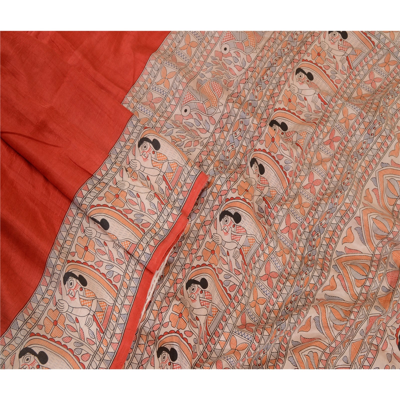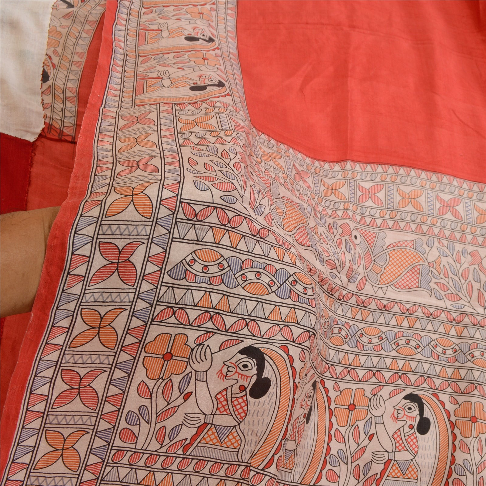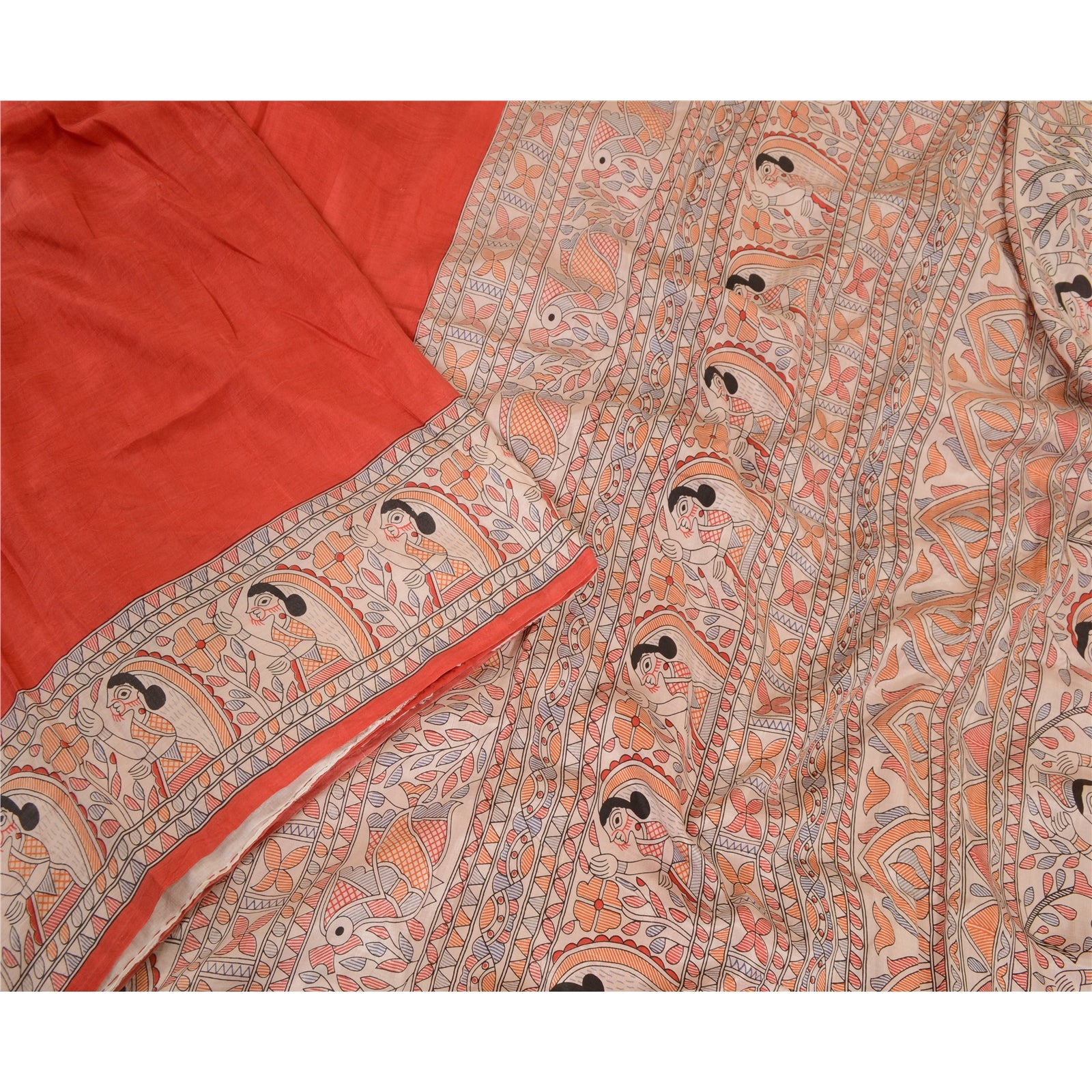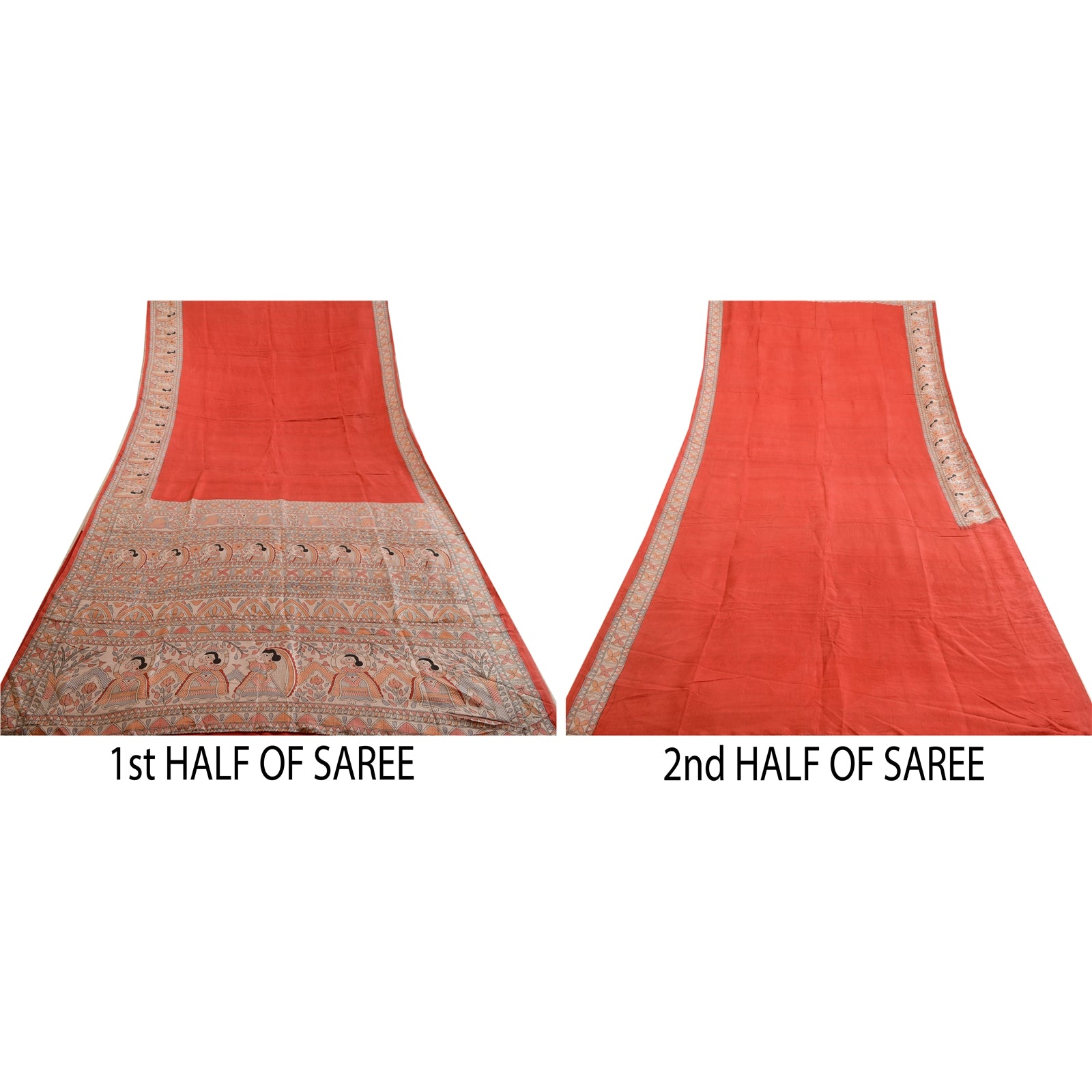 Sanskriti Vintage Sarees Red Kalamkari Women Pure Silk Printed Sari Craft Sustainable Fabric