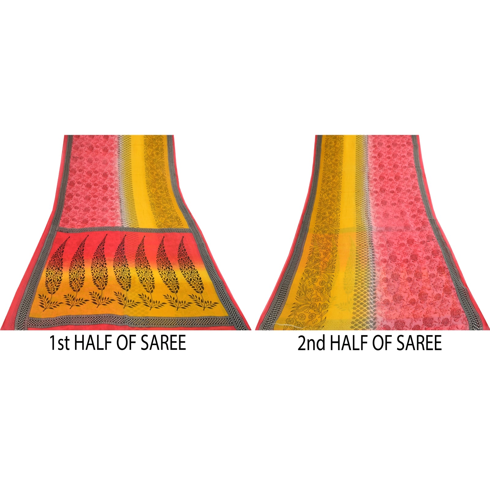 Sanskriti Vintage Sarees Red & Yellow Pure Cotton Printed Sari 5+yd Craft Fabric