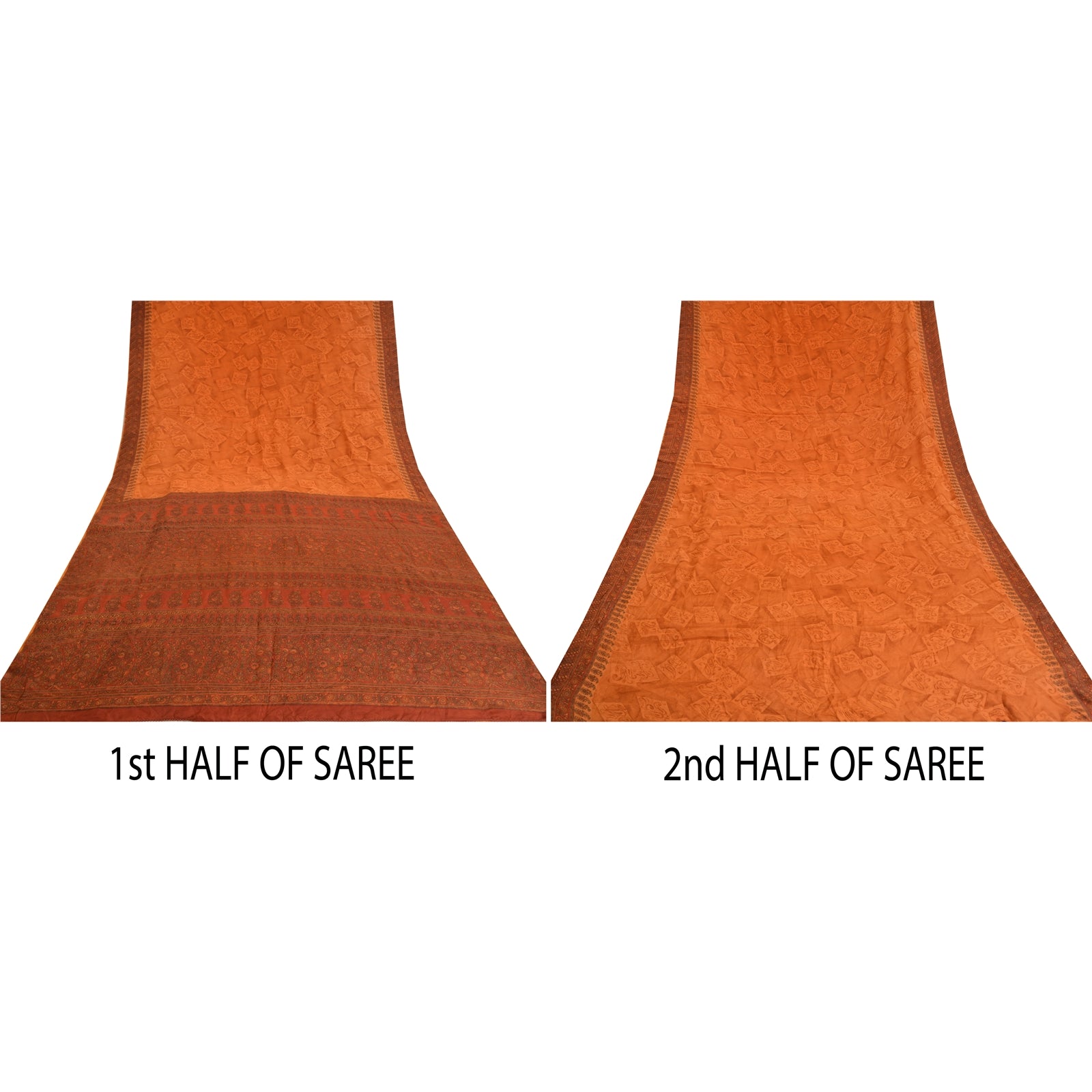 Sanskriti Vintage Sarees Saffron/Orange Pure Crepe Silk Print Sari Craft Sustainable Fabric