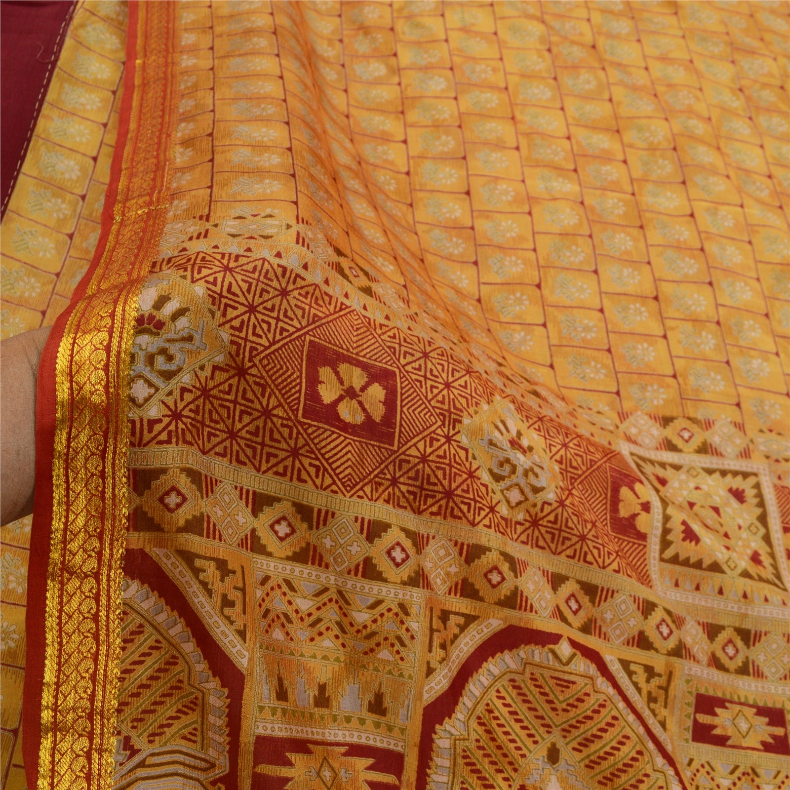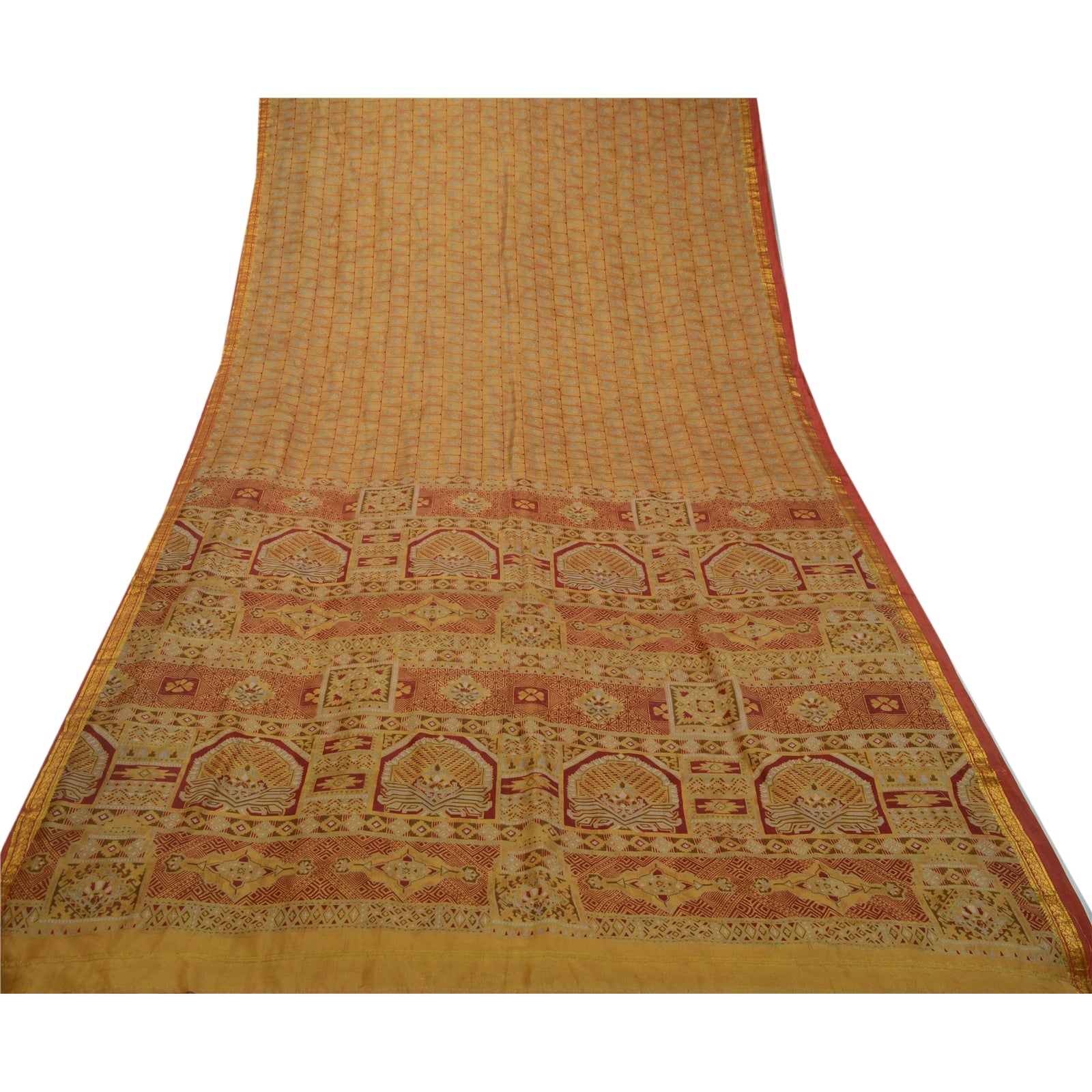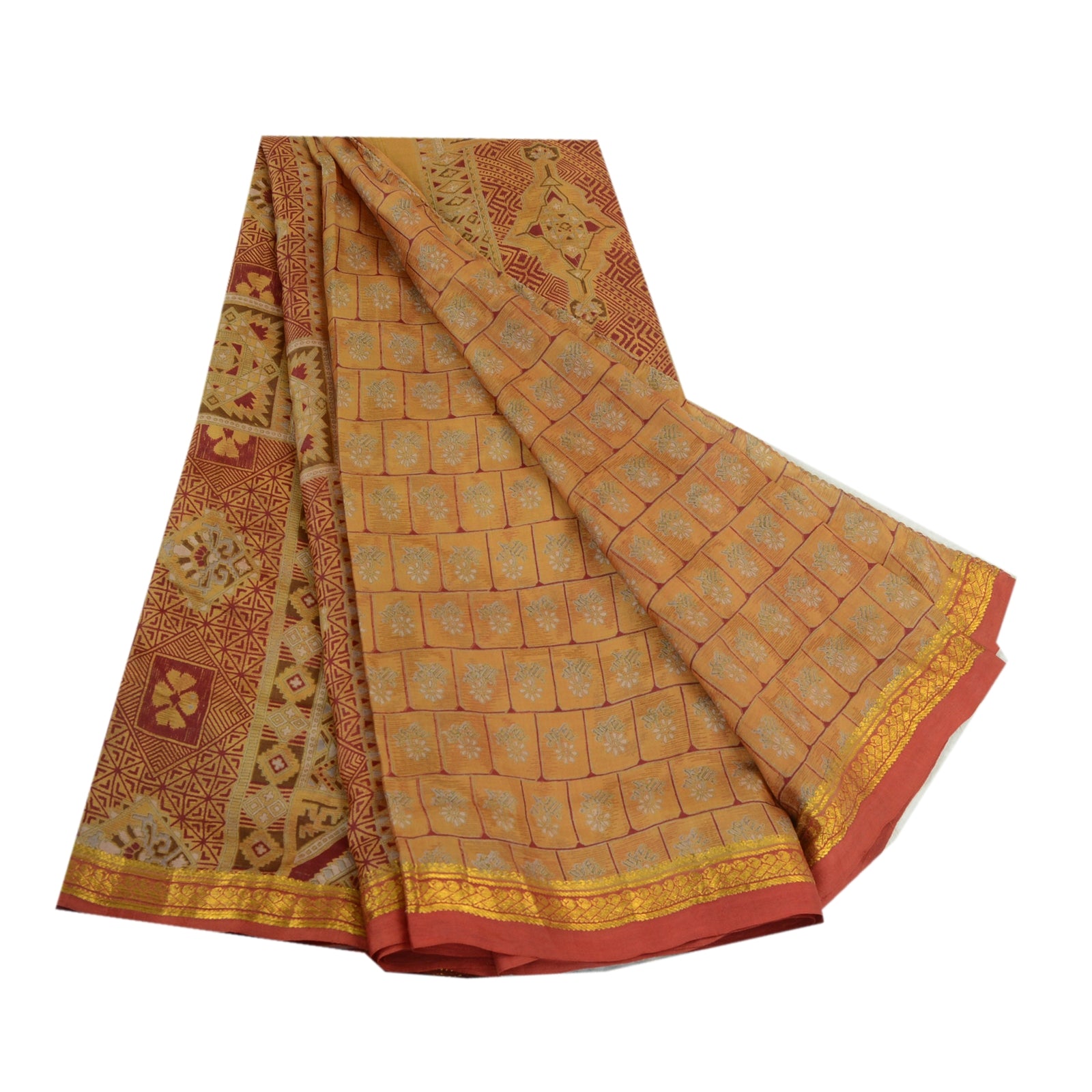 Sanskriti Vintage Sarees Saffron Zari Border Pure Silk Printed Sari Craft Sustainable Fabric