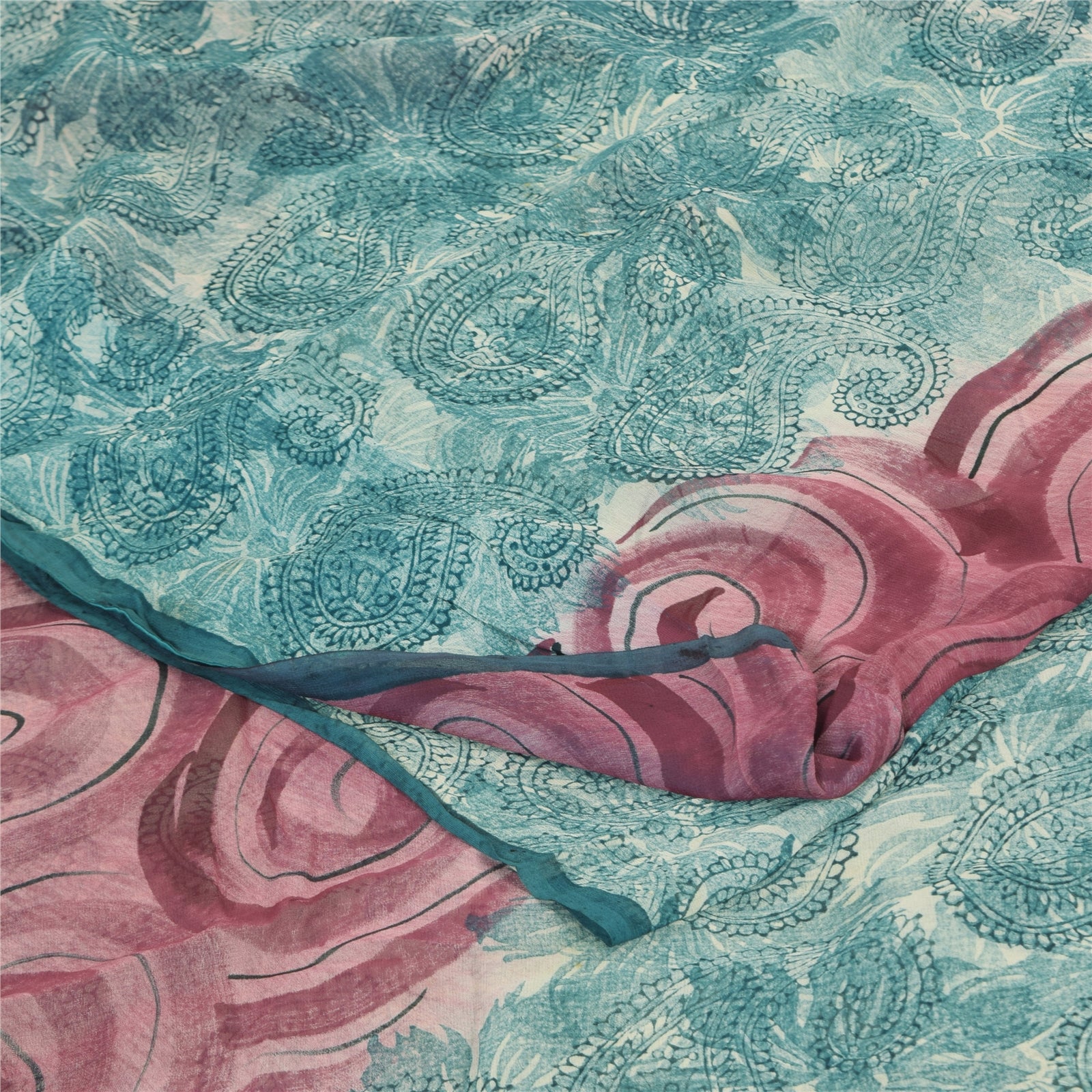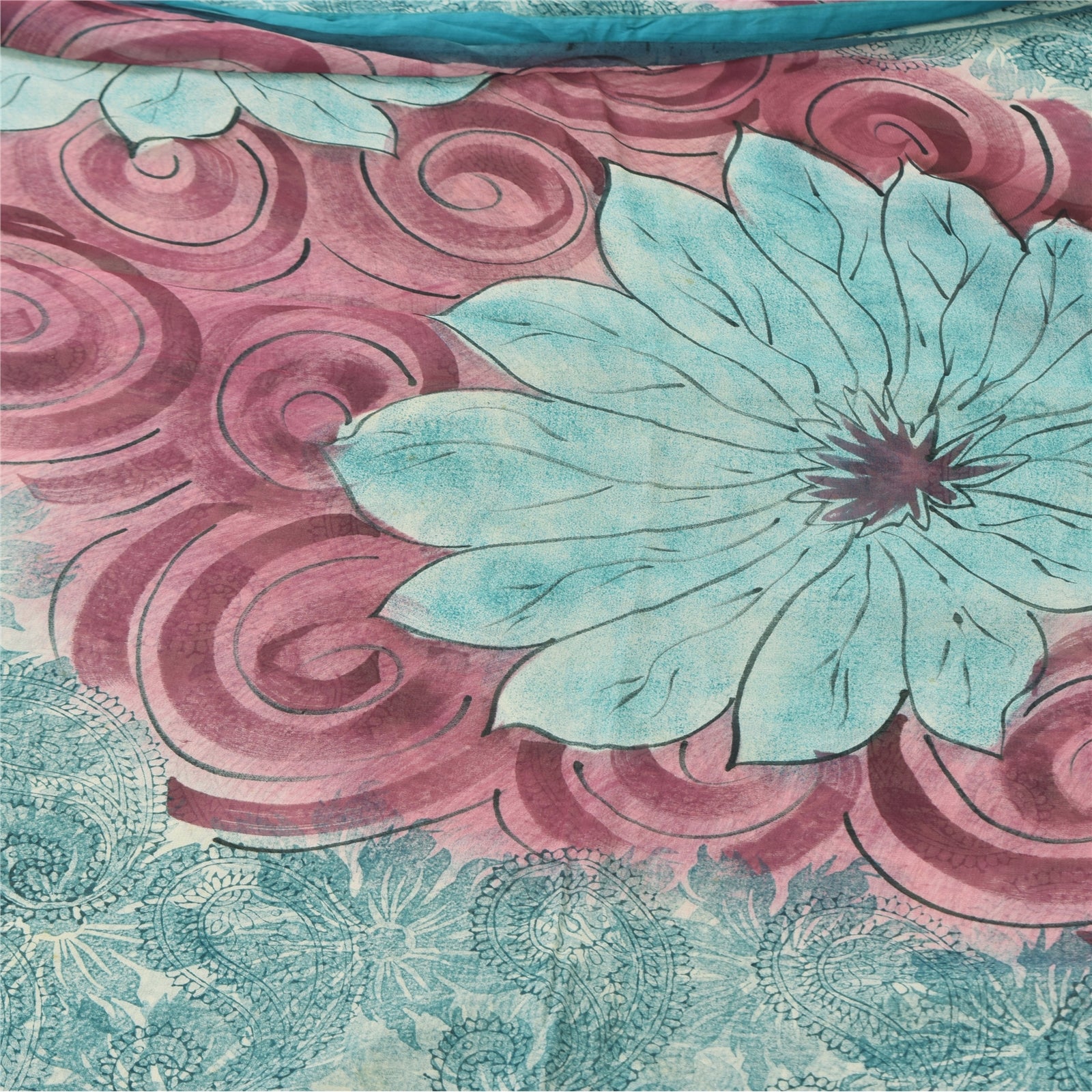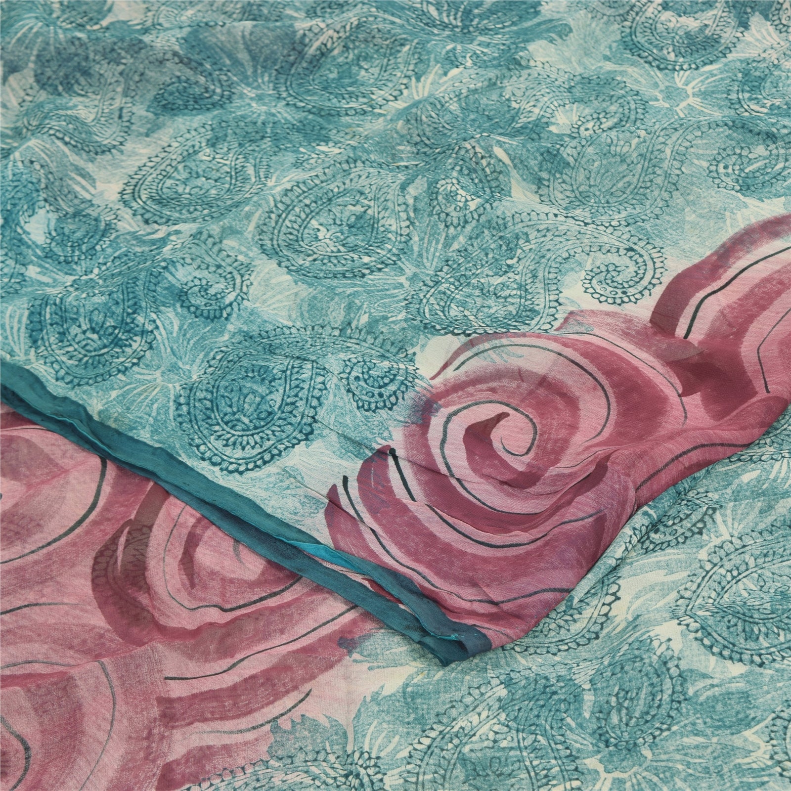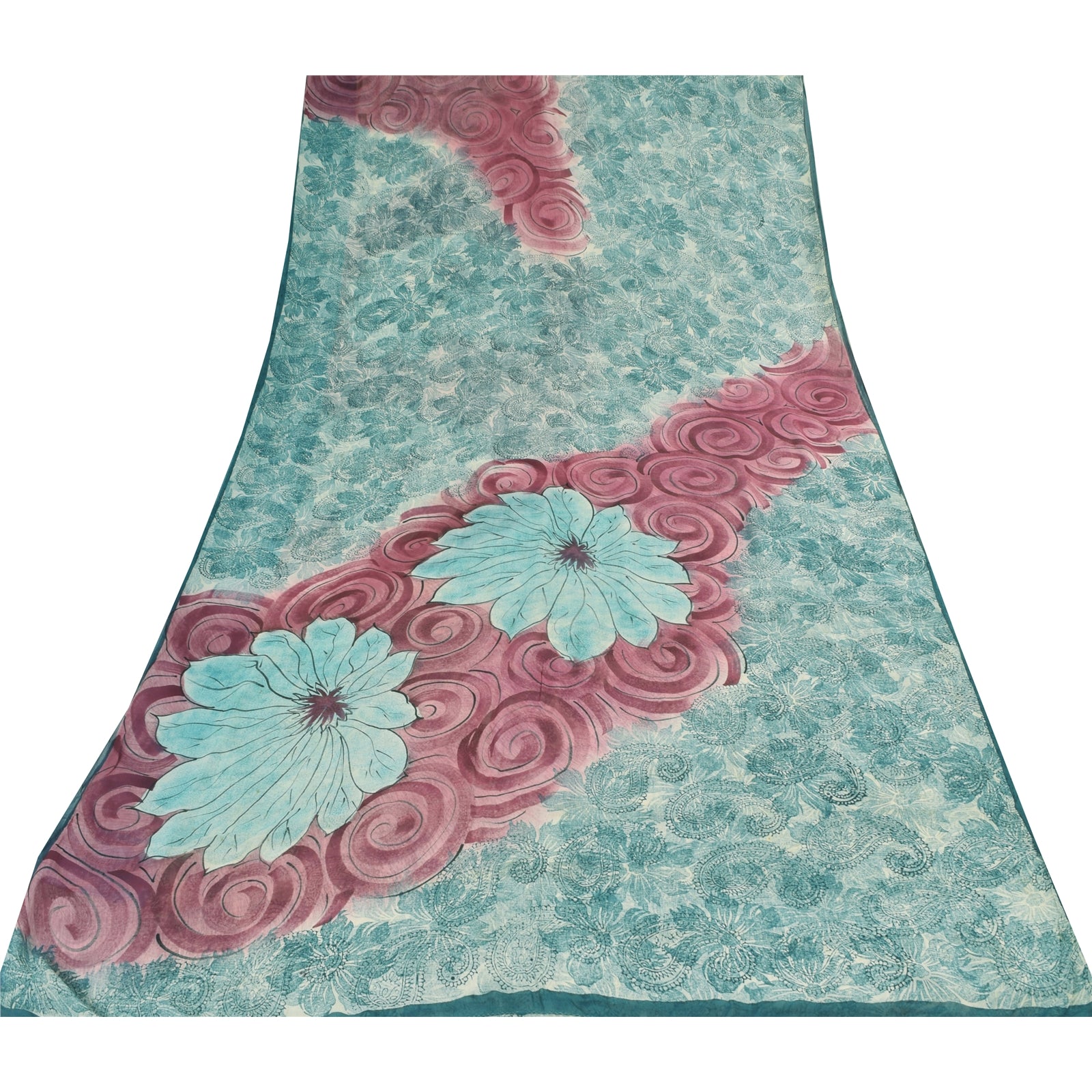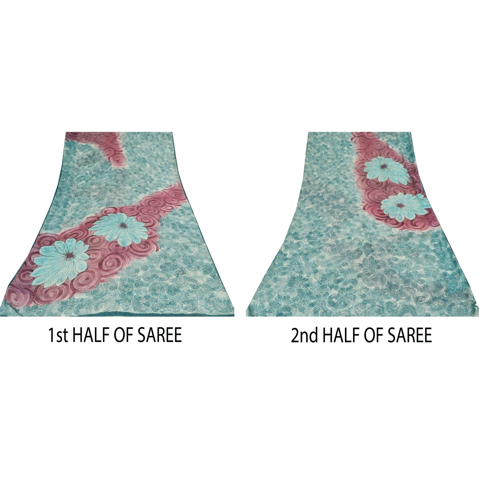 Sanskriti Vintage Sarees Sea-Blue Pure Georgette Silk Printed Sari Craft Sustainable Fabric