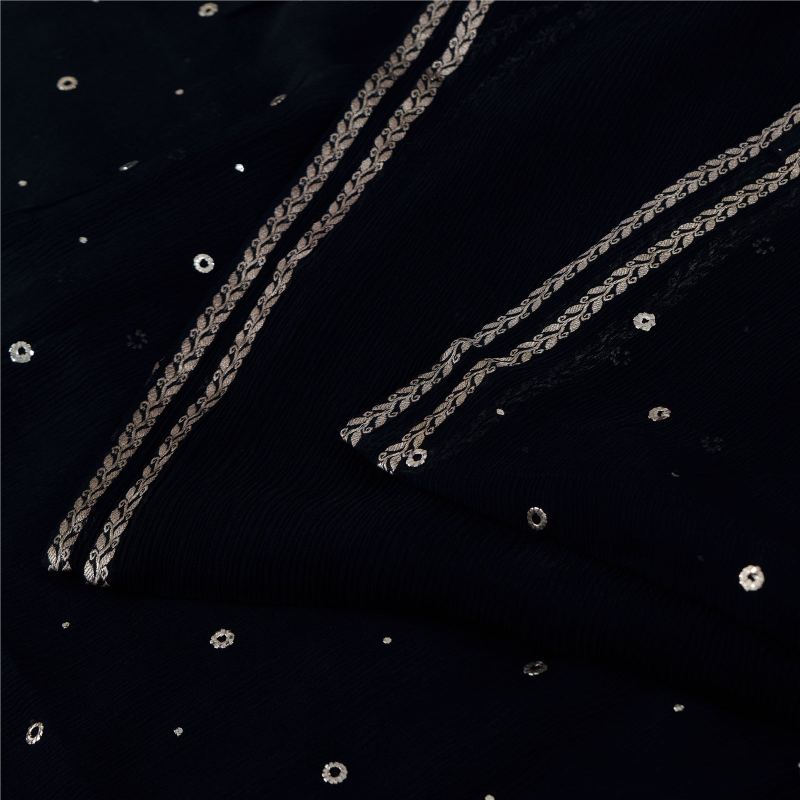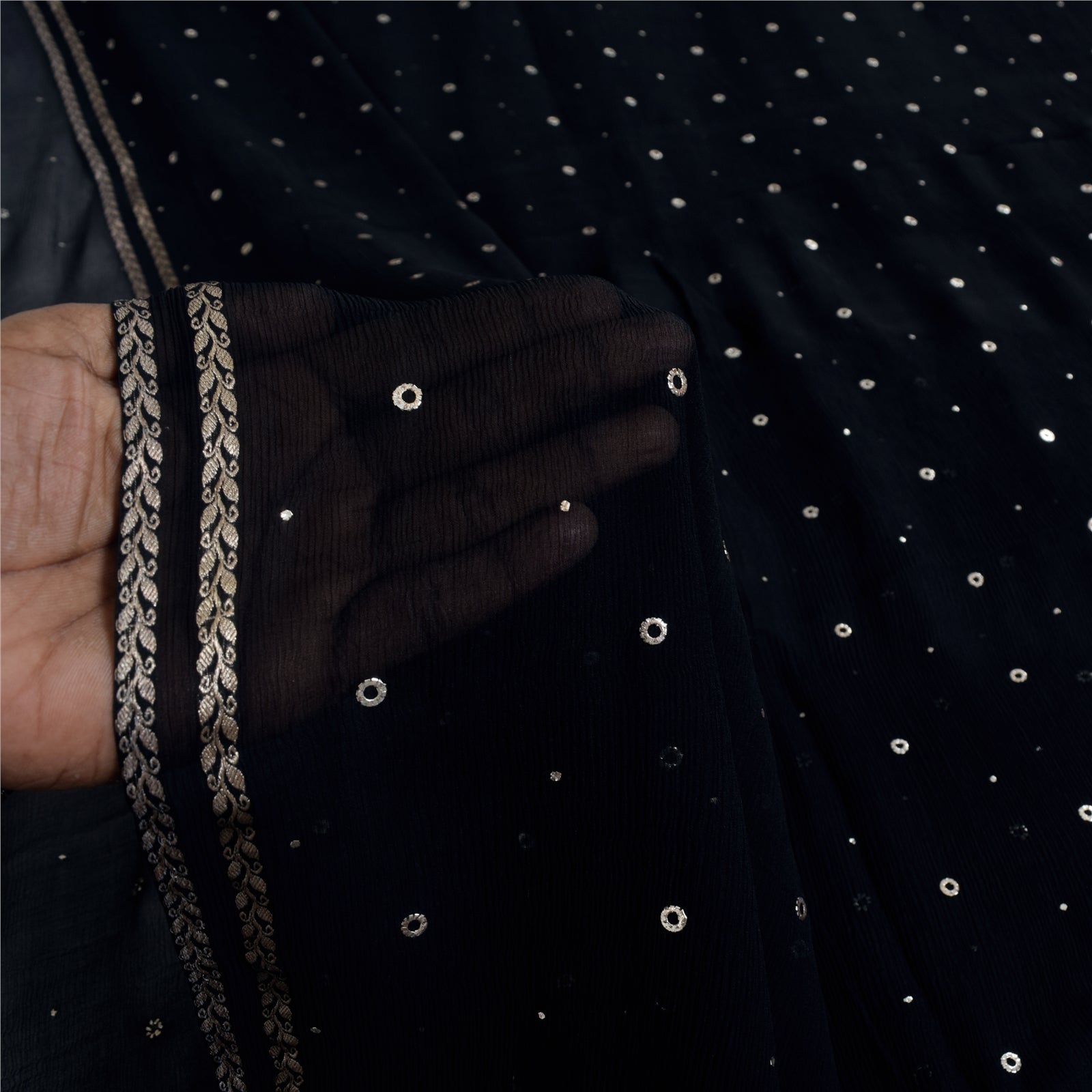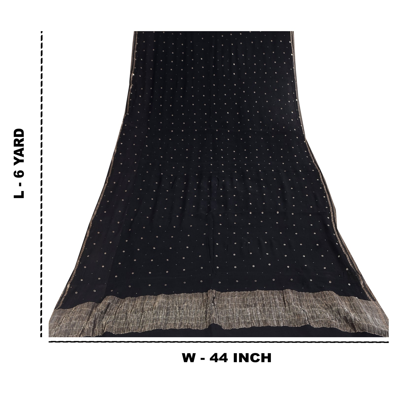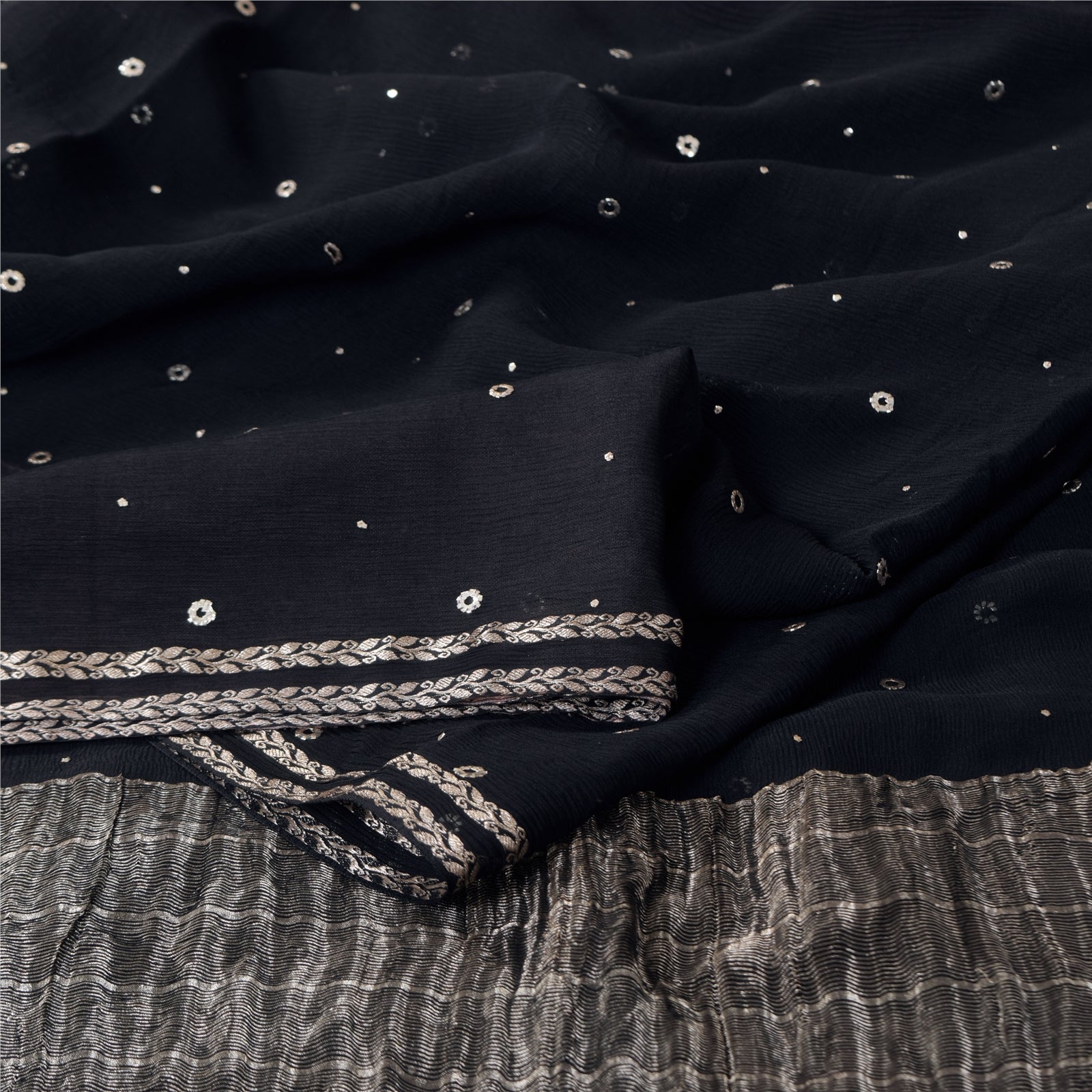 THE ITEM COLOR OR SHADE MAY BE DARKER OR LIGHTER THAN THE PICTURE.' Gorgeous black colored saree which is crafted with 100% Pure Chiffon Silk. The pallu & border sari features flower and paisley design embellished with mukeish work. The center part of sari boasts similar floral design with similar work. This heavy saree can be used for various crafting ideas too. Use it for dress designing, as a throw, as window dressing, upholstery, table linen and much more. Let your creative juices flow! Shipping note: International buyers please note: Import duties, taxes, and charges are not included in the item price or postage cost. These charges are the buyer's responsibility. Please check with your country's customs office to determine what these additional costs will be prior to bidding or buying. Buyer will pay custom duty/tax. It is calculated and charged differently by every country. As a seller I do not have any control over it. VAT or sales tax is calculated by the platform at the time of checkout. Customs charge is payable at the time of delivery. SKU: HS-7076