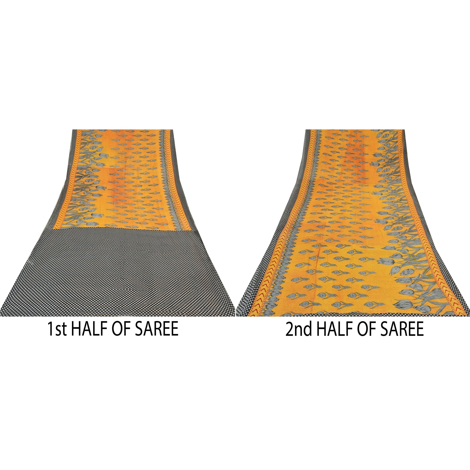 Sanskriti Vintage Sarees Yellow/Black Pure Cotton Printed Sari 5yd Craft Sustainable Fabric