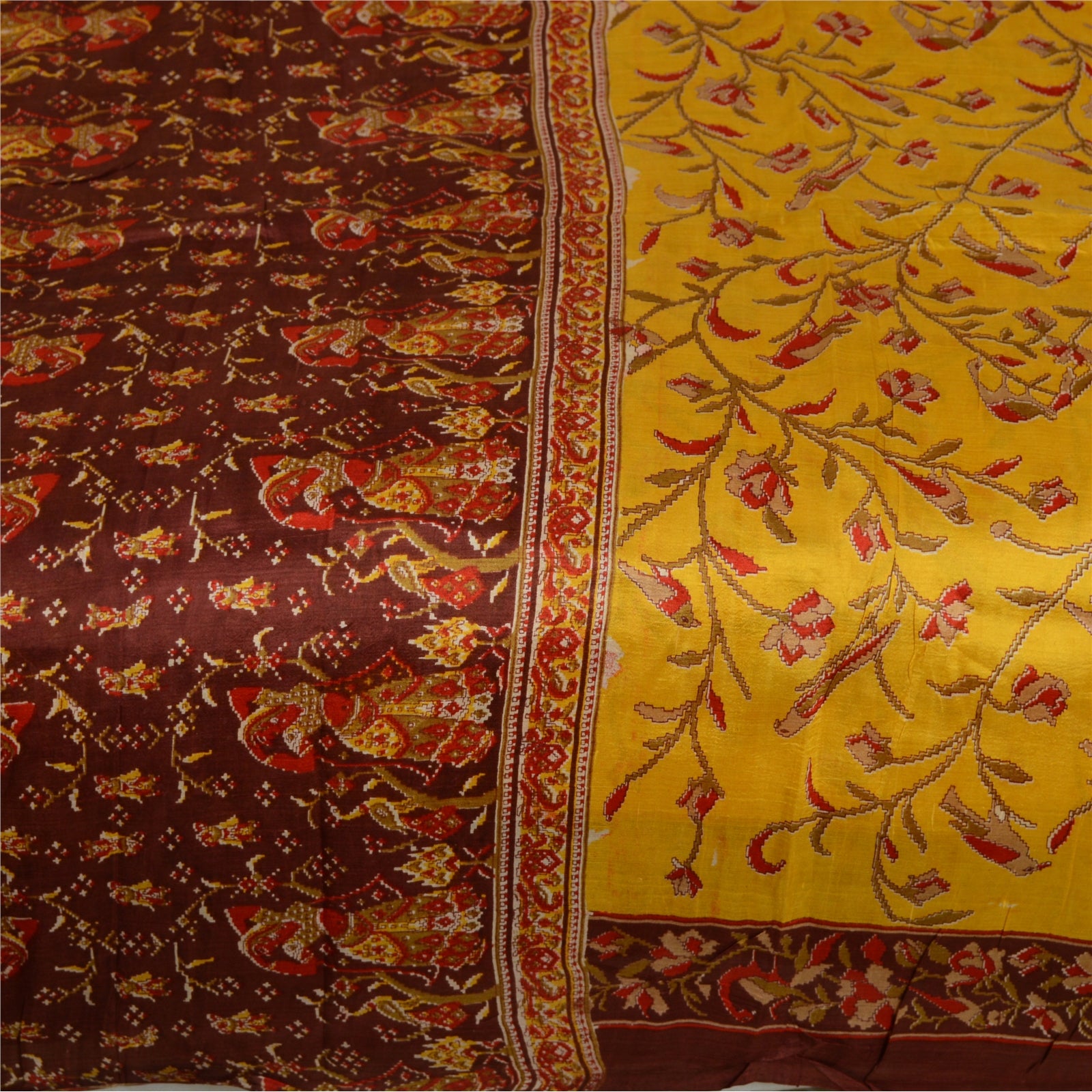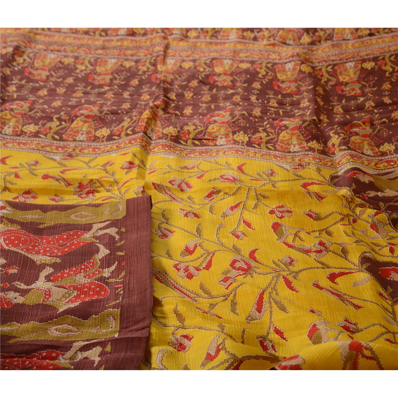 Sanskriti Vintage Sarees Yellow/Brown Women Printed Pure Silk Sari Craft Sustainable Fabric