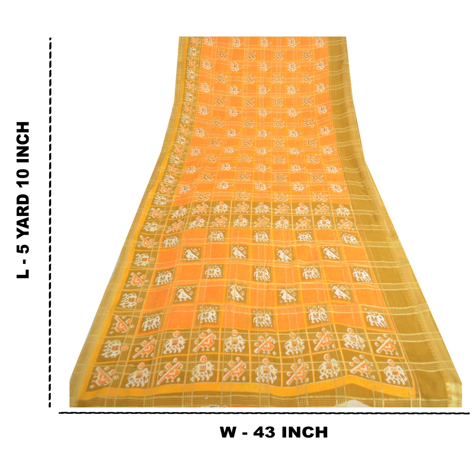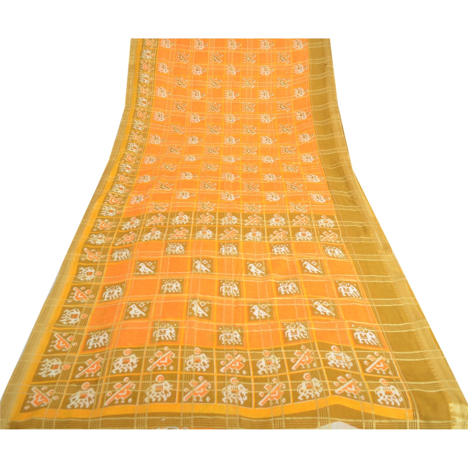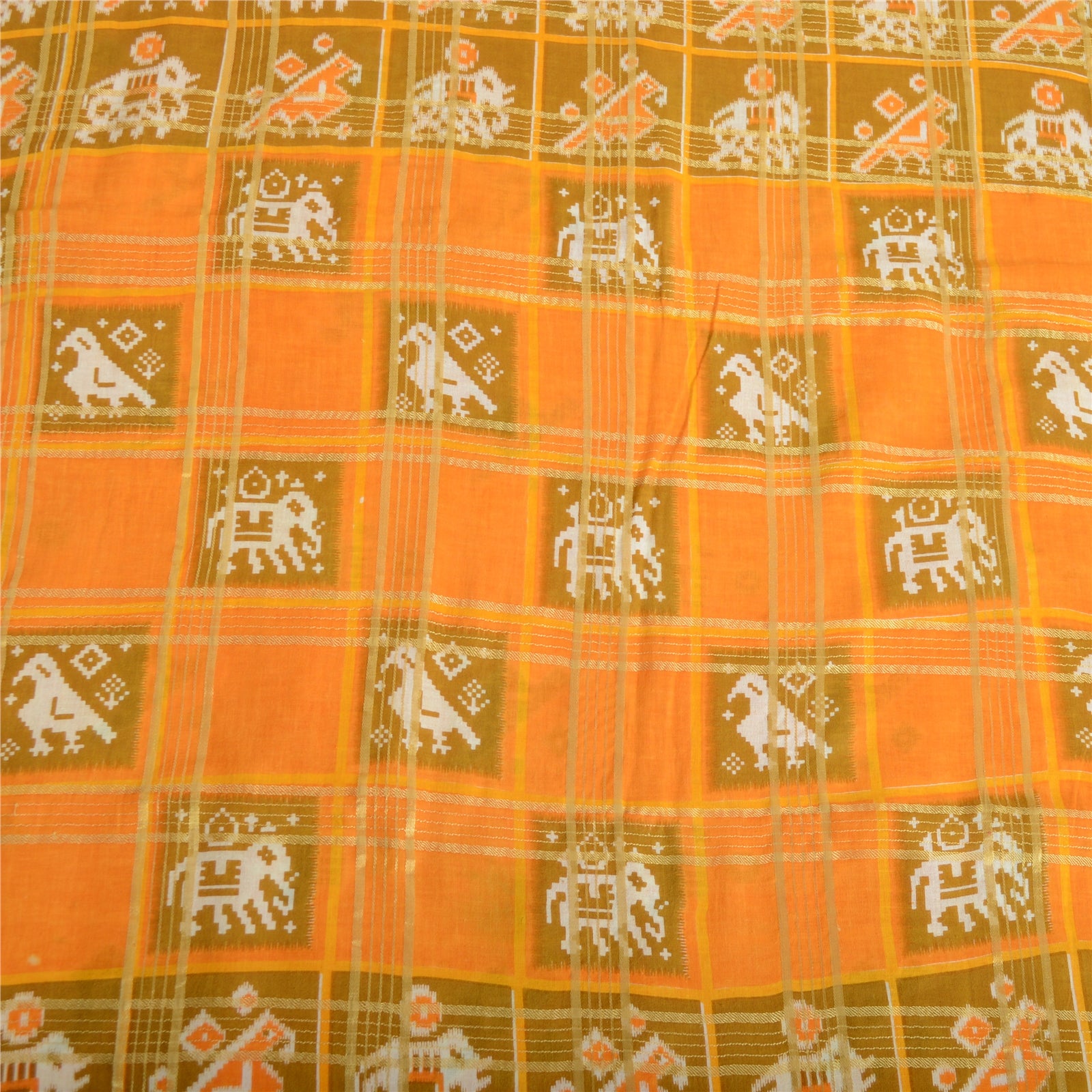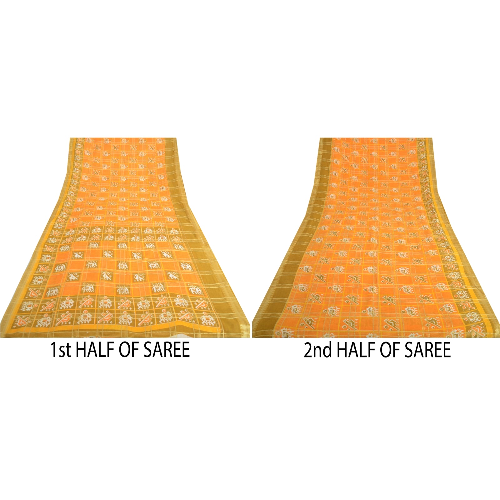 THE ITEM COLOR OR SHADE MAY BE DARKER OR LIGHTER THAN THE PICTURE. Attractive turmeric yellow colored pure cotton patan patola ikat printed sari. Pallu & Border has printed elephant & peacock design. Similar design in center part of saree.. Also you can see golden woven work with check lines design allover the saree. This unique vintage saree can be used for various crafting ideas even if you don't want to use it as a sari. Design a dress, use it as a as window dressing, upholstery, sarongs, throw, dress making and table linen much more. Let your creative juices flow and use this decorated Sustainable Fabric in multiple fashion. Shipping Note: 'International buyers please note: Import duties, taxes, and charges are not included in the item price or postage cost. These charges are the buyer's responsibility. Please check with your country's customs office to determine what these additional costs will be prior to bidding or buying. Buyer will pay custom duty/tax. It is calculated and charged differently by every country. As a seller I do not have any control over it. VAT or sales tax is calculated by the platform at the time of checkout. Customs charge is payable at the time of delivery.'