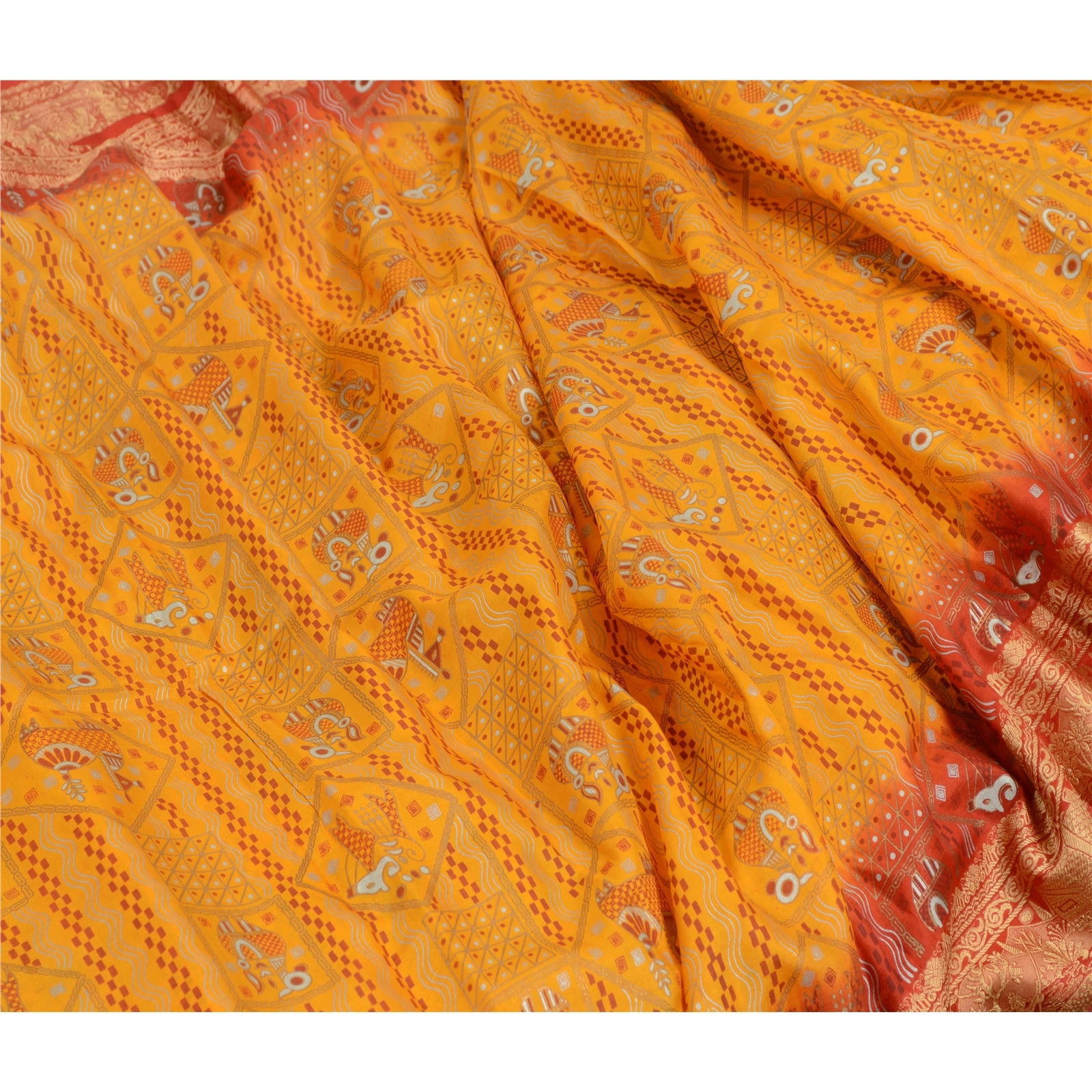 Sanskriti Vintage Sarees Yellow/Red Animal Human Print Pure Silk Sari 5yd Sustainable Fabric