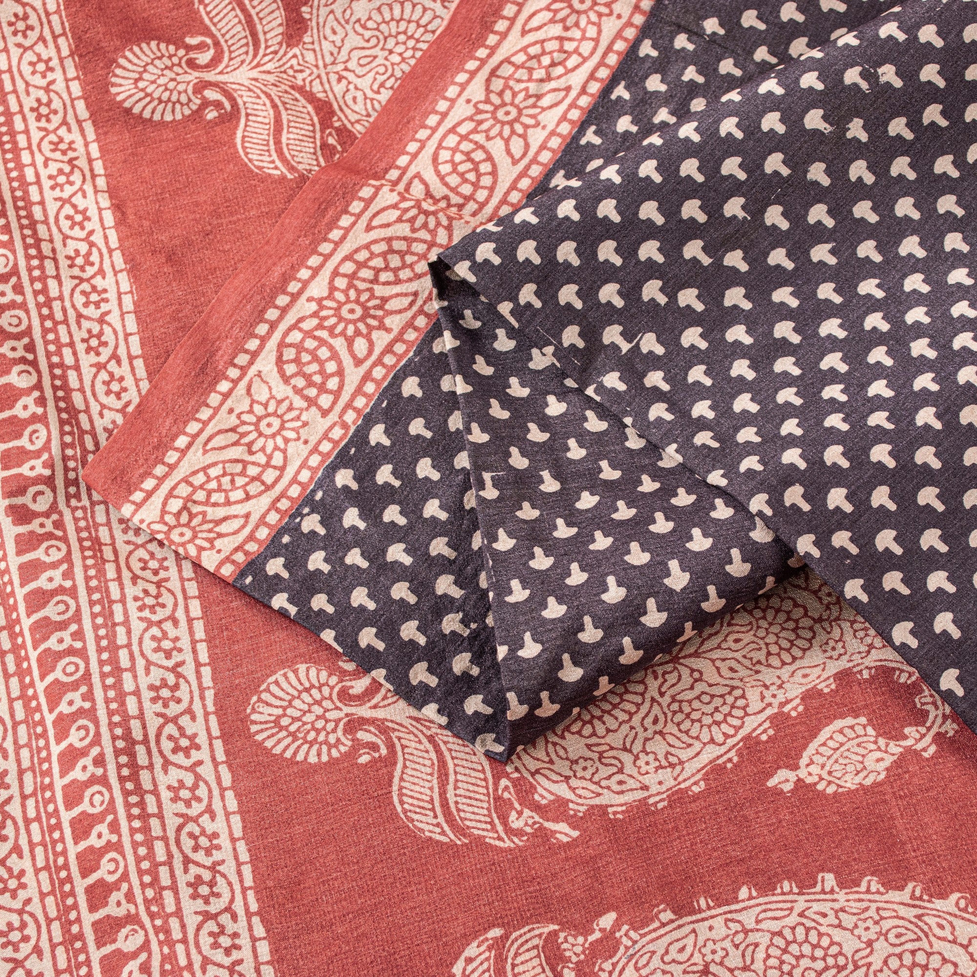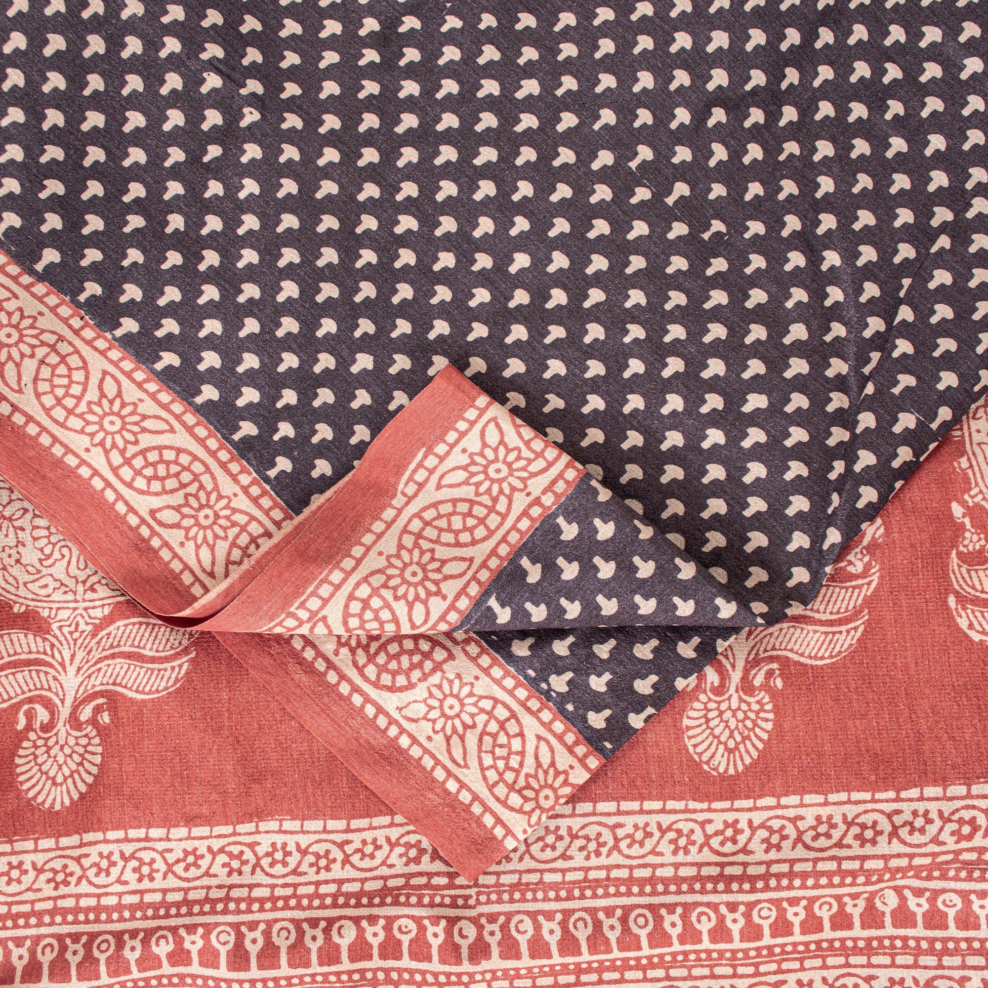 Sanskriti Vintage Sari Black-Red Pure Bamboo Silk Saree Hand Block 6.5+YD Fabric