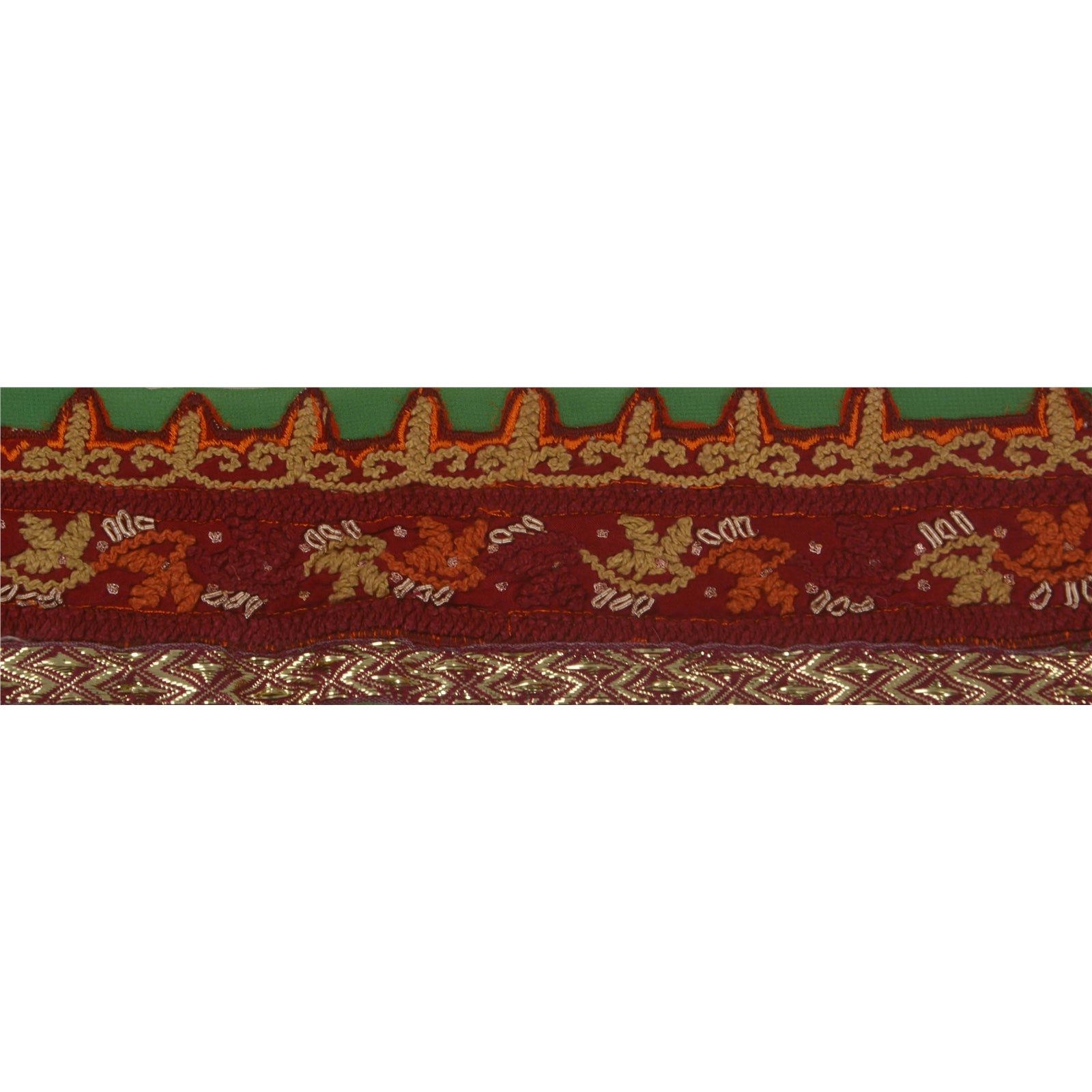 Amazing blend georgette hand embroidered sari border in green color highlighting thread work. Border has beautiful floral patterns painstakingly hand embroidered with golden zardozi work, red/golden lace work . Further you can see fine detailing with maroon Sustainable Fabric patch, multi color thread work. WOW!! an awesome one of a kind versatile border. 1 Quantity = 1 Yard