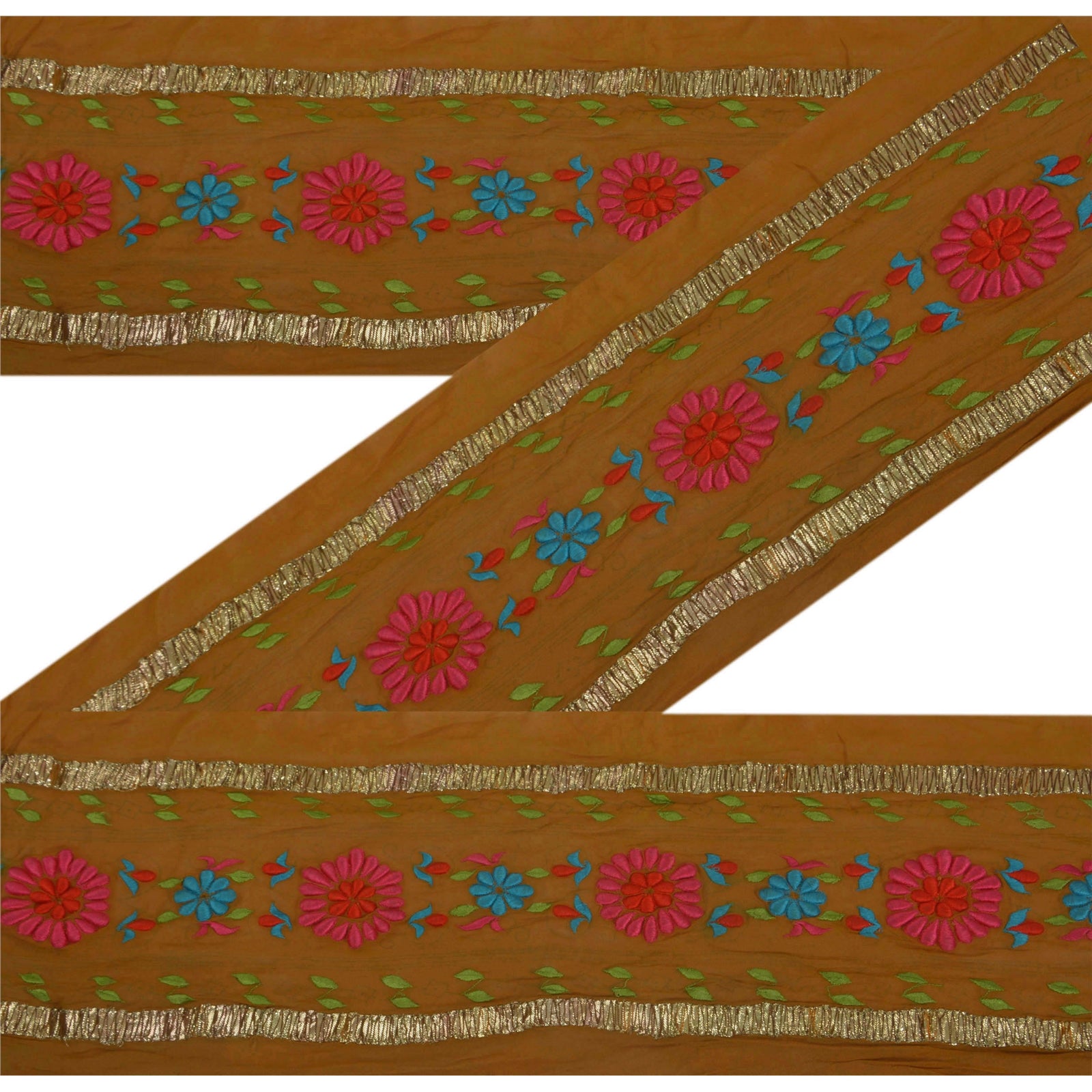 Amazing georgette embroidered sari border in green color highlighting thread work. Border has beautiful floral patterns painstakingly embroidered with multi color thread work. Also you can see golden gota work . WOW!! an awesome one of a kind versatile border. 1 Quantity = 1 Yard