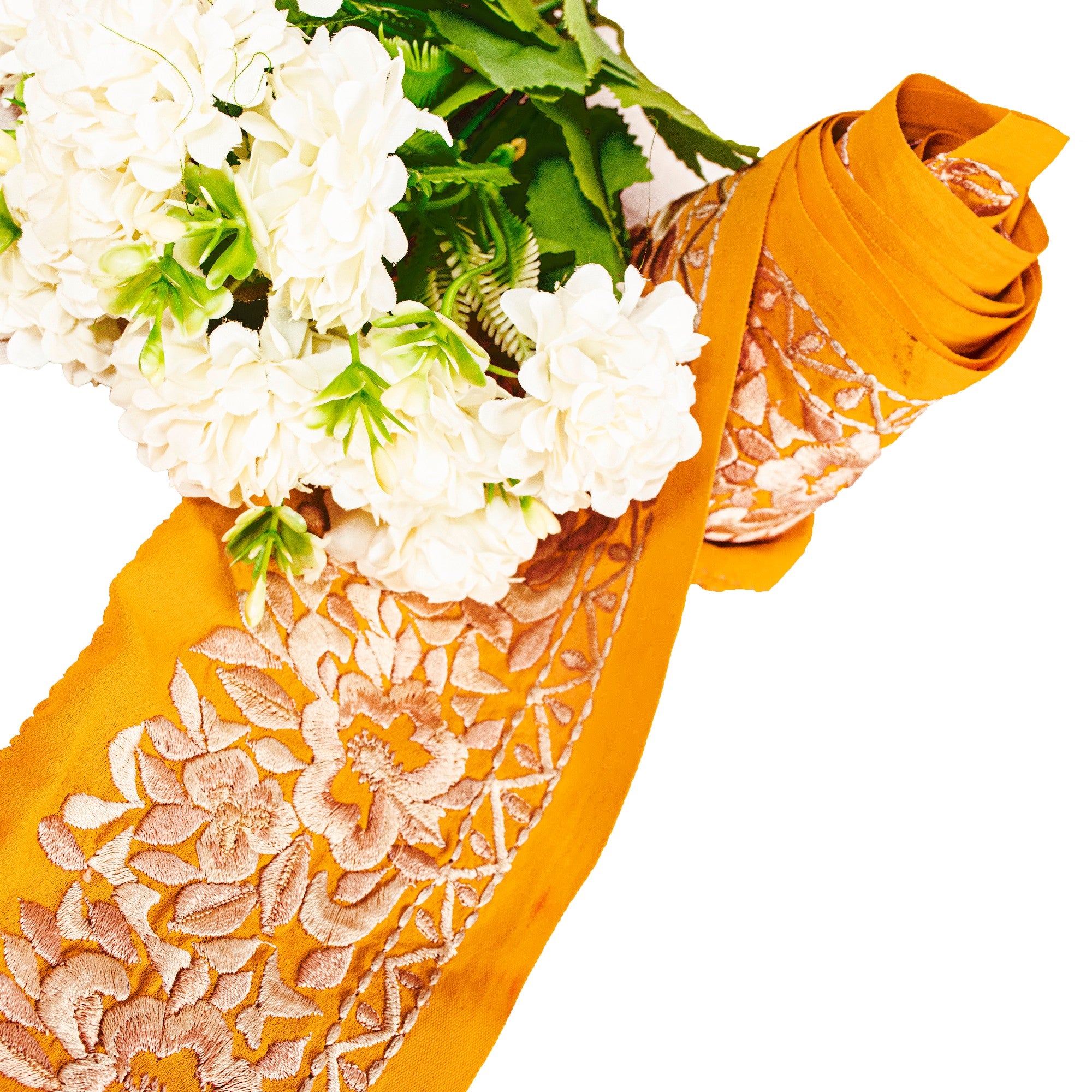 Beautiful georgette embroidered sari border. Further embellished by pink/cream thread work along with floral design on saffron fabric. 1 Quantity = 1 Yard B-8779