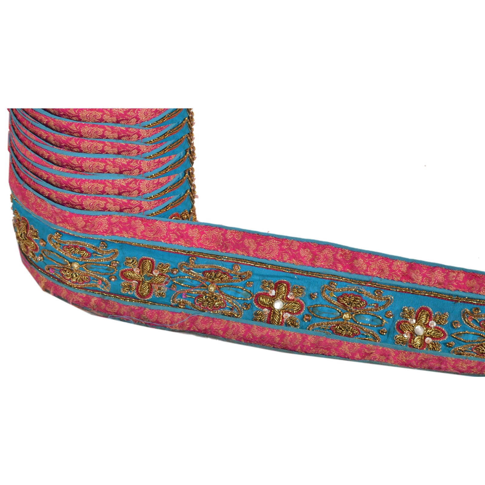 Stunning crepe silk hand beaded sari border in blue color highlighting zardozi work. Border has beautiful floral patterns painstakingly hand beaded with gold zari/zardozi/dabka work, silver sequins, white rhinestone, blue kundan stone, pink glass beads work. Further you can see fine detailing with white rhinestone, gota patti work, pink woven work . WOW!! an awesome one of a kind versatile border. 1 Quantity = 1 Yard