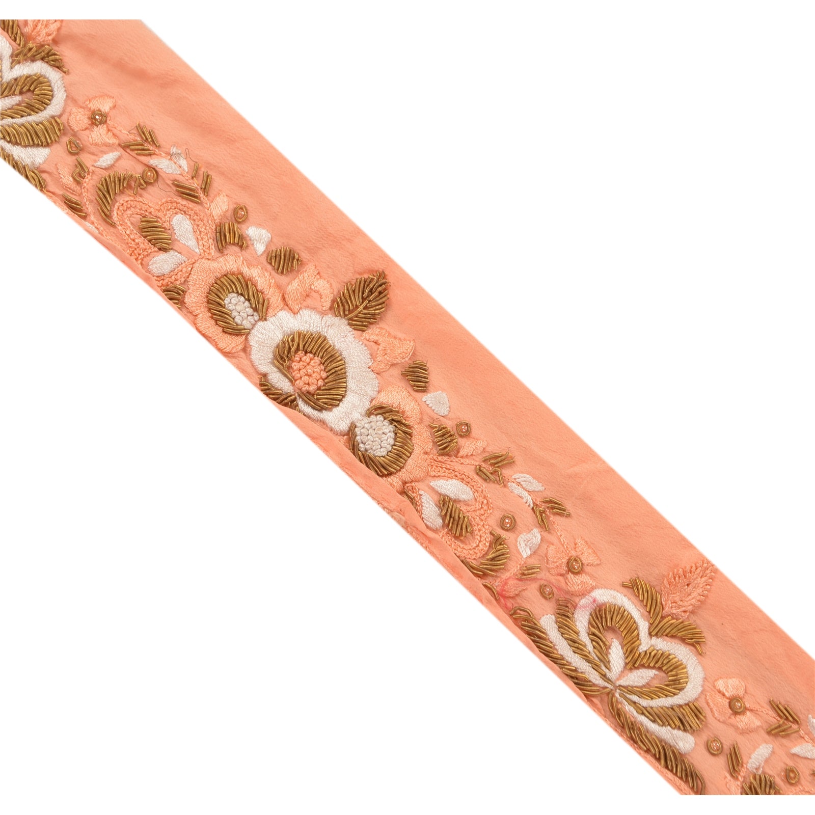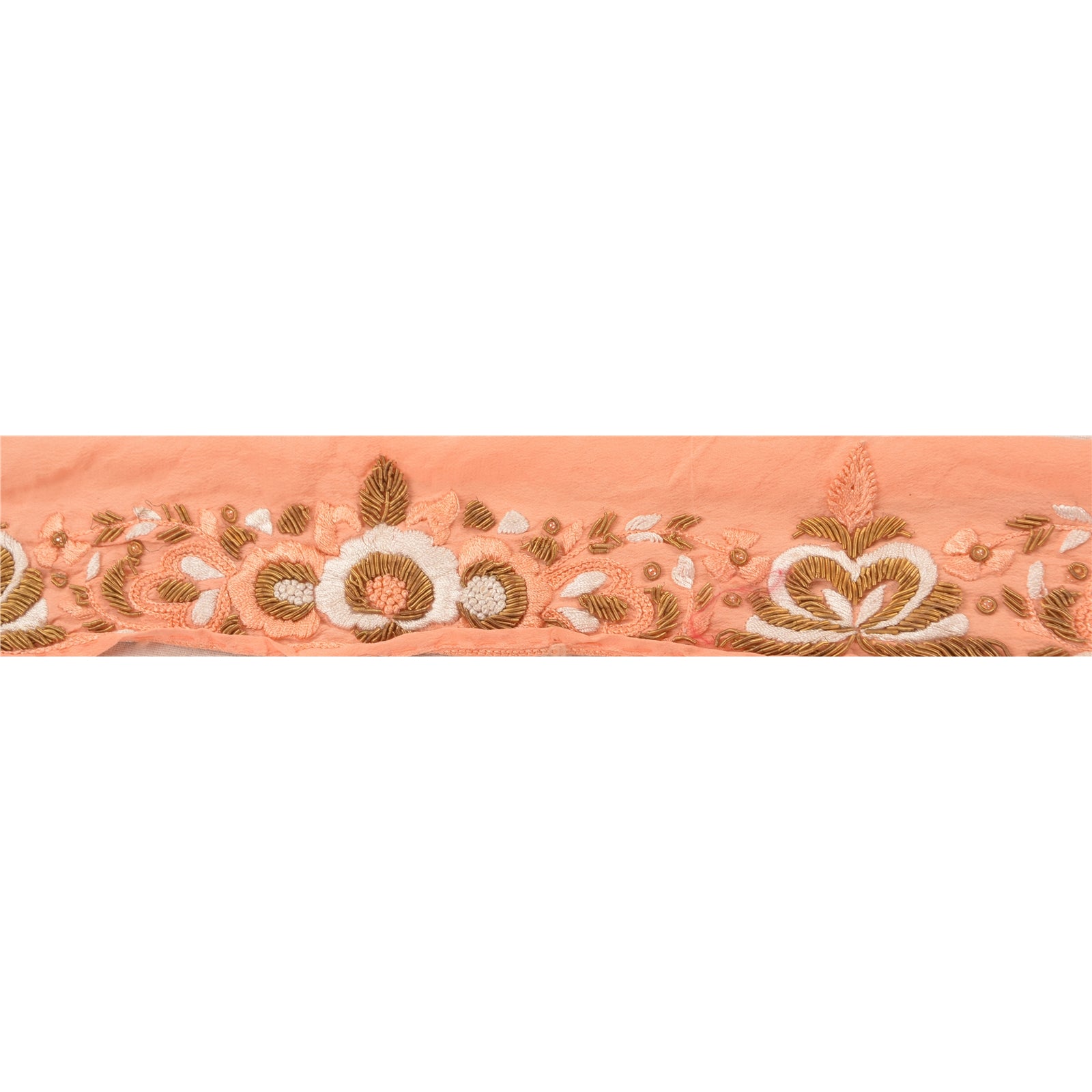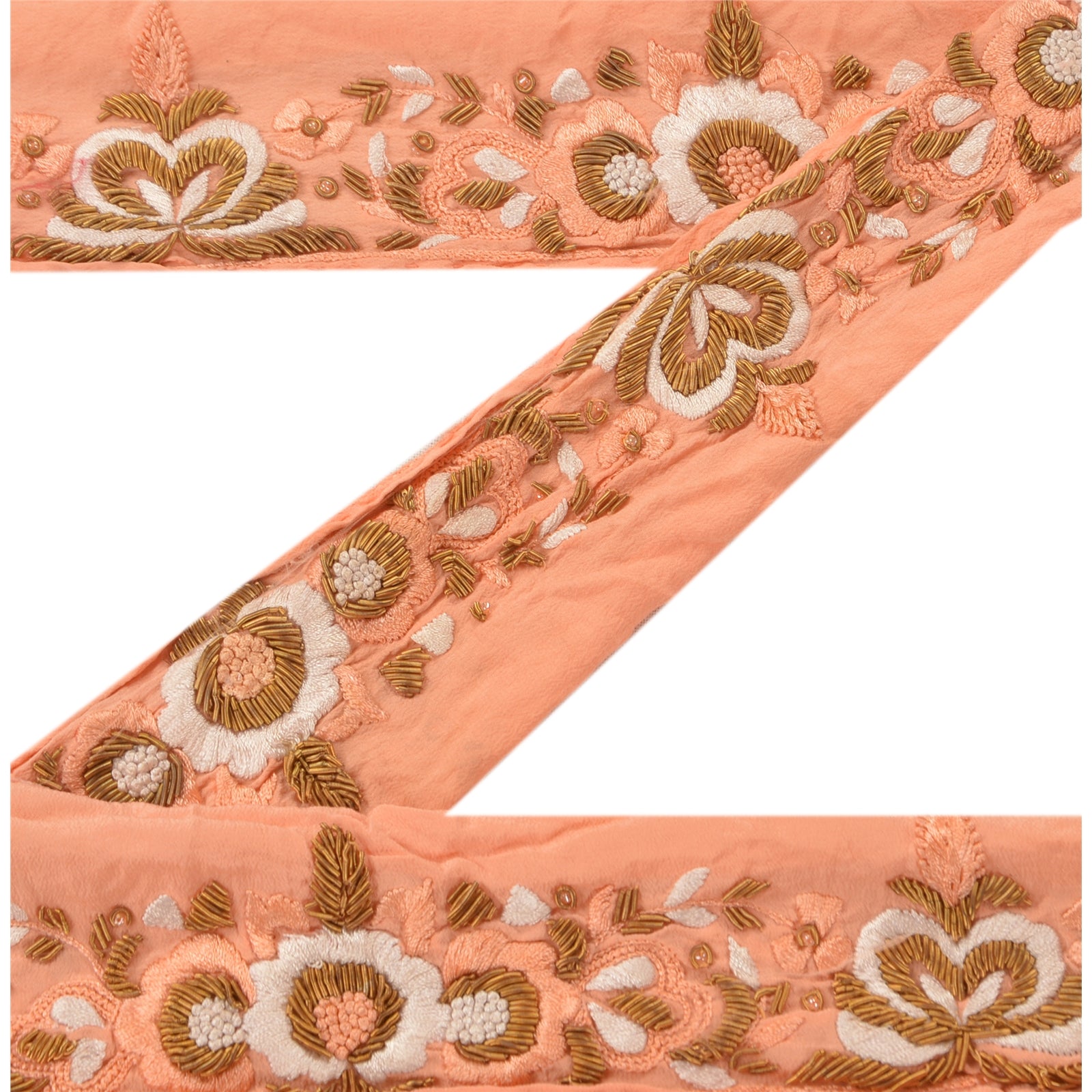 Superb crepe silk hand embroidered sari border in peach color highlighting zardozi work . Border has beautiful floral patterns painstakingly hand beaded with gold zardozi work . Further you can see fine detailing with cream/peach thread work . WOW!! an awesome one of a kind versatile border. 1 Quantity = 1 Yard