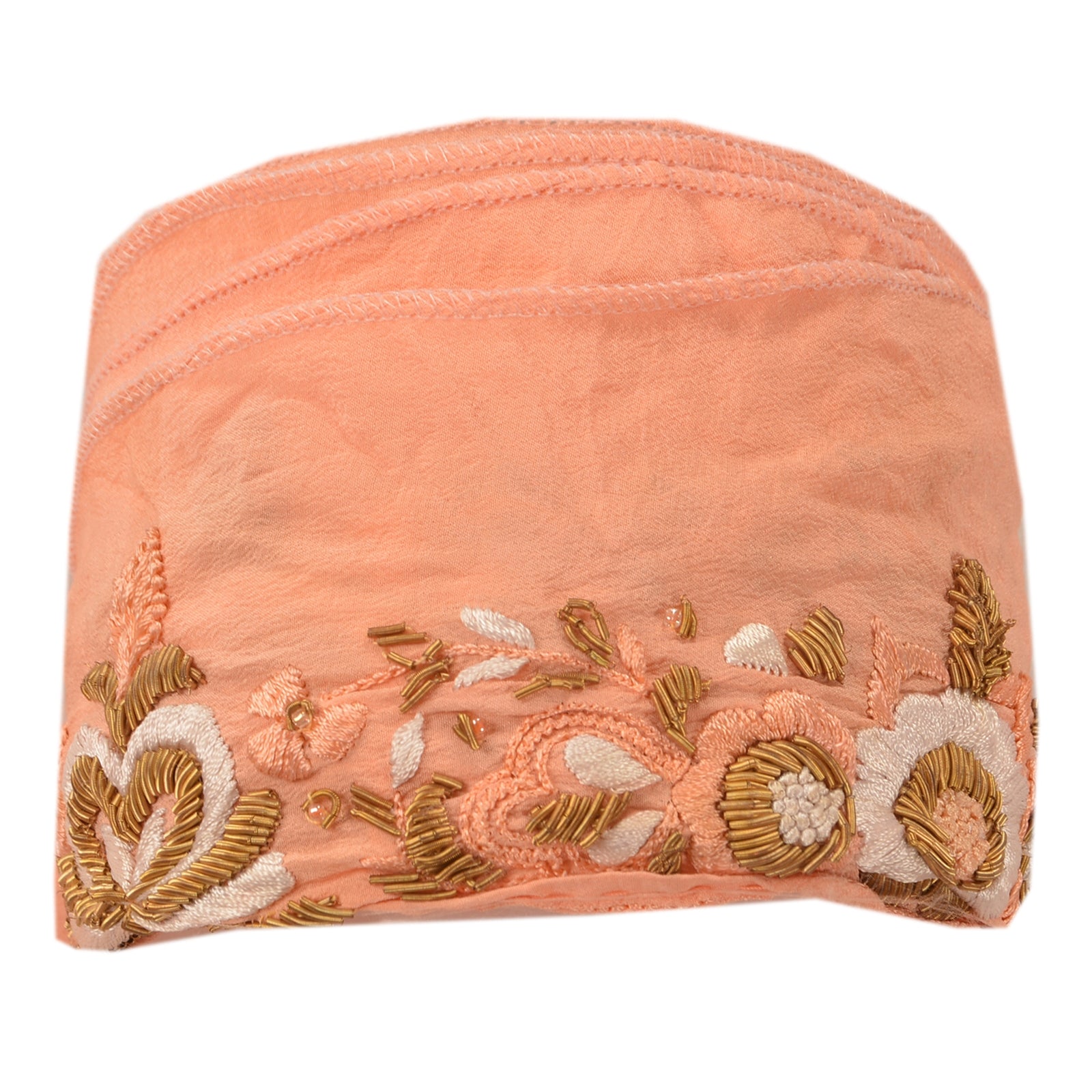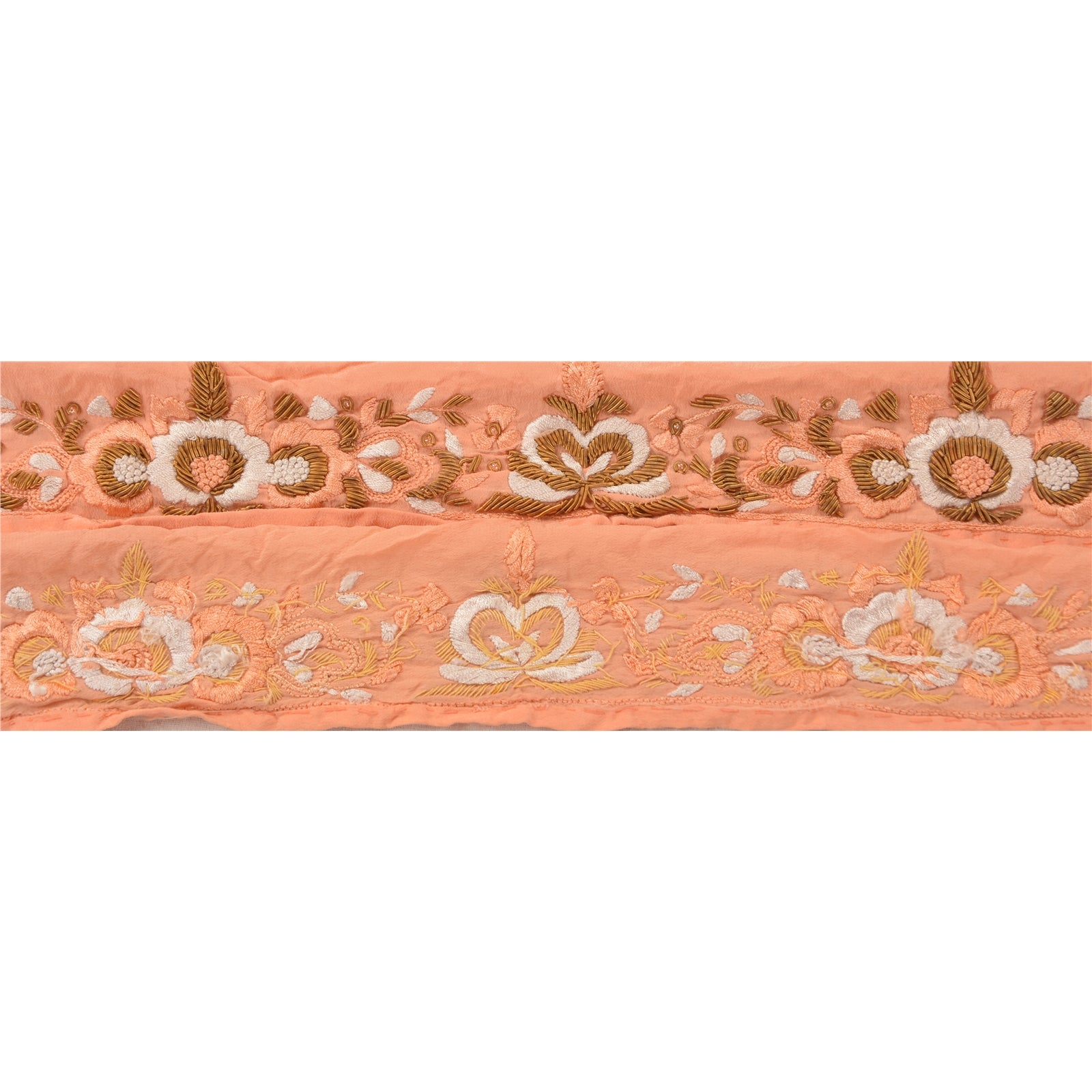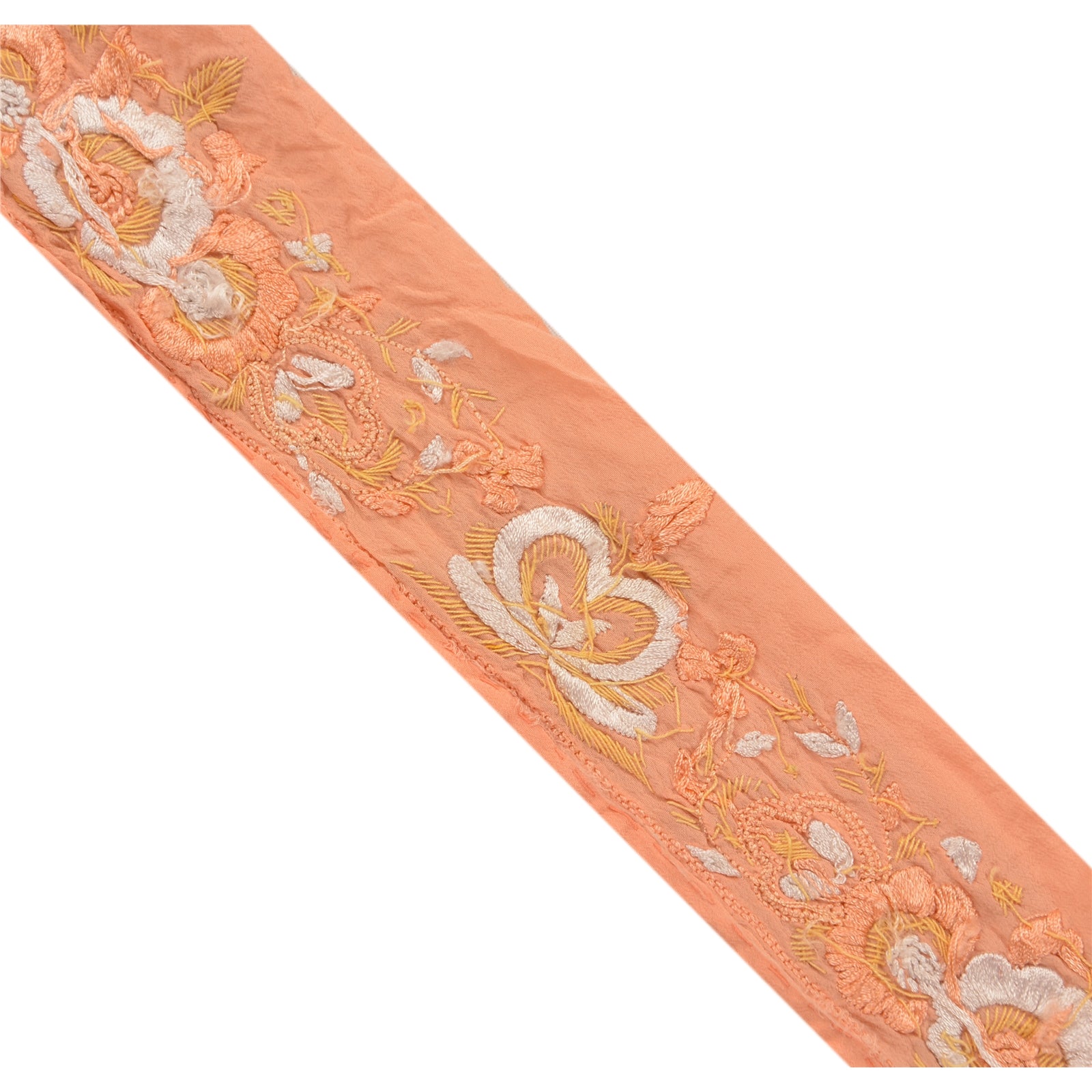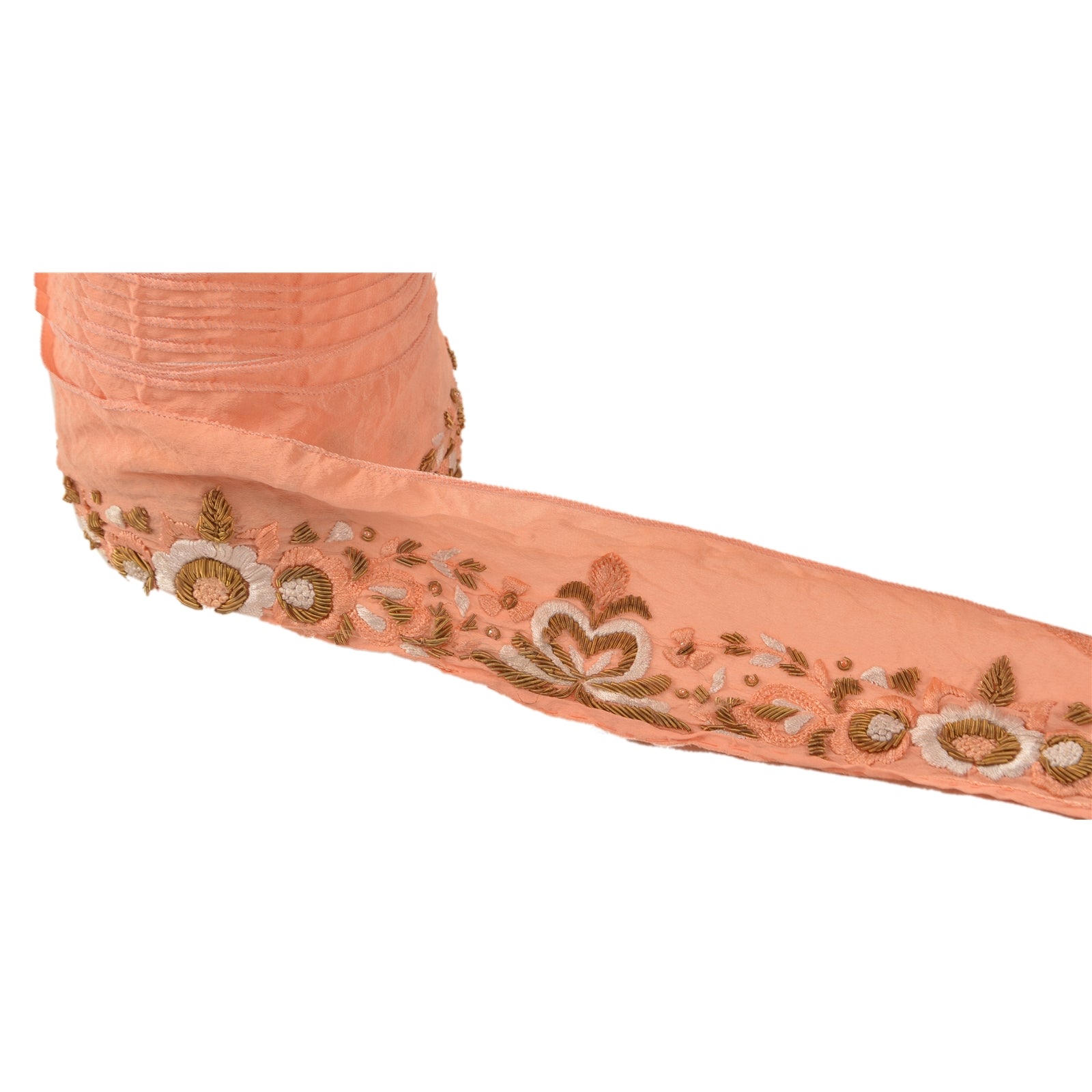Superb crepe silk hand embroidered sari border in peach color highlighting zardozi work . Border has beautiful floral patterns painstakingly hand beaded with gold zardozi work . Further you can see fine detailing with cream/peach thread work . WOW!! an awesome one of a kind versatile border. 1 Quantity = 1 Yard