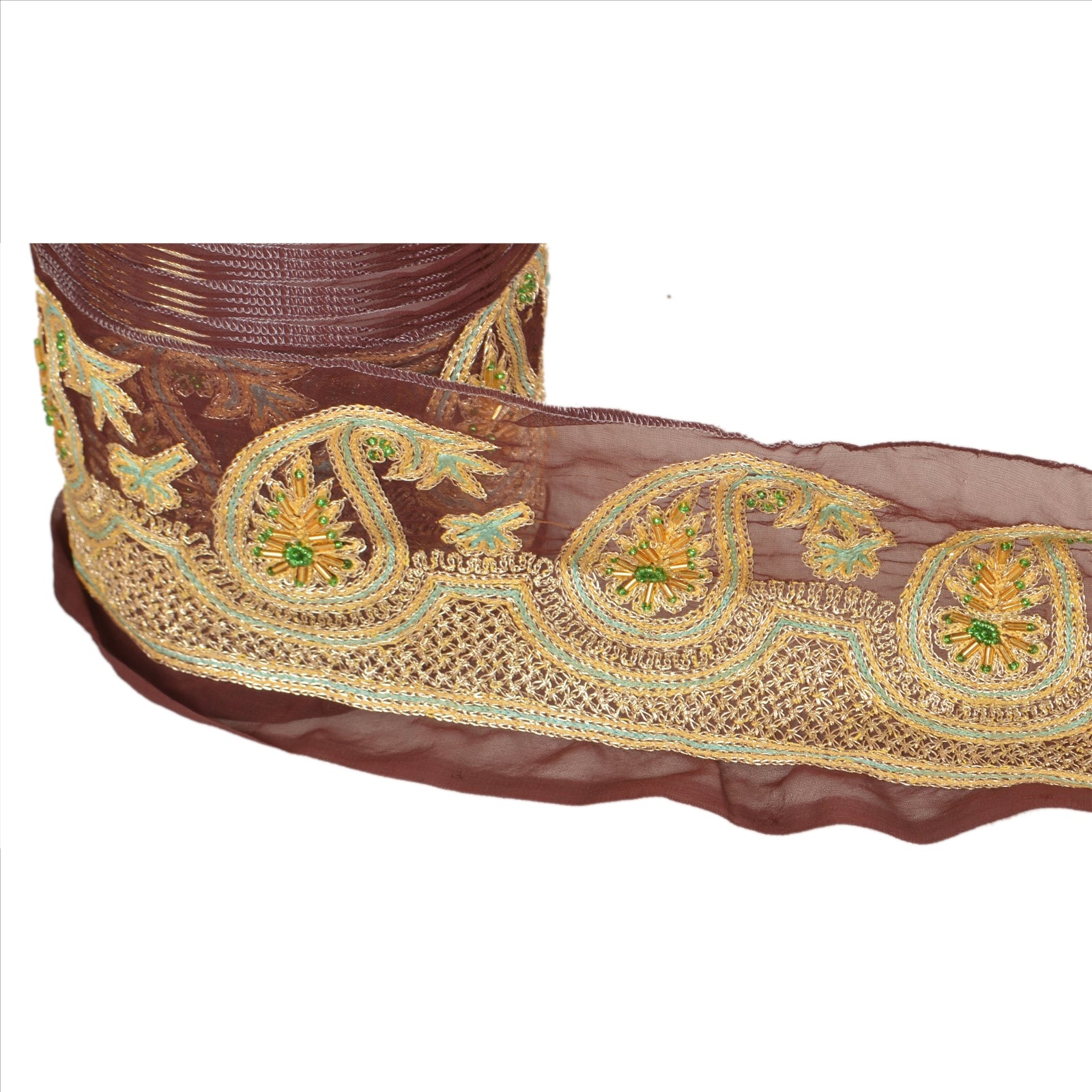 Wonderful georgette hand beaded sari border in brown color highlighting beads beads work. Border has beautiful floral & paisley patterns painstakingly hand beaded with gold zari work, yellow/green glass beads work. Further you can see fine detailing with cream/blue thread work. WOW!! an awesome one of a kind versatile border. 1 quantity = 1 yard.