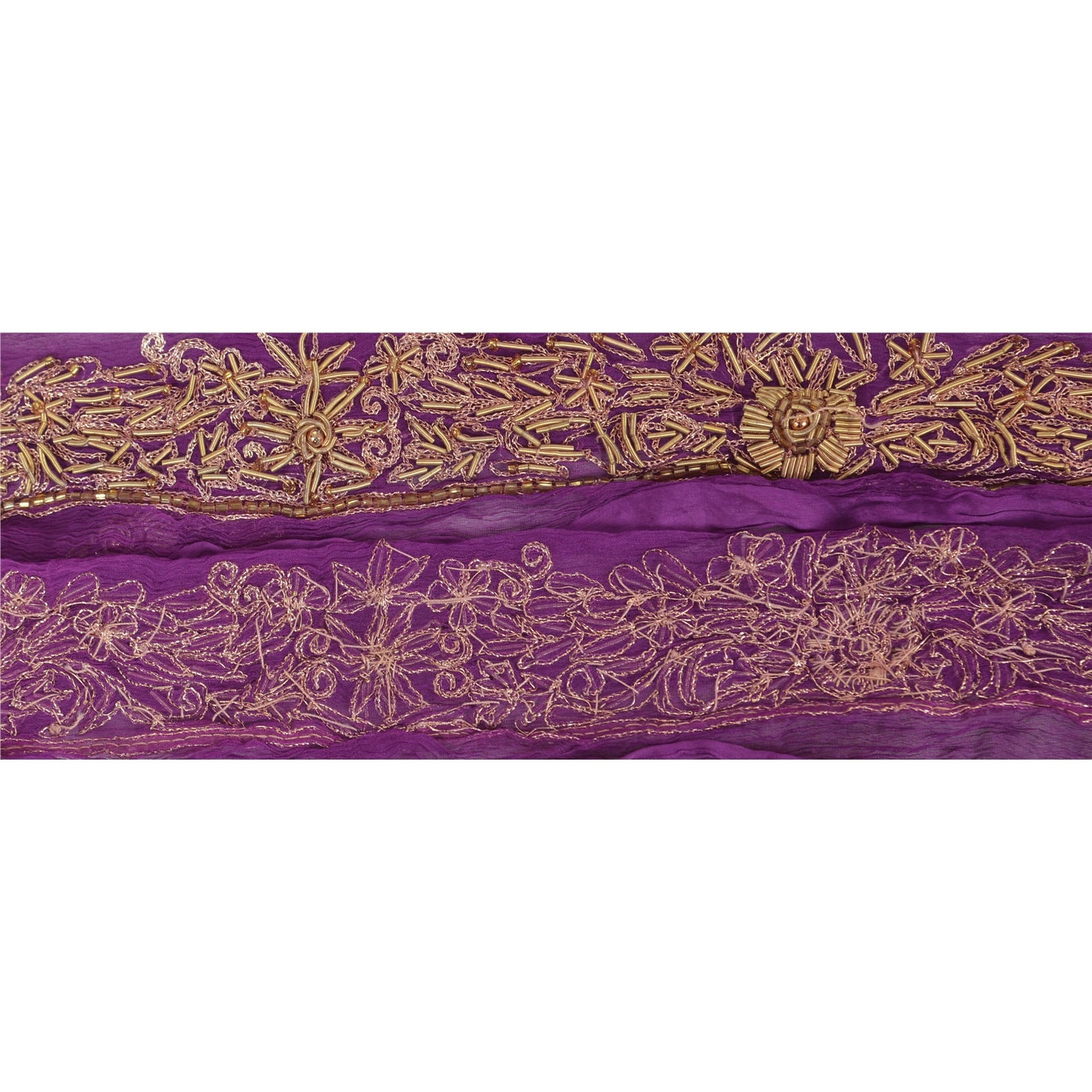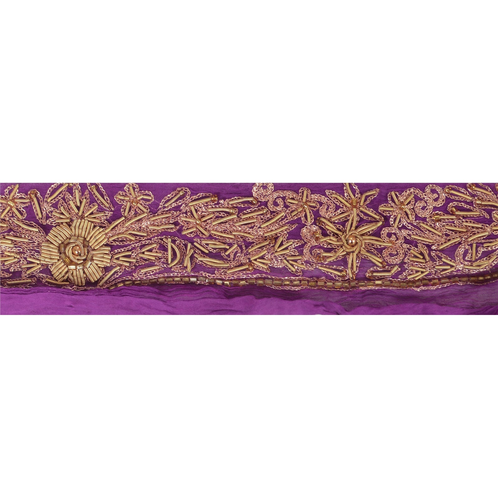 Stunning chiffon silk hand beaded sari border in purple color highlighting zardozi work. Border has beautiful floral & paisley patterns painstakingly hand beaded with gold zari/zardozi work, yellow glass beads work . Further you can see fine detailing with gold beads work. WOW!! an awesome one of a kind versatile border. 1 Quantity = 1 Yard