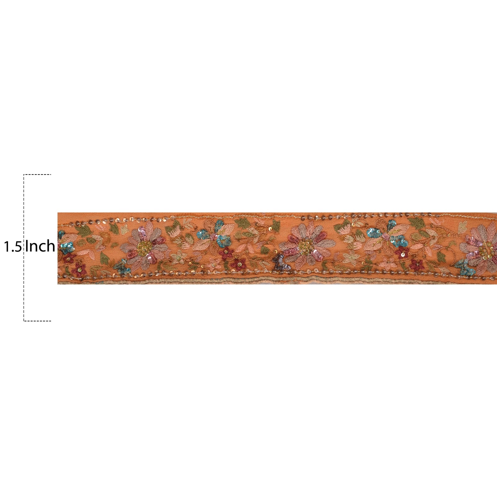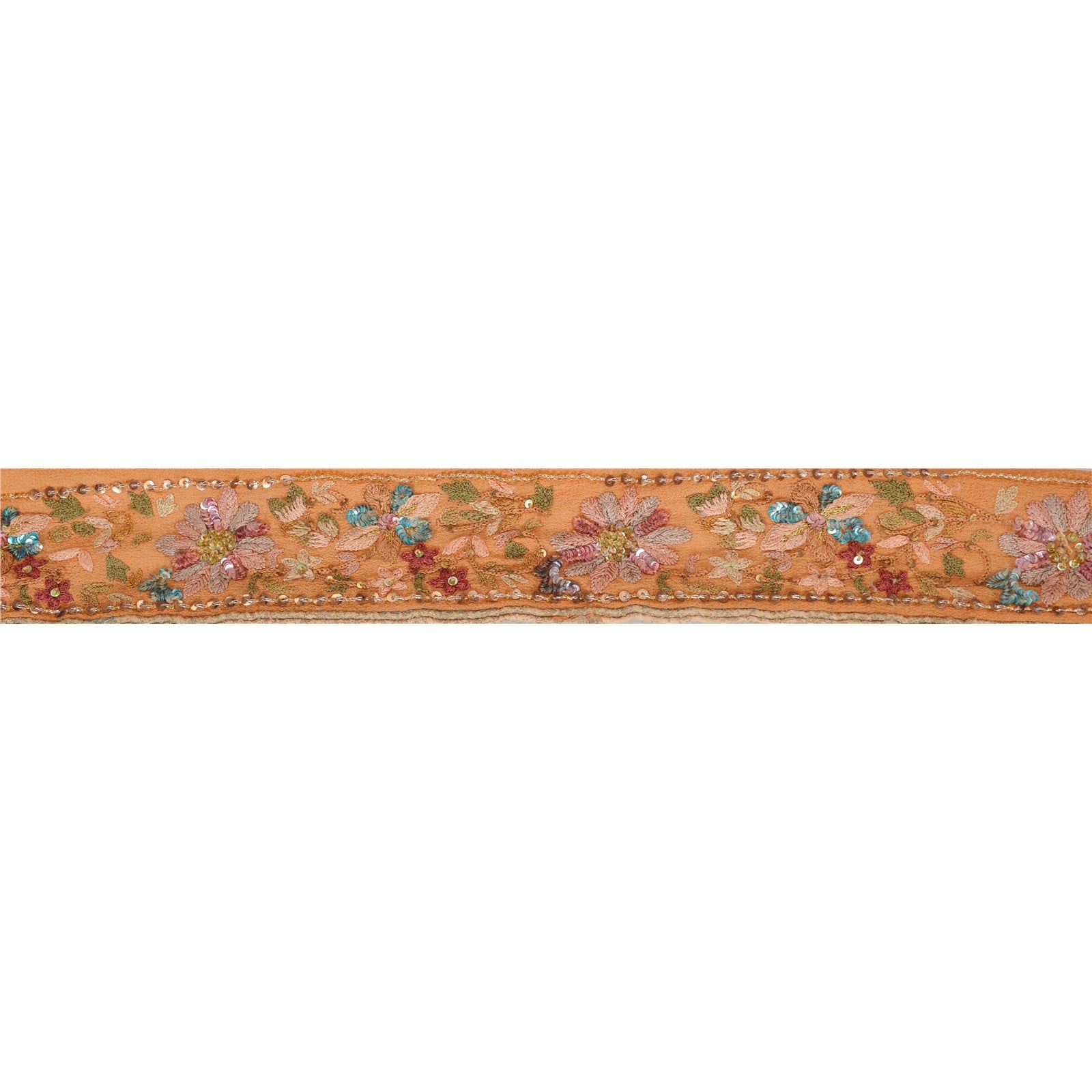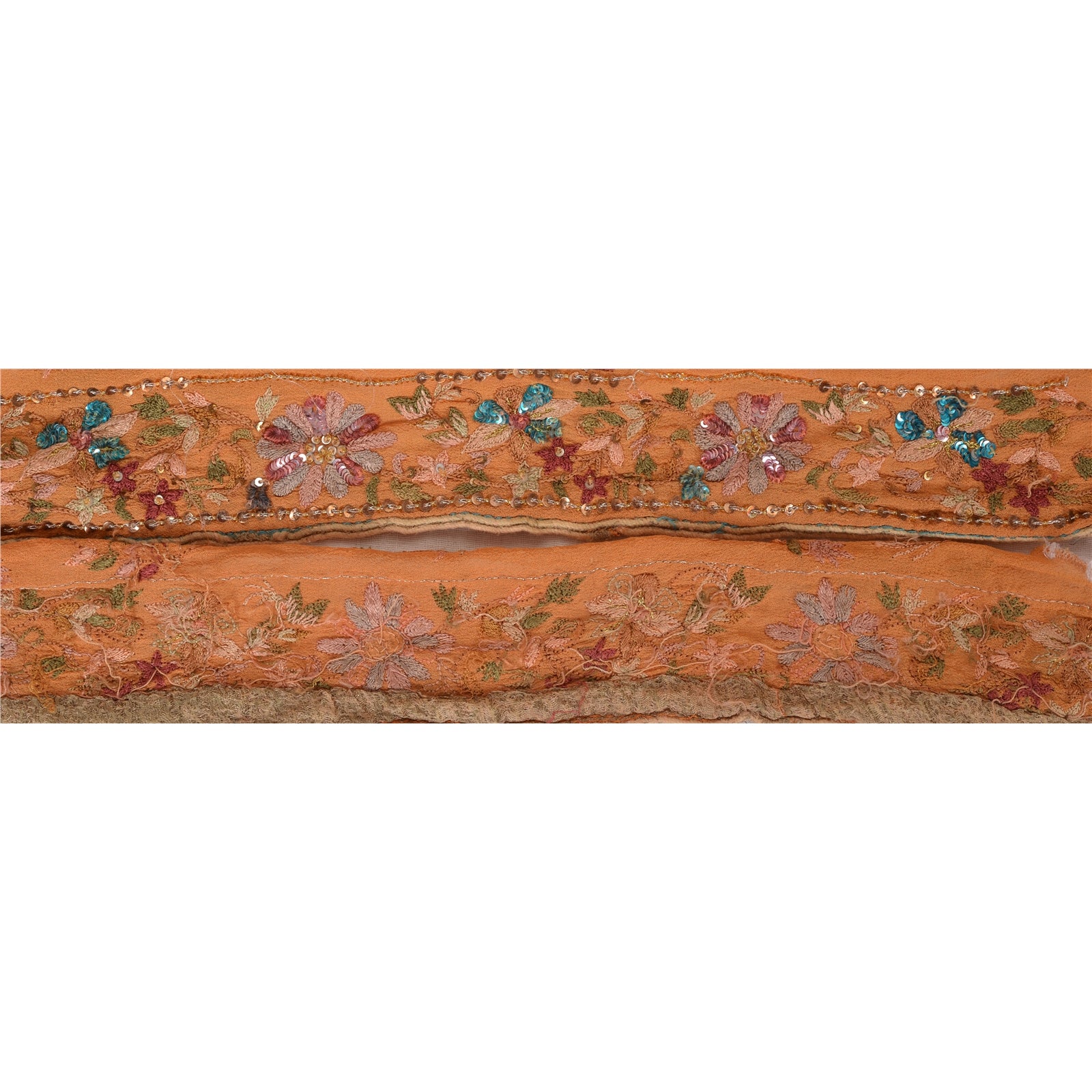 Fabulous georgette hand beaded sari border in saffron color highlighting sequins work. Border has beautiful floral patterns painstakingly hand beaded with gold/pink/blue sequins, gold zari work . Further you can see fine detailing with multi color thread work. WOW!! an awesome one of a kind versatile border. 1 Quantity = 1 Yard