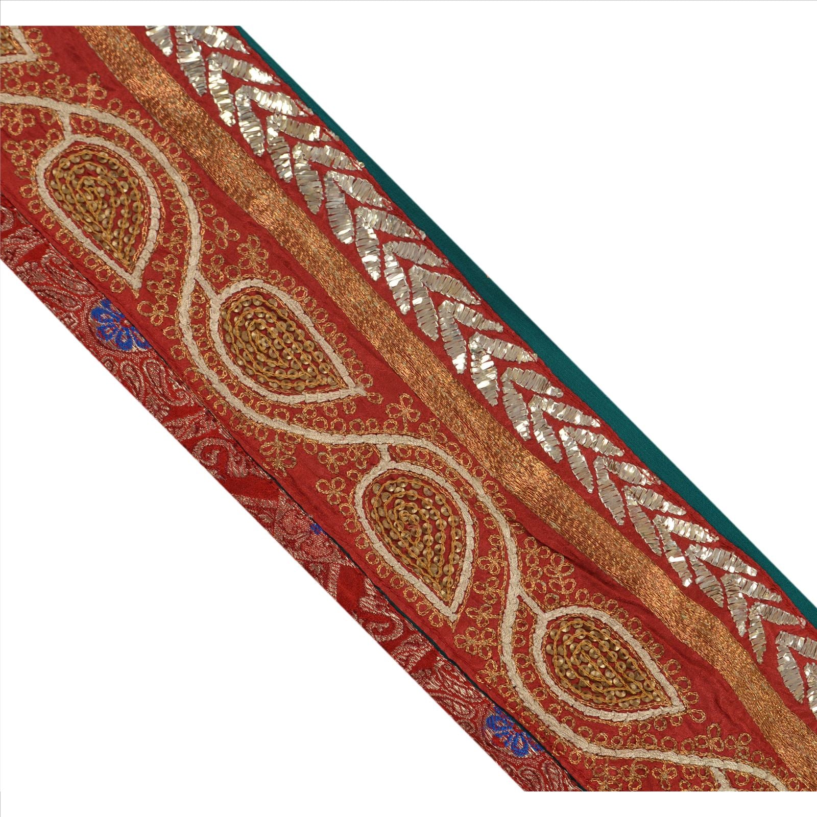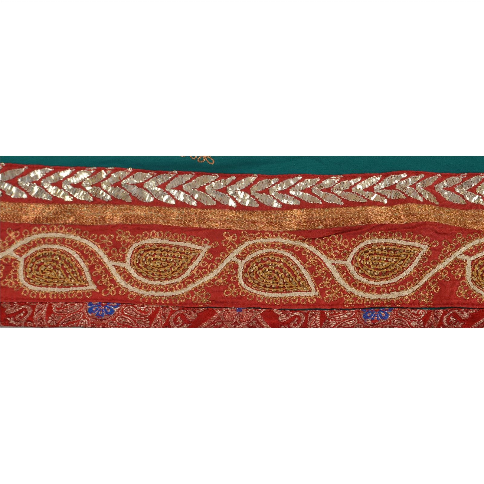 Beautiful georgette hand beaded sari border in blue color highlighting mukesh work. Border has beautiful floral patterns painstakingly hand beaded with gold zari, sequins and mukesh work, red Sustainable Fabric patch work. Further you can see fine detailing with cream dori work. WOW!! an awesome one of a kind versatile border. 1 Quantity = 1 Yard