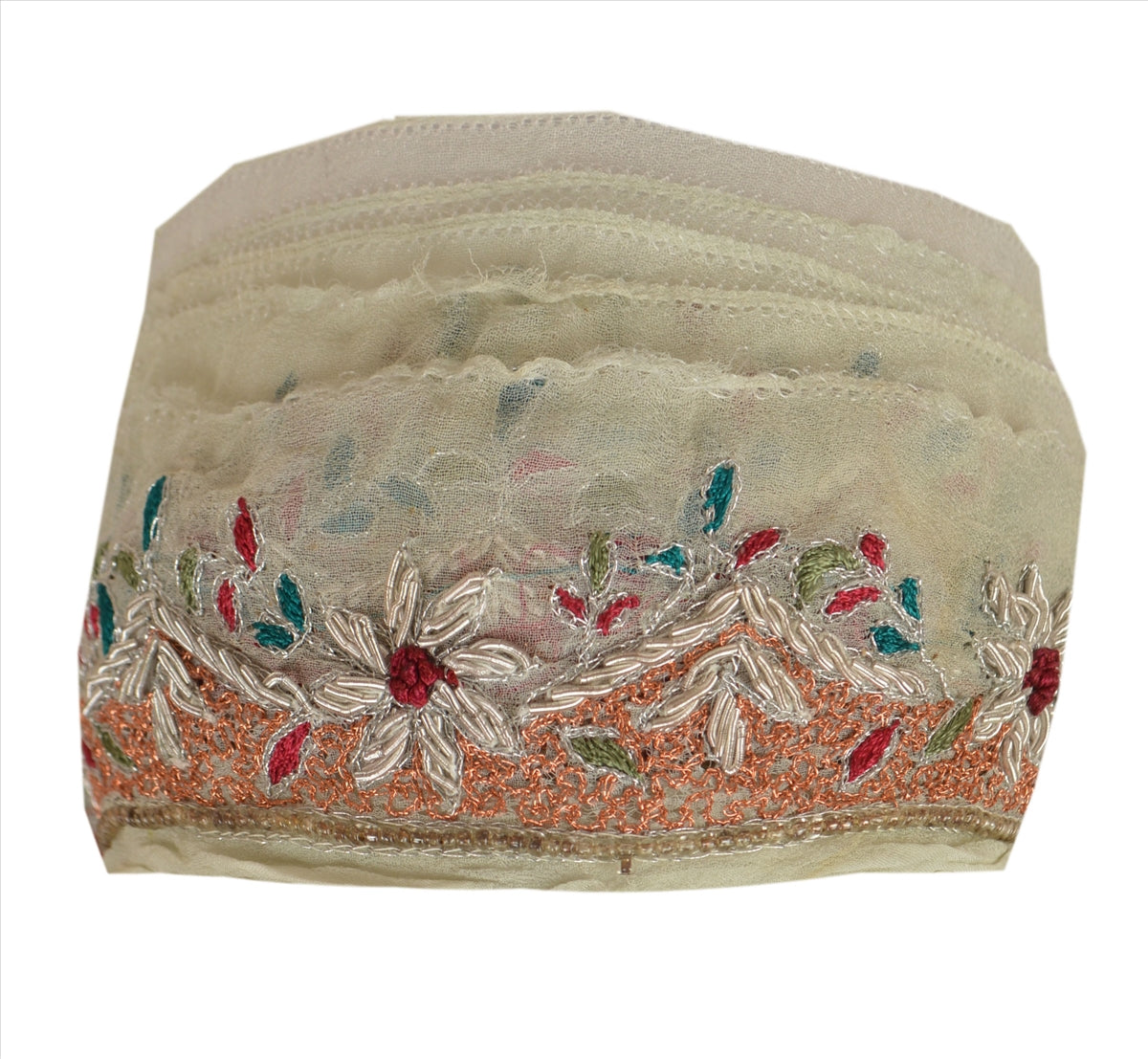 Beautiful georgette hand embroidered sari border. Further embellished by green, maroon & red thread work, silver/copper zari work, silver zardozi work along with floral design on cream base Sustainable Fabric. 1 quantity = 1 yard. International buyers please note: Import duties, taxes, and charges are not included in the item price or postage cost. These charges are the buyer's responsibility. Please check with your country's customs office to determine what these additional costs will be prior to bidding or buying. Buyer will pay custom duty/tax. It is calculated and charged differently by every country. As a seller I do not have any control over it.VAT or sales tax is calculated by the platform at the time of checkout. Customs charge is payable at the time of delivery.