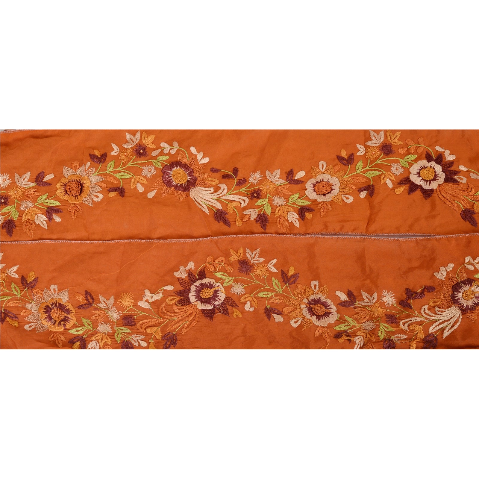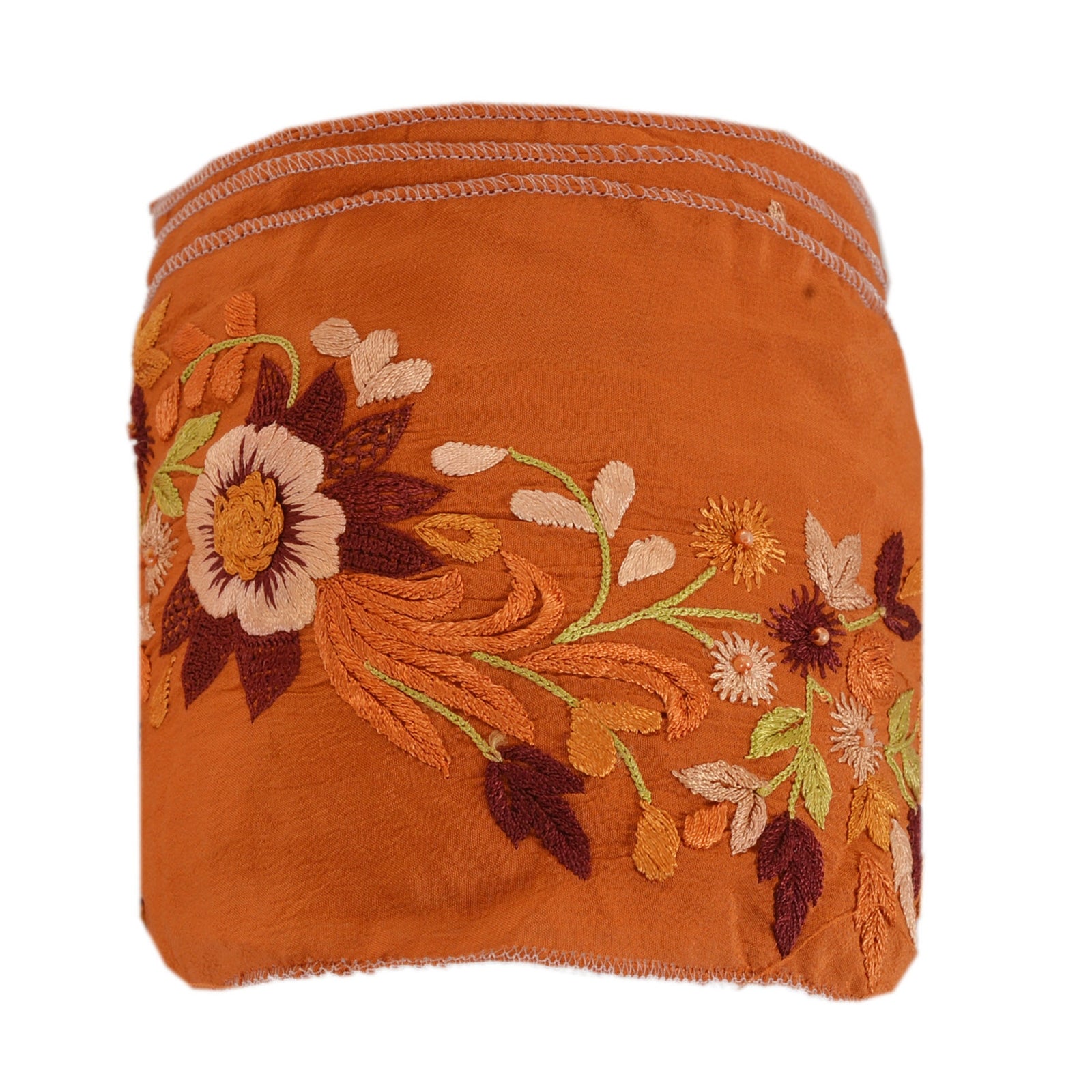 Fabulous crepe silk hand beaded sari border in orange color highlighting thread work. Border has beautiful floral patterns painstakingly hand beaded with orange, brown, green, cream, purple thread work . Further you can see fine detailing with pink beads work. WOW!! an awesome one of a kind versatile border. 1 Quantity = 1 Yard