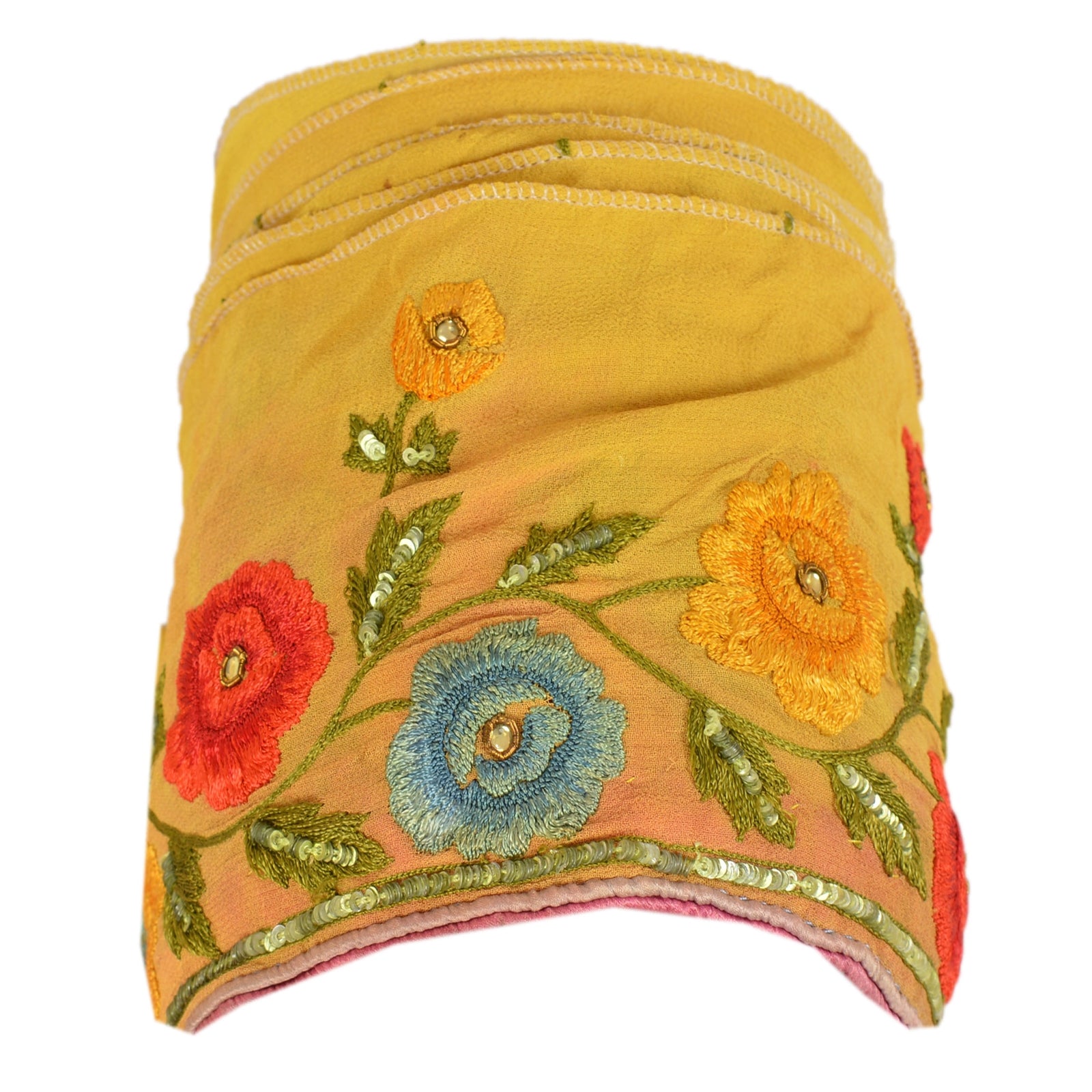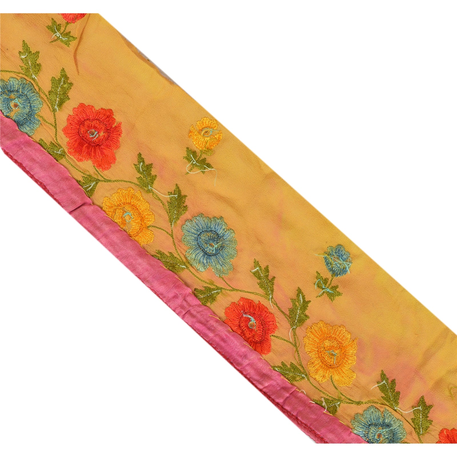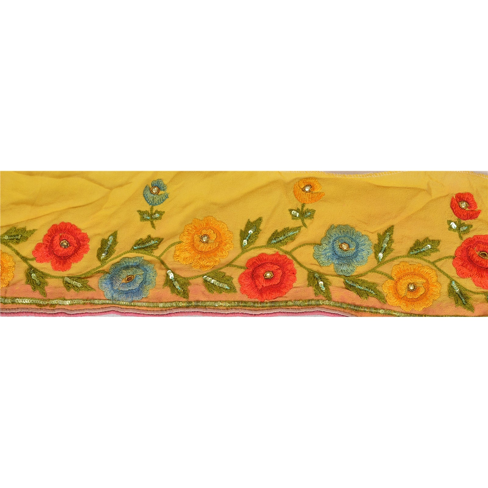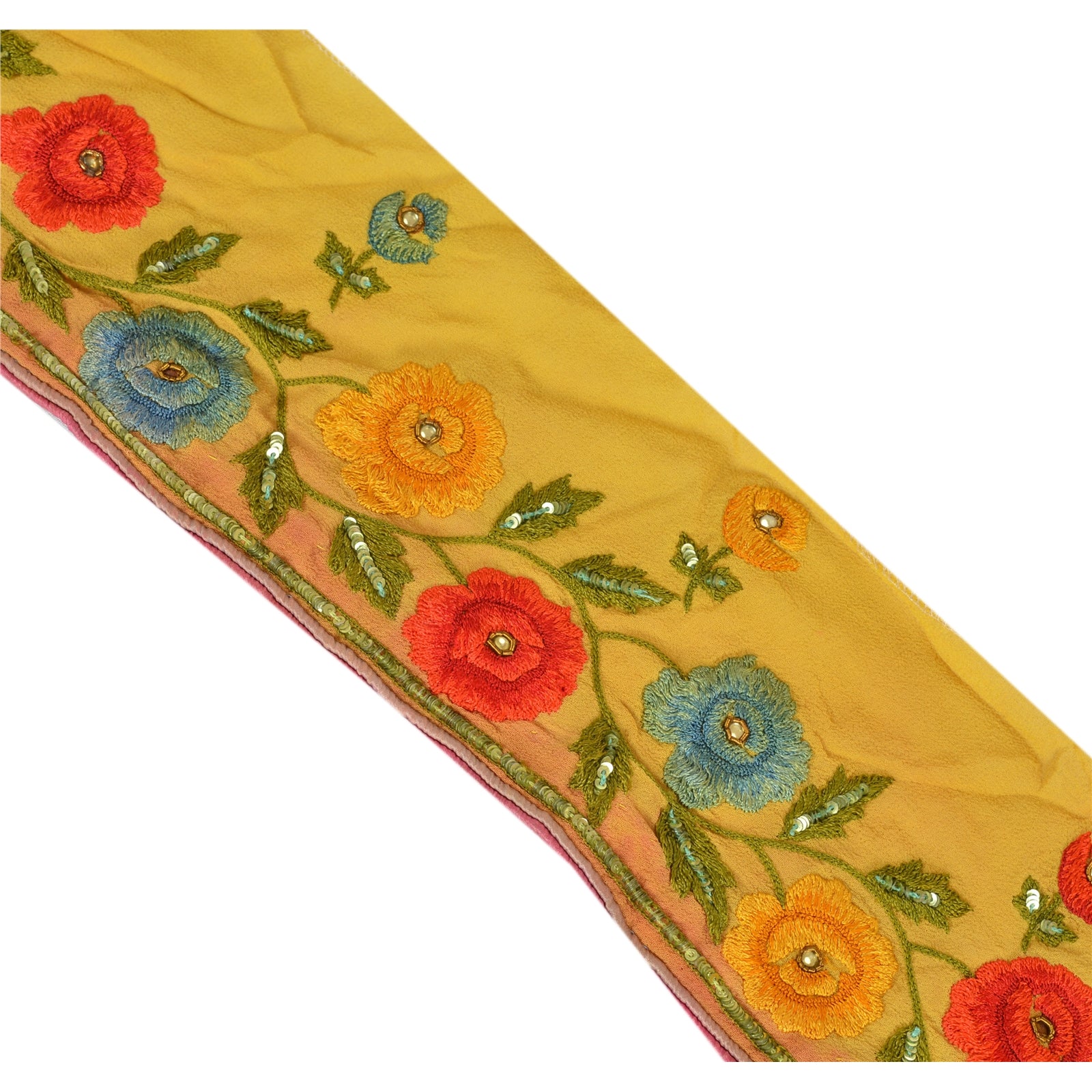 Fabulous georgette hand beaded sari border in yellow color highlighting thread work. Border has beautiful floral patterns painstakingly hand beaded with gold zardozi work, green sequins, yellow kundan stone work. Further you can see fine detailing with multi color thread work. WOW!! an awesome one of a kind versatile border. 1 Quantity = 1 Yard