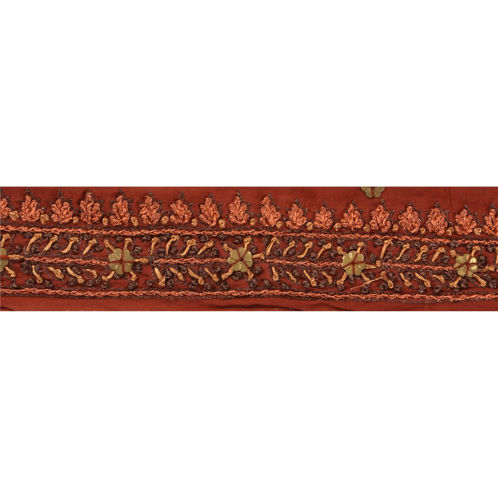 Fabulous crepe silk hand beaded sari border in rusty orange color highlighting zari work. Border has beautiful floral patterns painstakingly hand beaded with gold/copper/brown zari work . Further you can see fine detailing with gold designing metallic sequins work. WOW!! an awesome one of a kind versatile border. 1 Quantity = 1 Yard