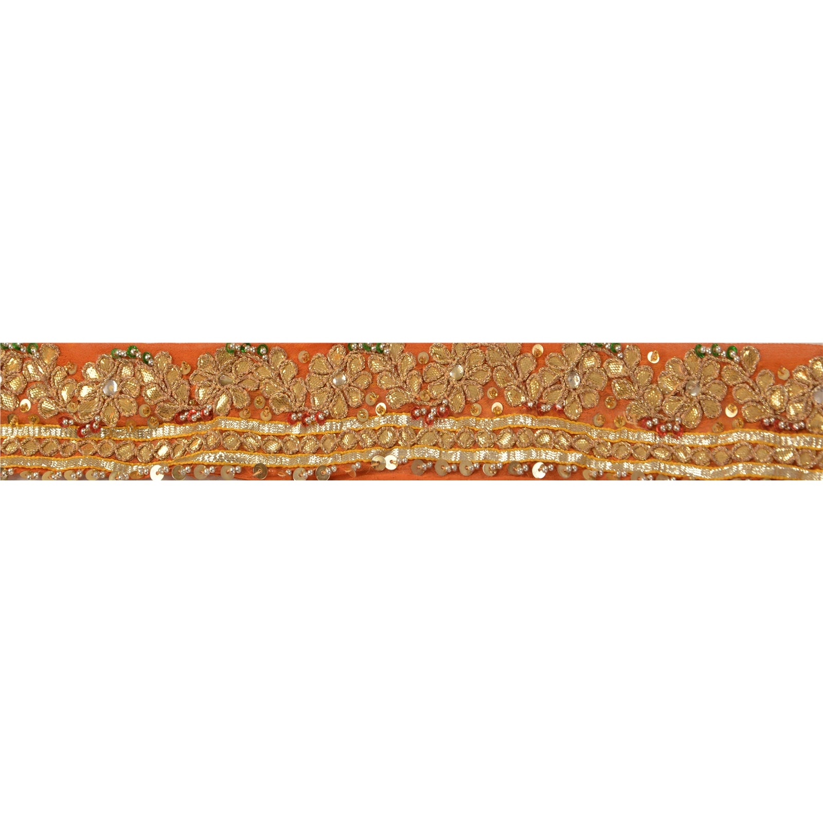 Stunning georgette hand beaded sari border in dark orange color highlighting gota patti work. Border has beautiful floral patterns painstakingly hand beaded with gold gota patti work, cream kundan stone, green/red sequins work . Further you can see fine detailing with gold beads work. WOW!! an awesome one of a kind versatile border. 1 Quantity = 1 Yard
