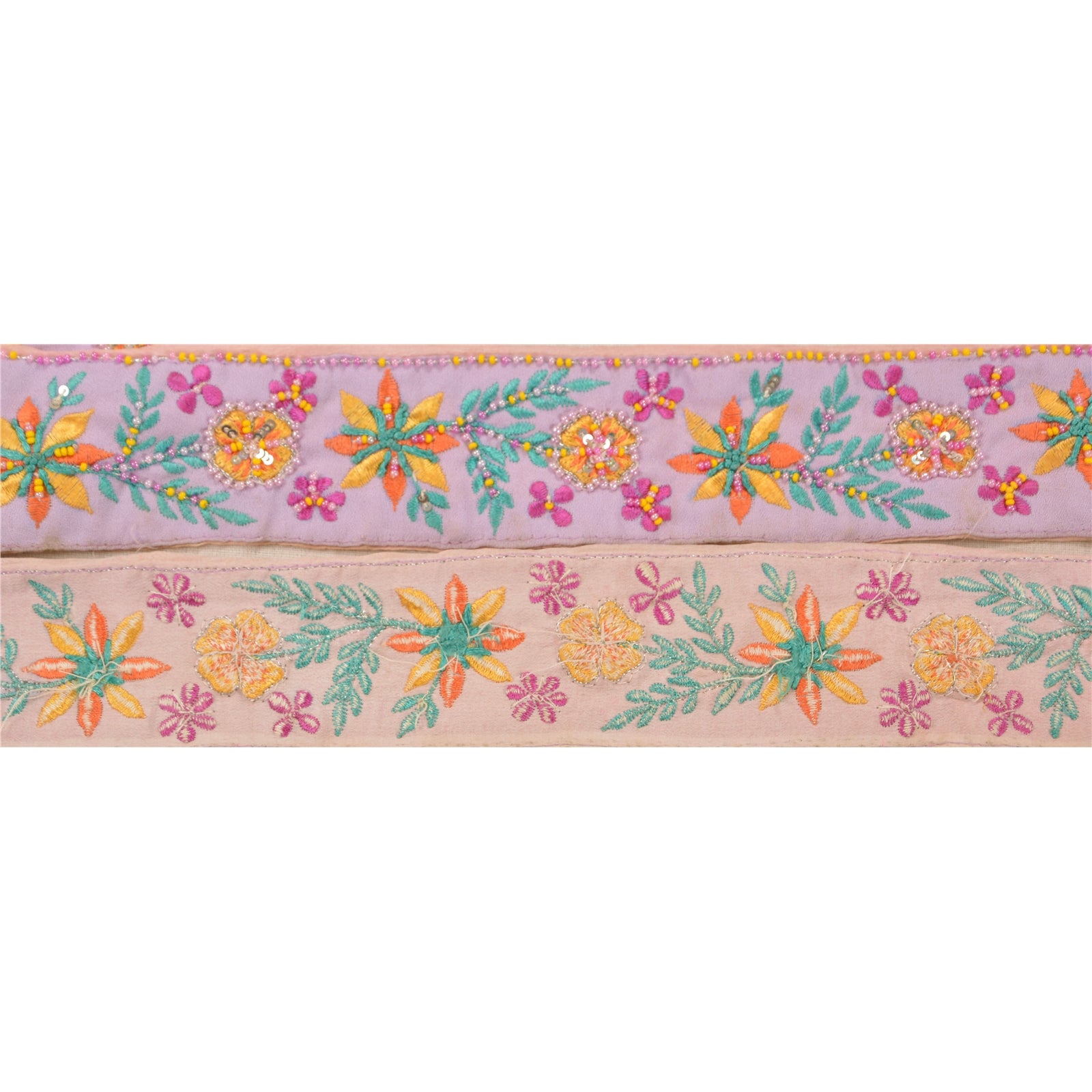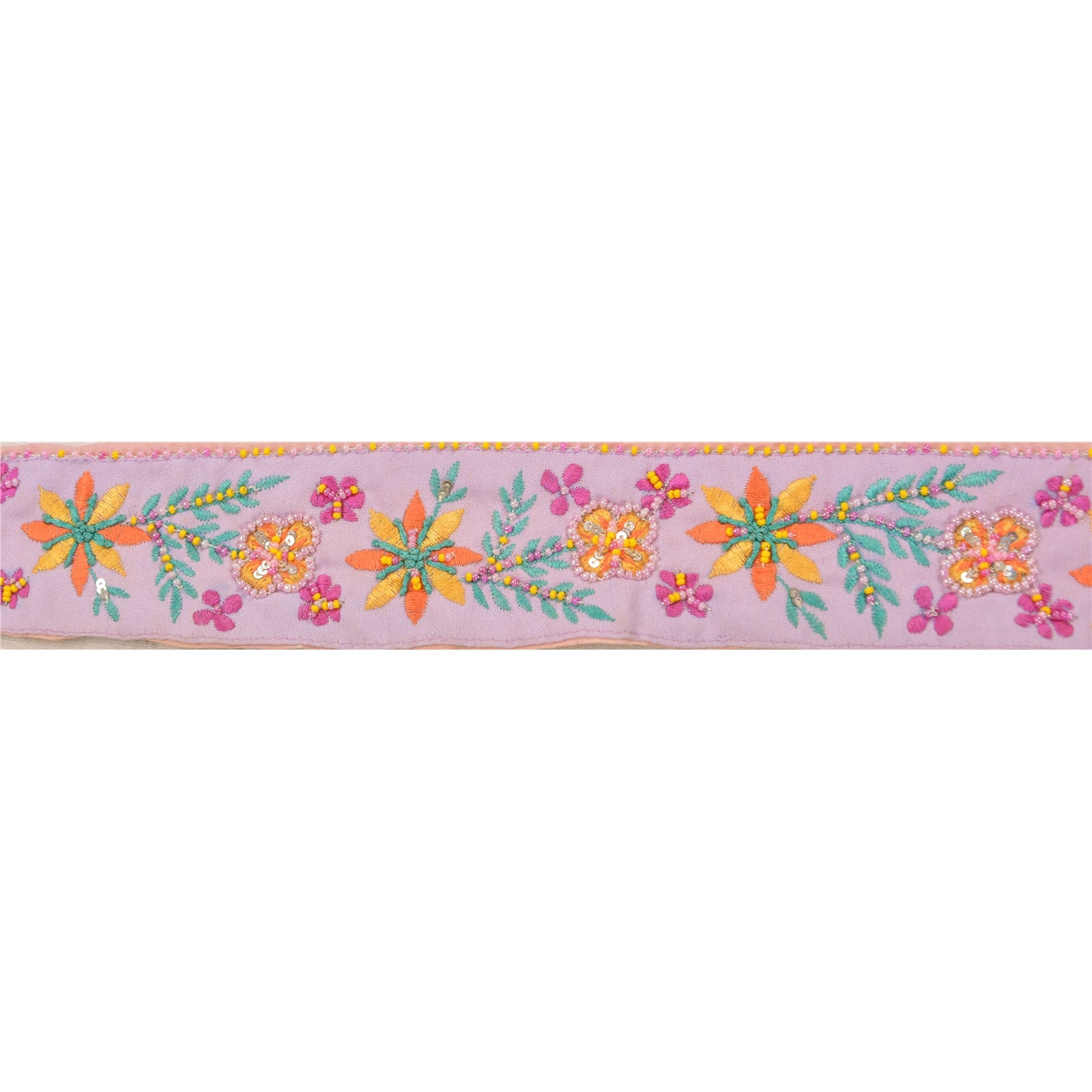 Fabulous crepe silk hand beaded sari border in purple & pink color highlighting beads work. Border has beautiful floral patterns painstakingly hand beaded with yellow/pink glass beads, silver sequins work. Further you can see fine detailing with multi color thread work. WOW!! an awesome one of a kind versatile border. 1 Quantity = 1 Yard