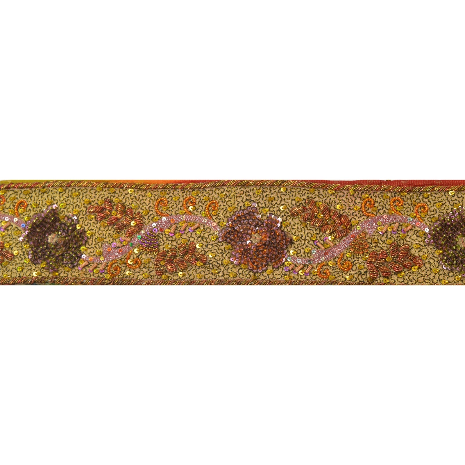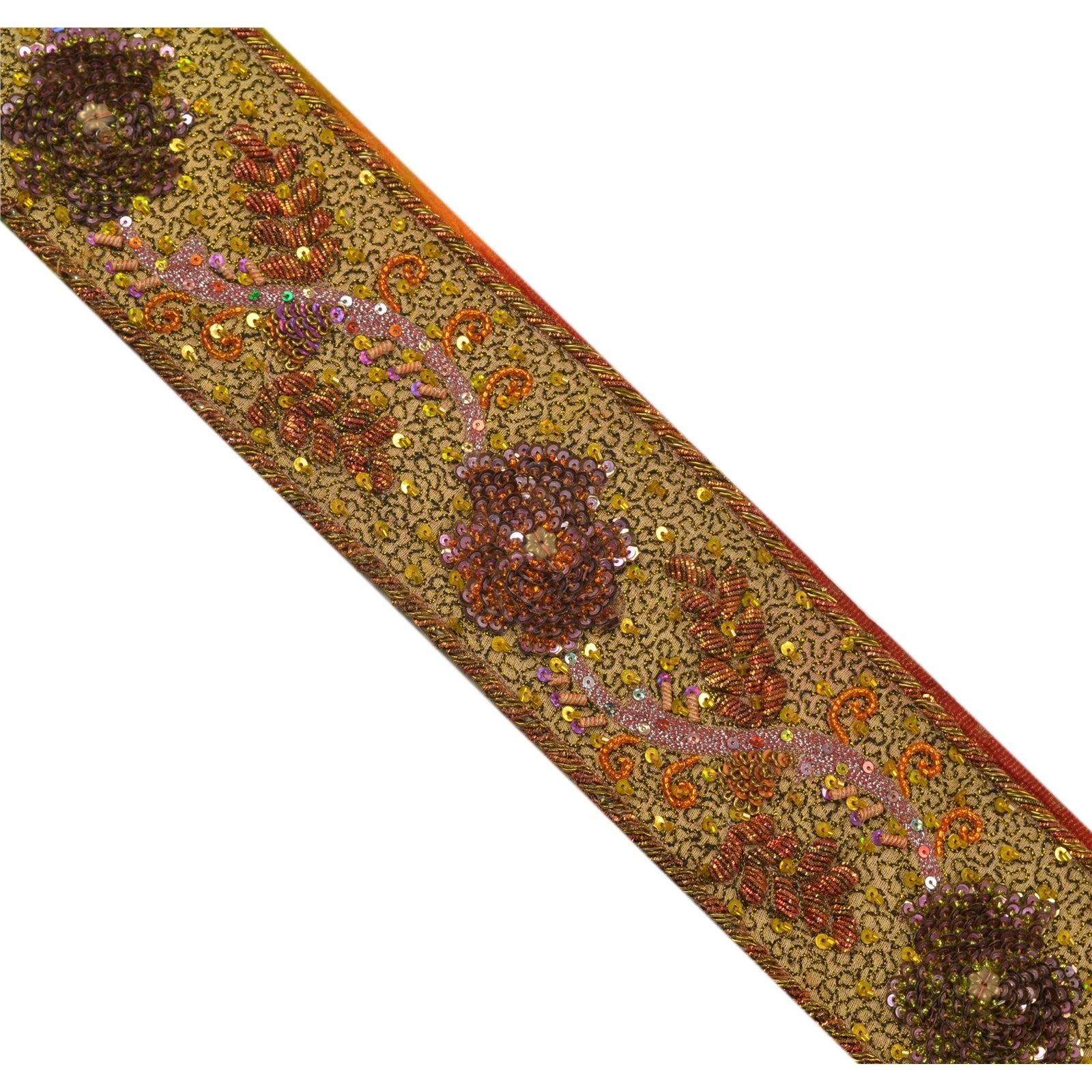 Fabulous pure silk hand beaded sari border in green color highlighting sequins work. Border has beautiful floral patterns painstakingly hand beaded with gold zardozi work, multi color dabka work, green/orange glass beads work . Further you can see fine detailing with multi color sequins work. WOW!! an awesome one of a kind versatile border. 1 Quantity = 2 Yard