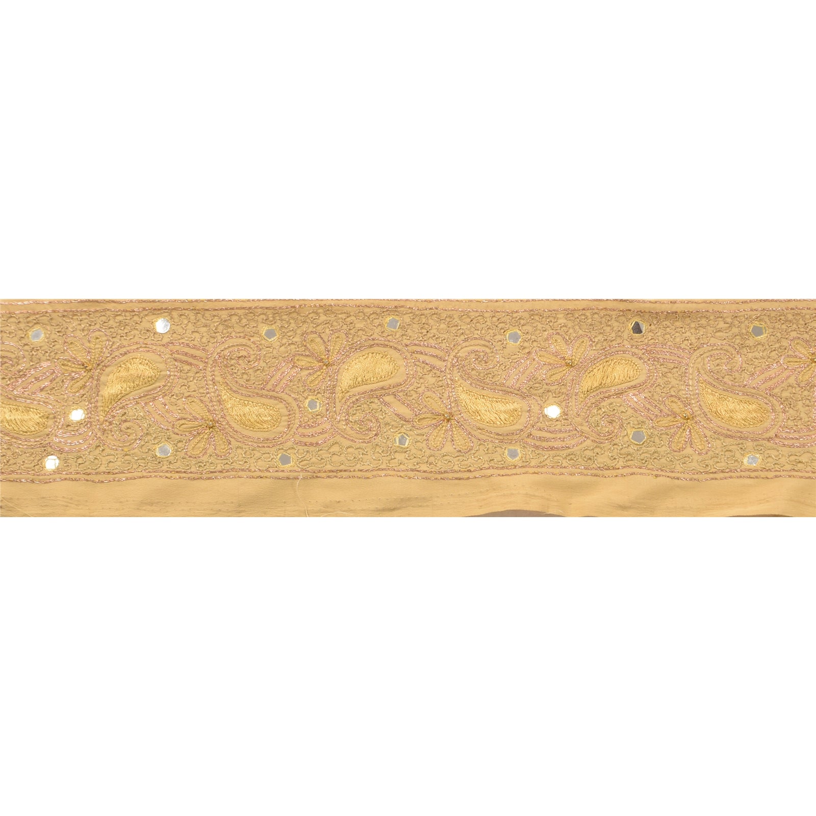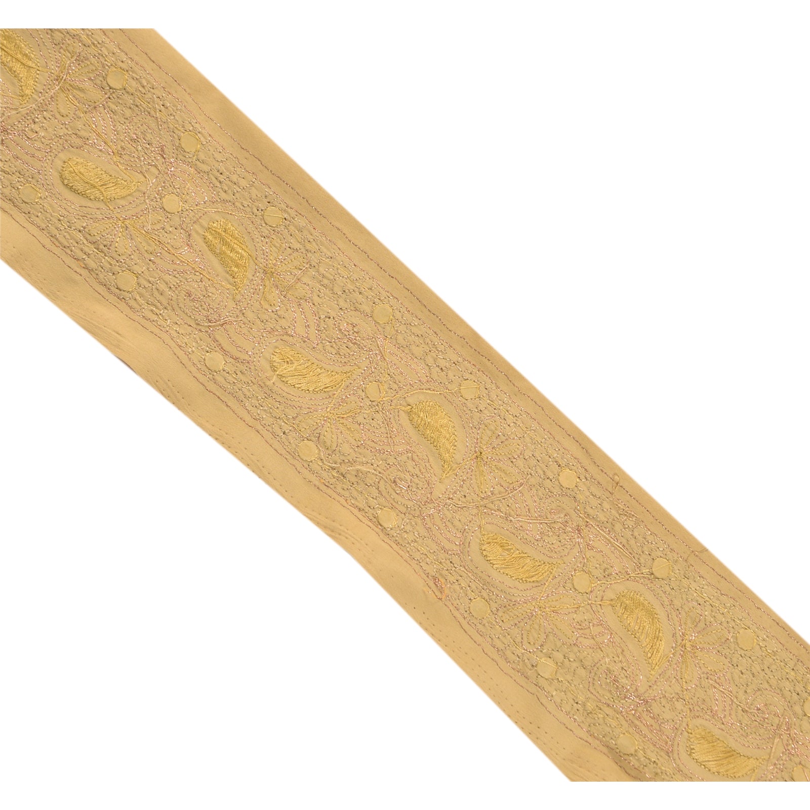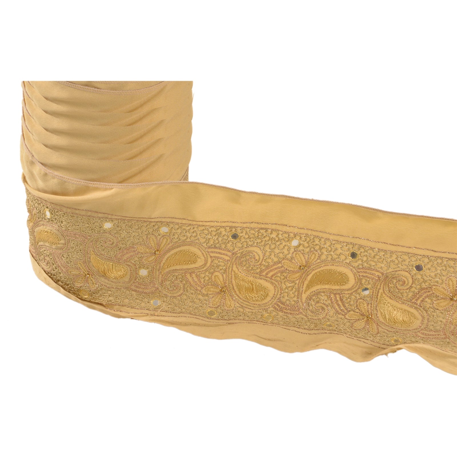 Amazing crepe silk hand beaded sari border in cream color highlighting zari work. Border has beautiful floral & paisley patterns painstakingly hand beaded with gold zari work, mirror and golden beads work . Further you can see fine detailing with cream thread work. WOW!! an awesome one of a kind versatile border. 1 Quantity = 6 Yard