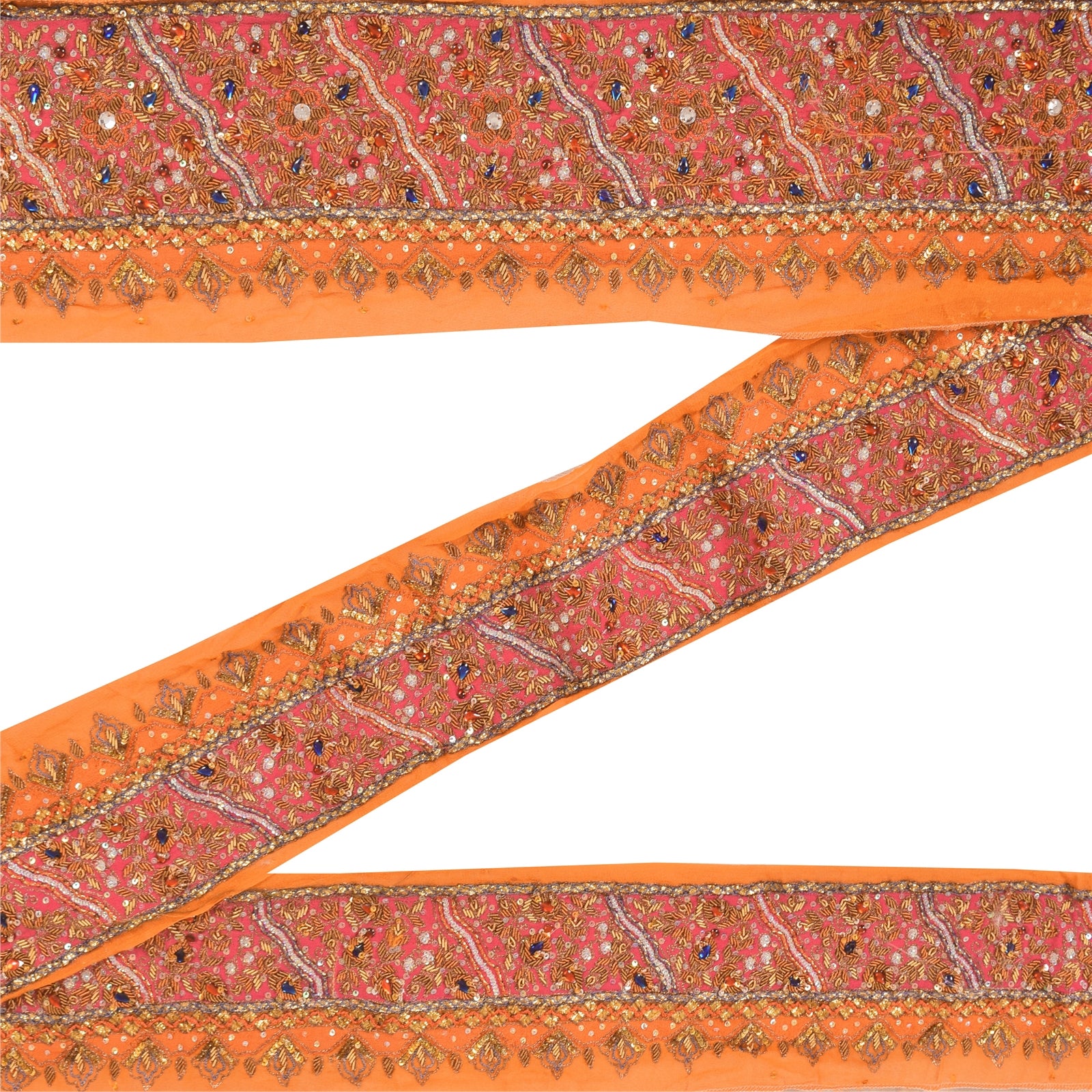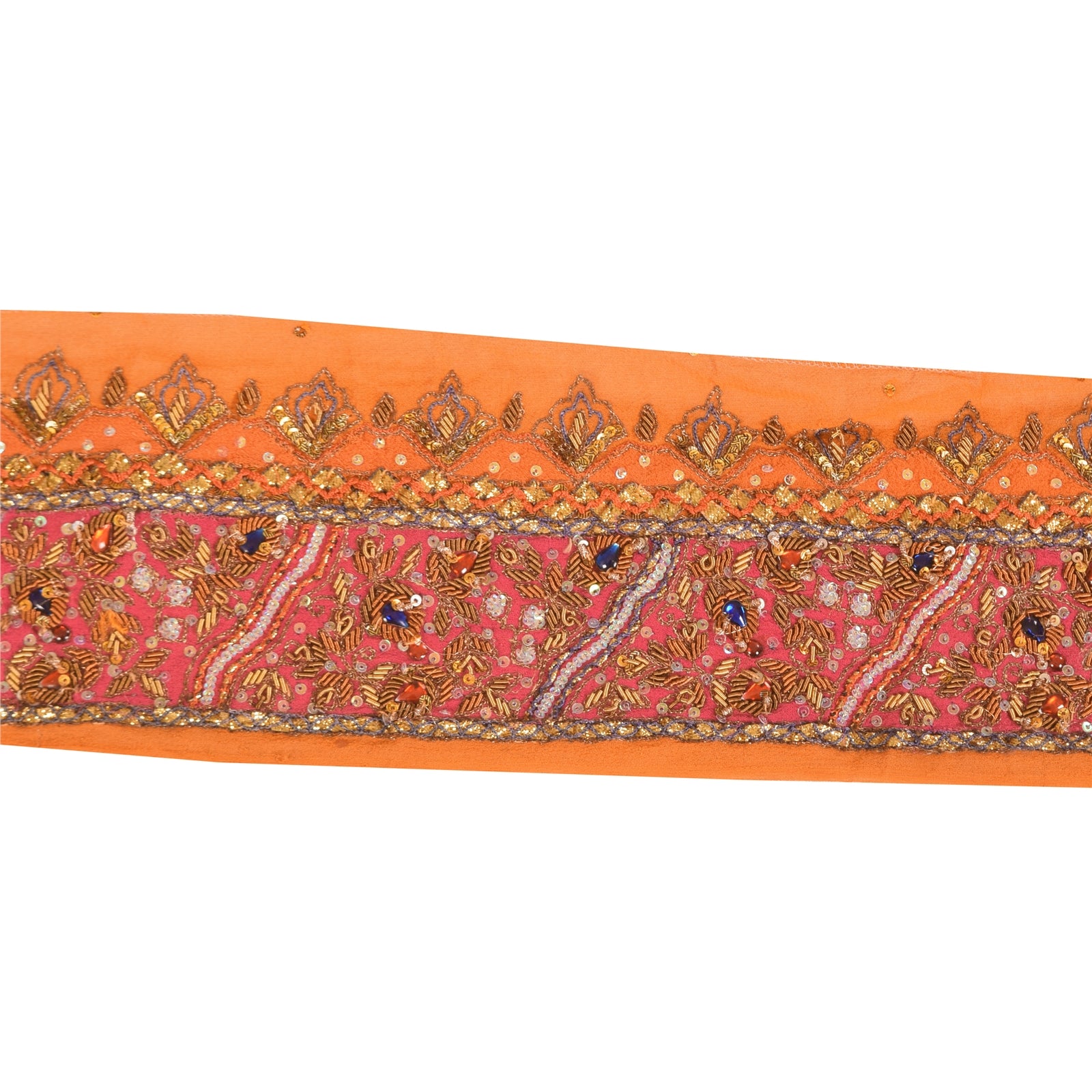 Beautiful georgette hand embroidered sari border. Further embellished by gold zari work, gold/brown zardozi work, red/blue thread work. Also, you can see gold/green sequins, blue/red kundan work along with floral design on orange & pink base fabric. 1 Quantity = 1 Yard B-7413
