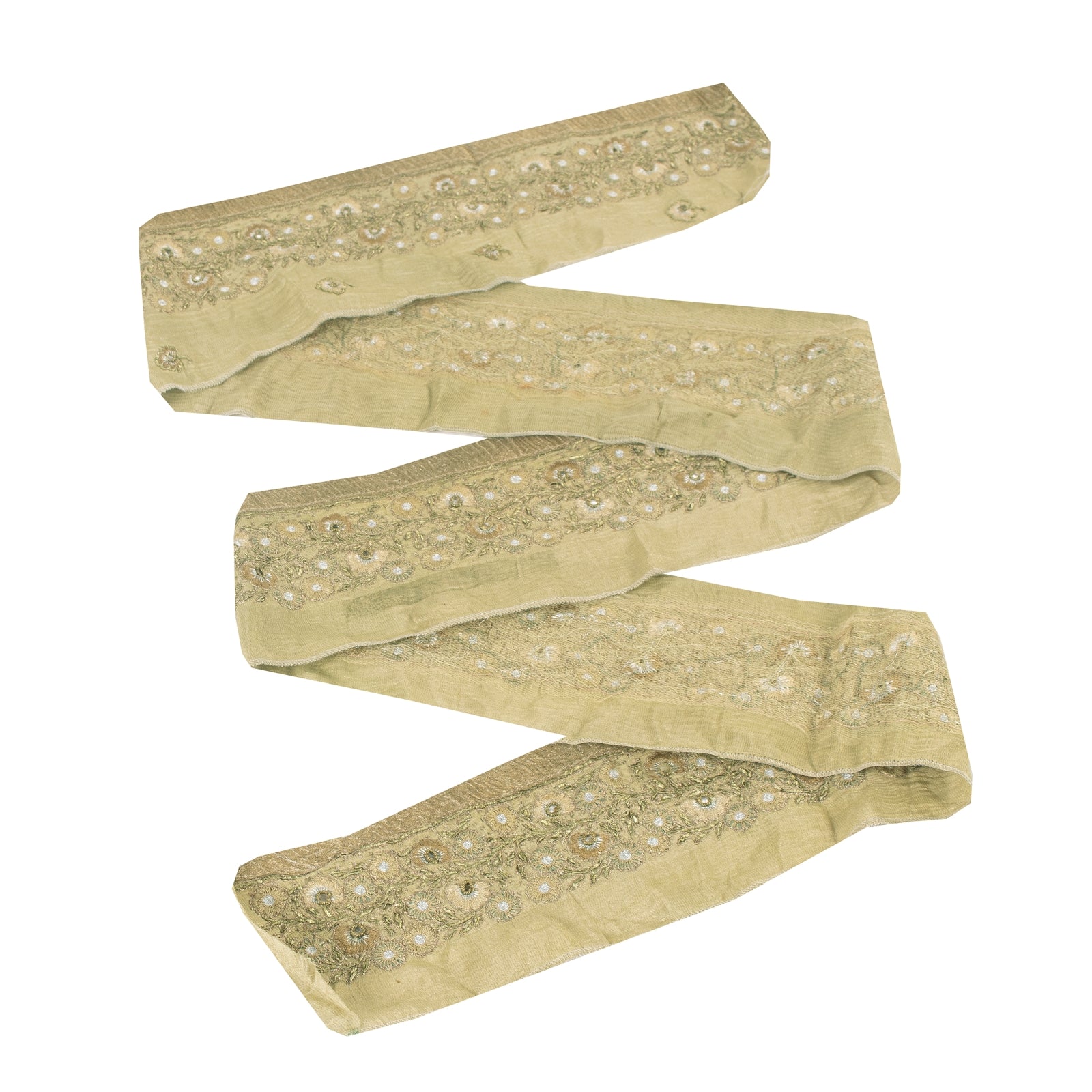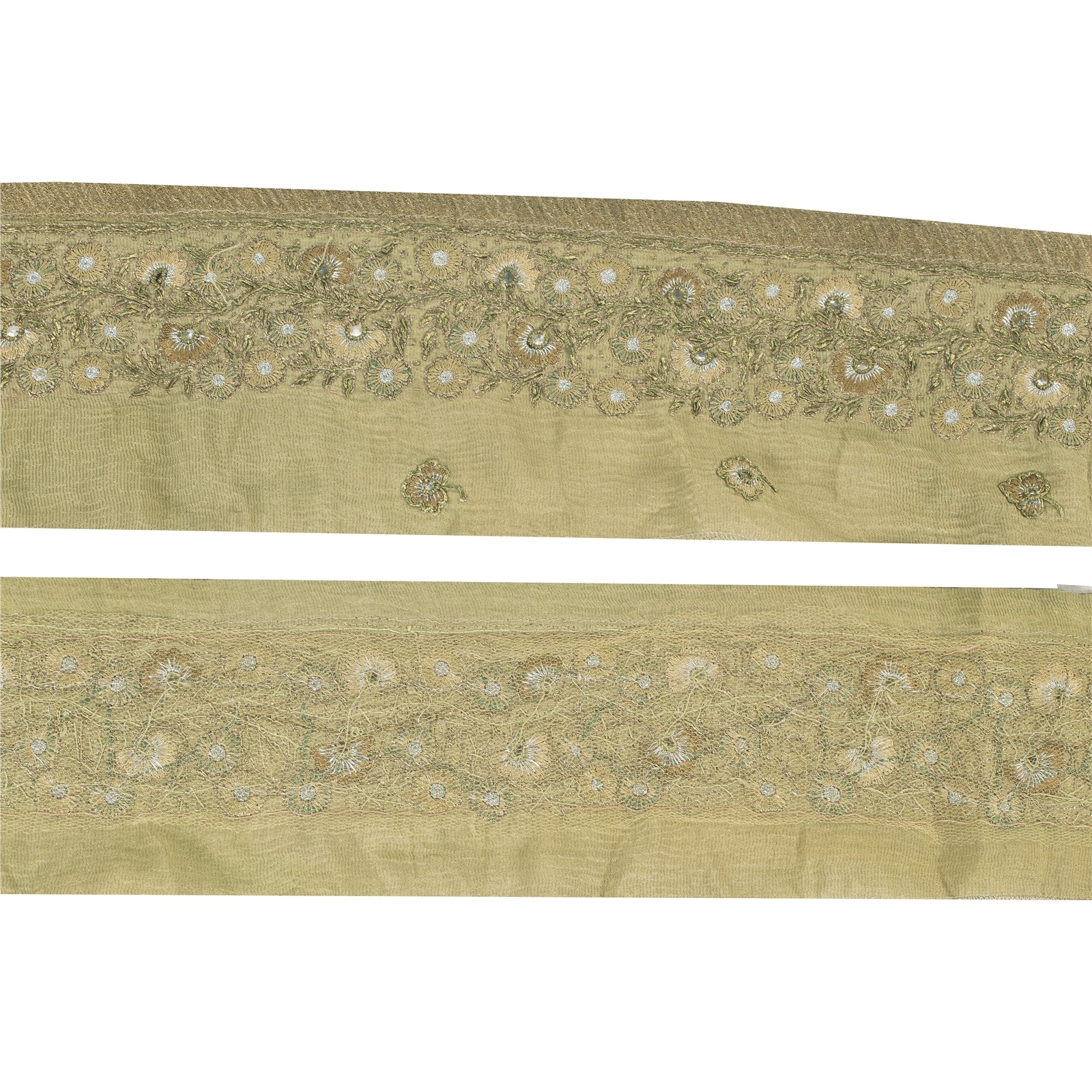 Beautiful pure silk hand embroidered sari border. Further embellished by silver/gold zari work, green zardozi work, gold dabka work . Also, you can see brown stone, pale cream/green thread work work along with floral design on pale cream fabric. 1 Quantity = 1 Yard B-8277
