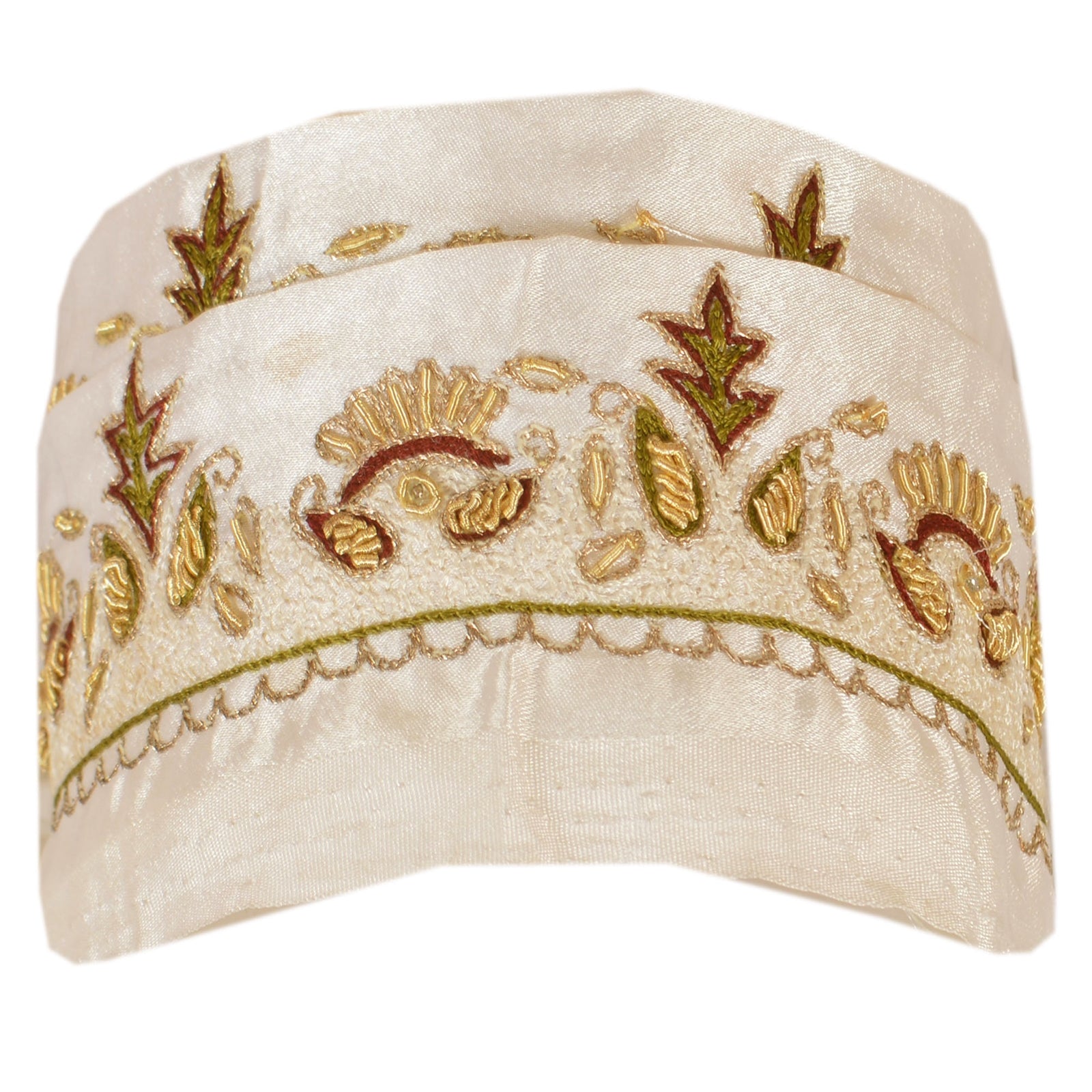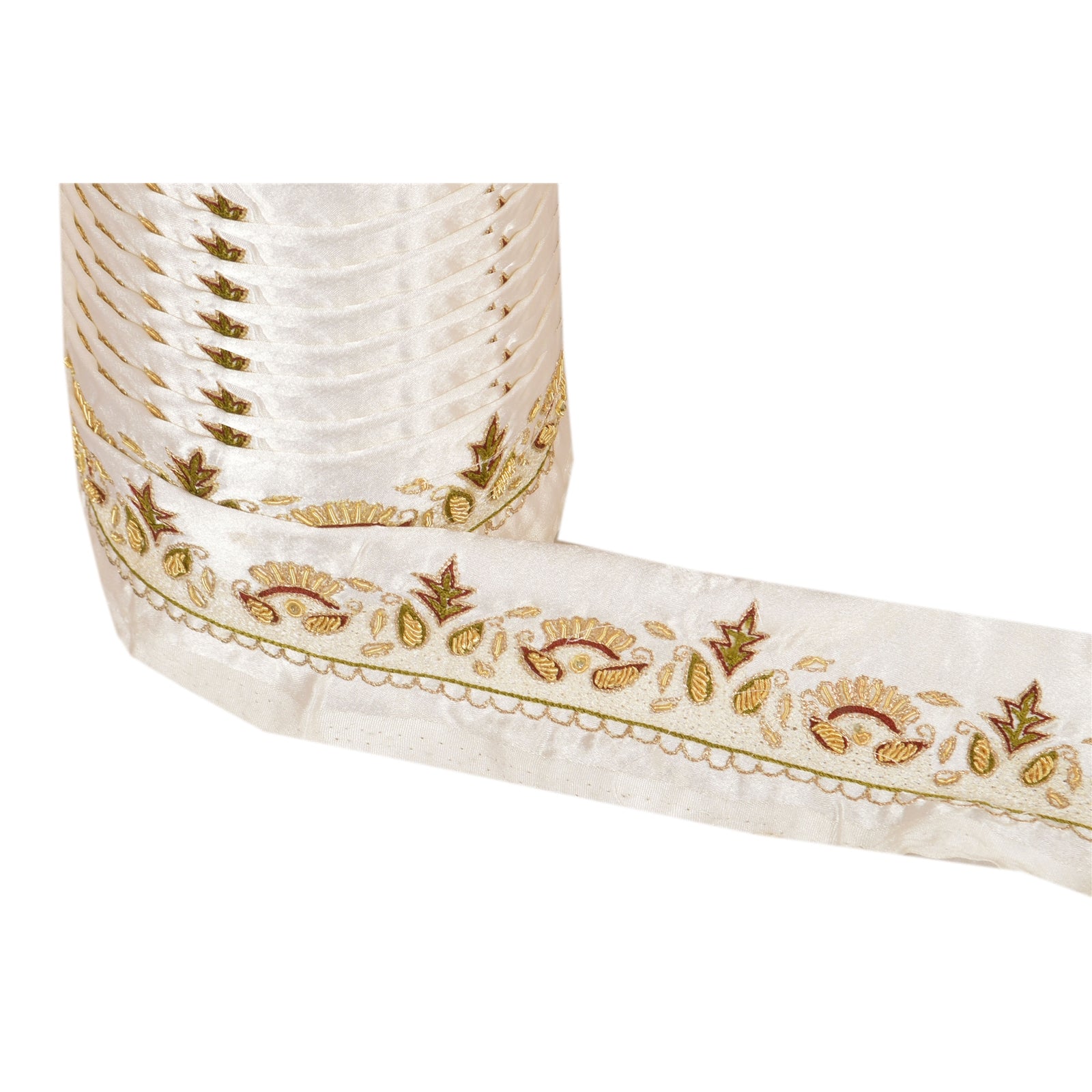 Fabulous satin silk hand embroidered sari border in white color highlighting zardozi work. Border has beautiful floral & paisley patterns painstakingly hand embroidered with gold zari/zardozi work. Further you can see fine detailing with green/maroon thread work. WOW!! an awesome one of a kind versatile border. 1 Quantity = 1 Yard