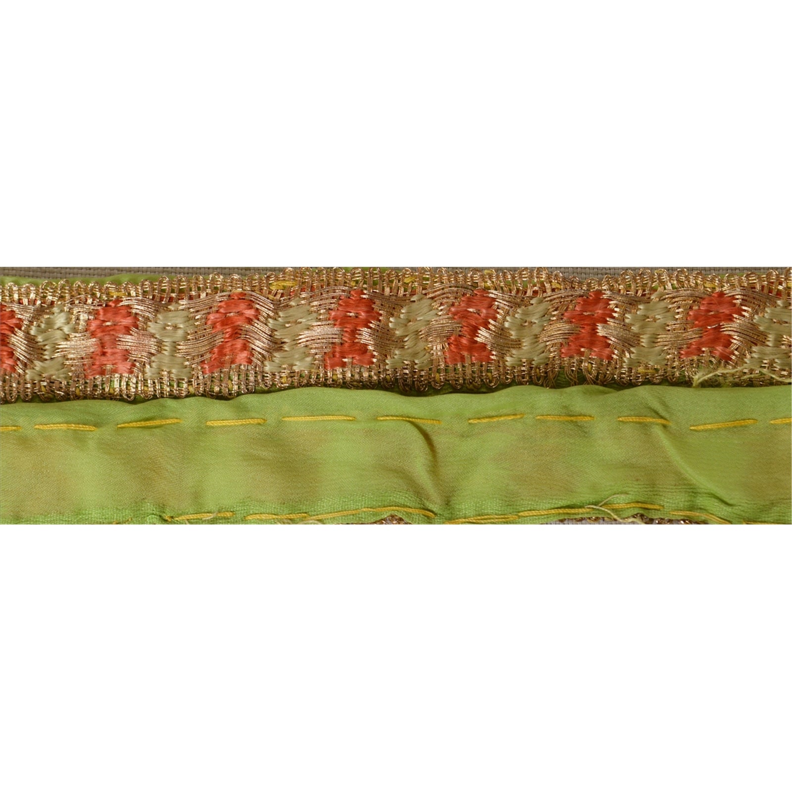 Sanskriti Vintage Sari Border Hand Embroidered 1 YD Trim Art Silk Ribbon Green