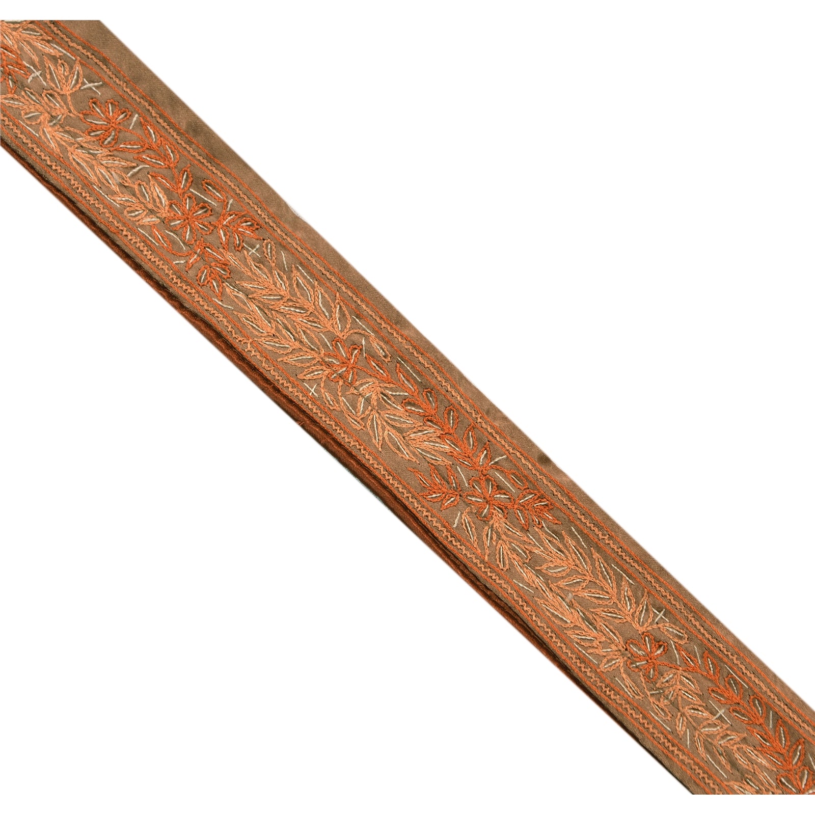 Amazing satin silk hand embroidered sari border in brown color highlighting thread work. Border has beautiful floral & paisley patterns painstakingly embroidered with brown, orange, cream thread work . WOW!! an awesome one of a kind versatile border. 1 Quantity = 1 Yard
