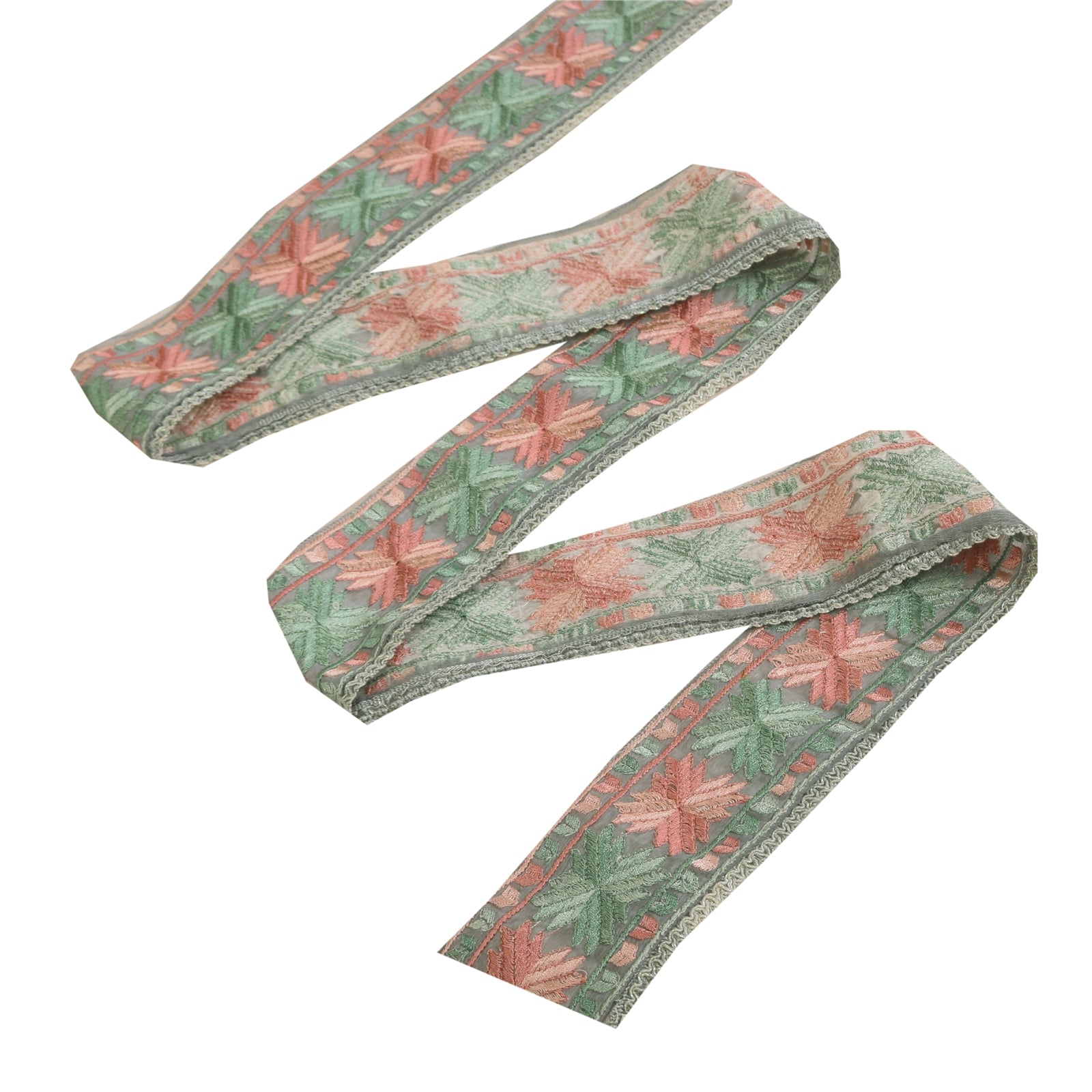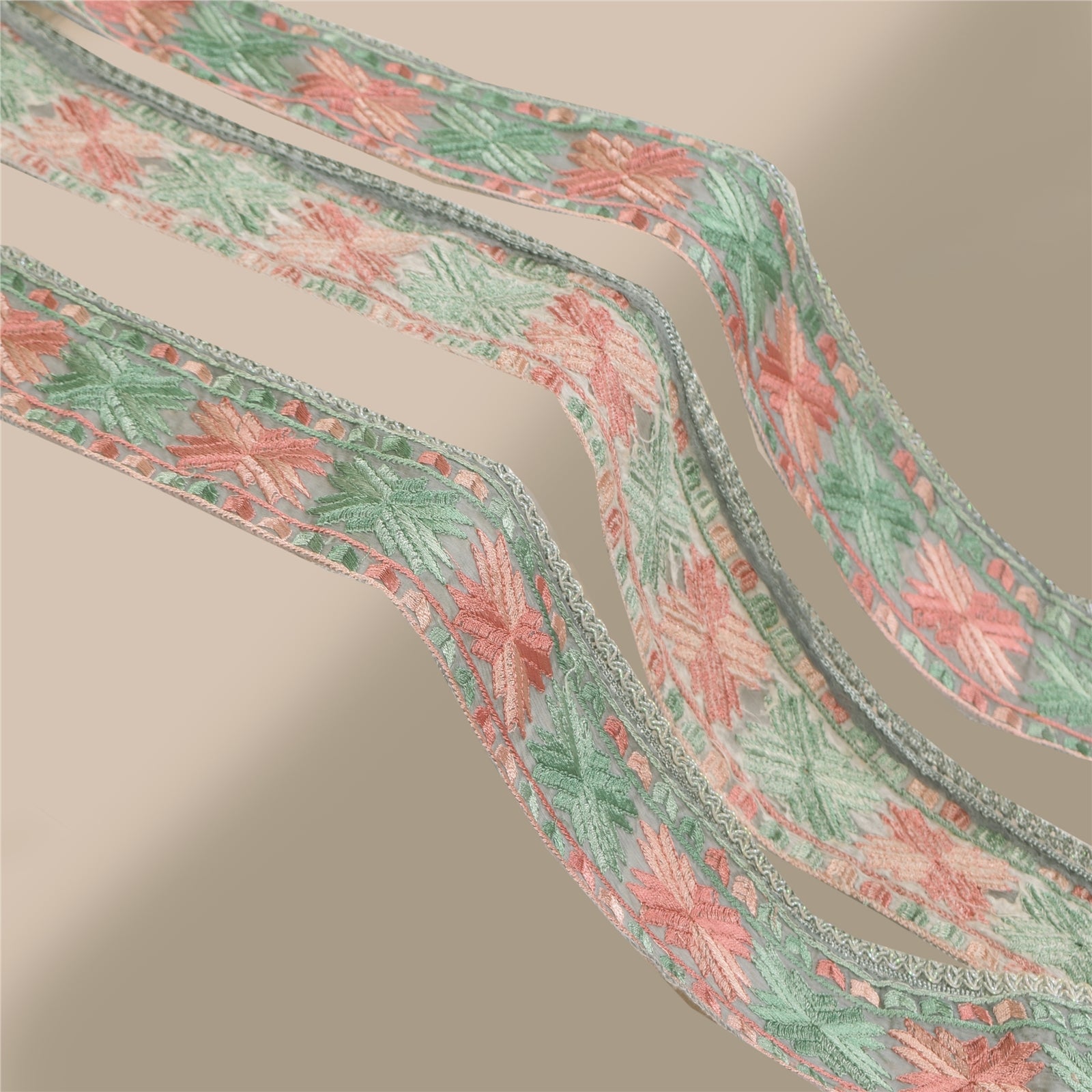 Beautiful pure chiffon silk hand embroidered phulkari sari border. Further embellished by pink/peach/green thread work. Also, you can green/silver lace work along with floral design on grey base fabric. 1 Quantity = 1 Yard B-6452