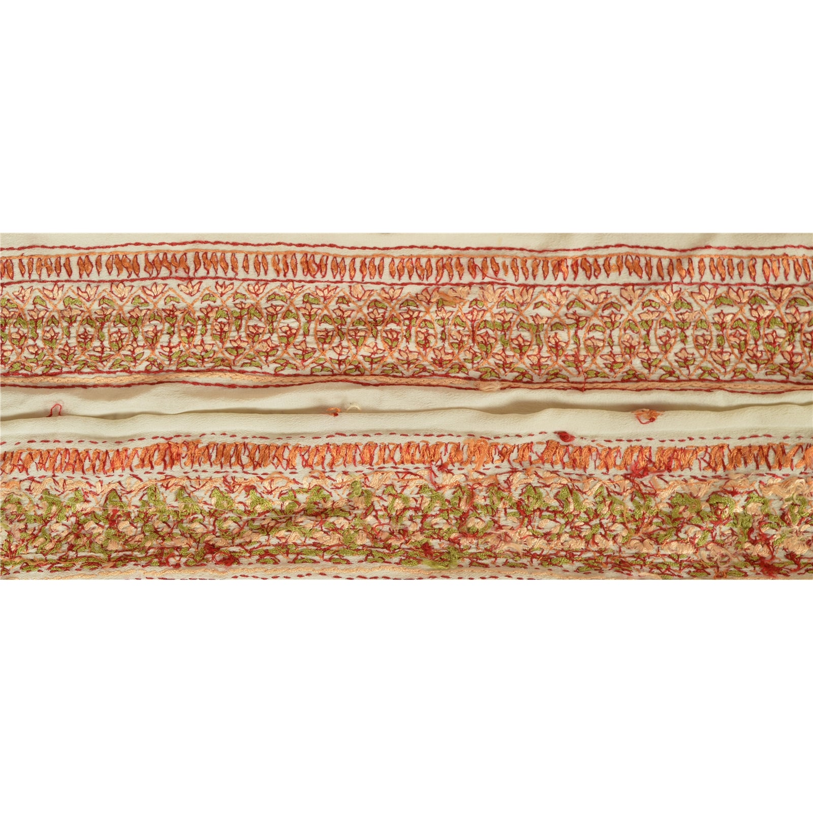 Fabulous crepe silk hand embroidered Suzani sari border in cream color highlighting thread work. Border has beautiful floral patterns painstakingly hand embroidered with peach, green, brown, saffron thread work . WOW!! an awesome one of a kind versatile border. 1 Quantity = 1 Yard