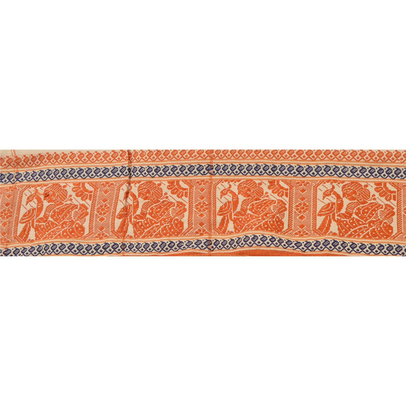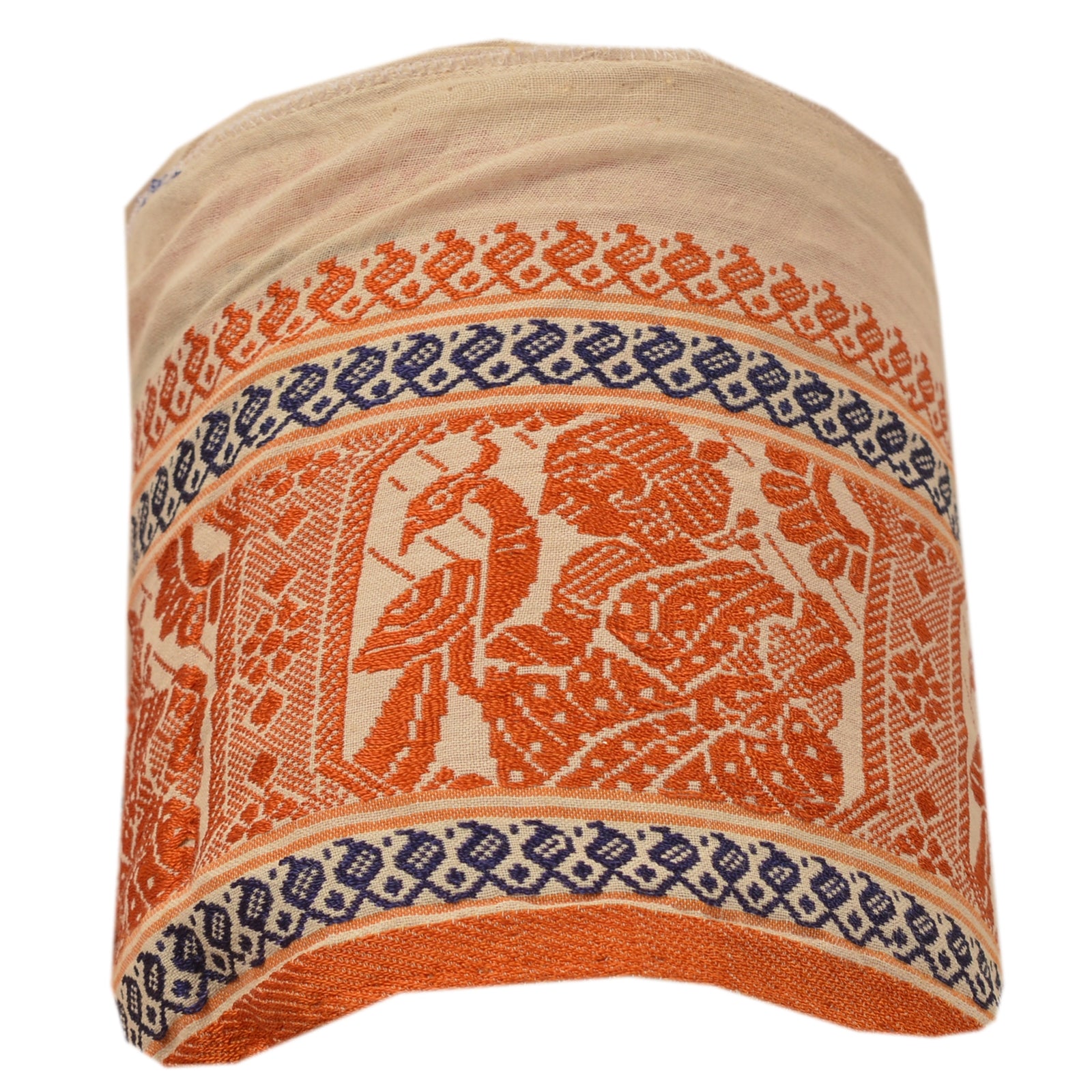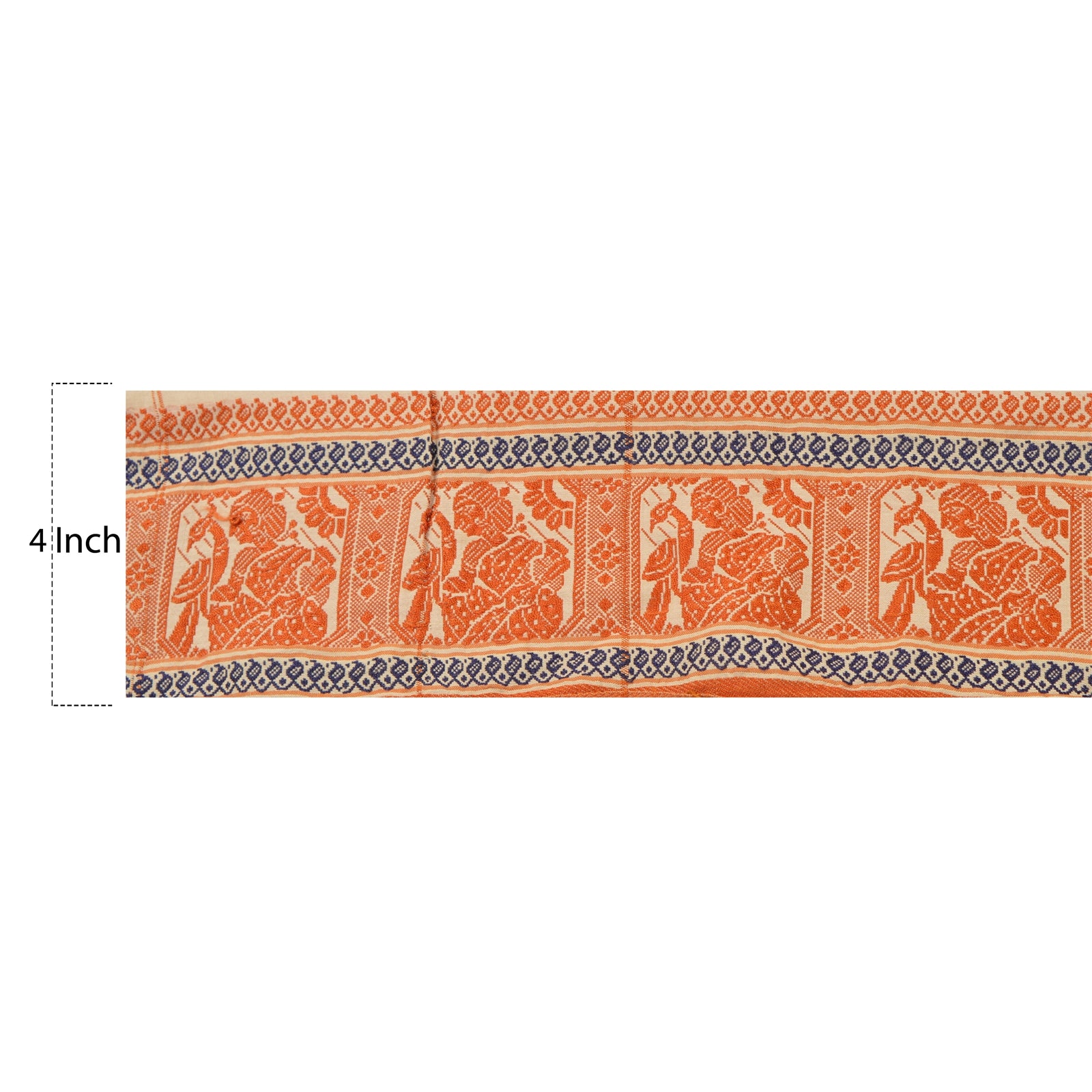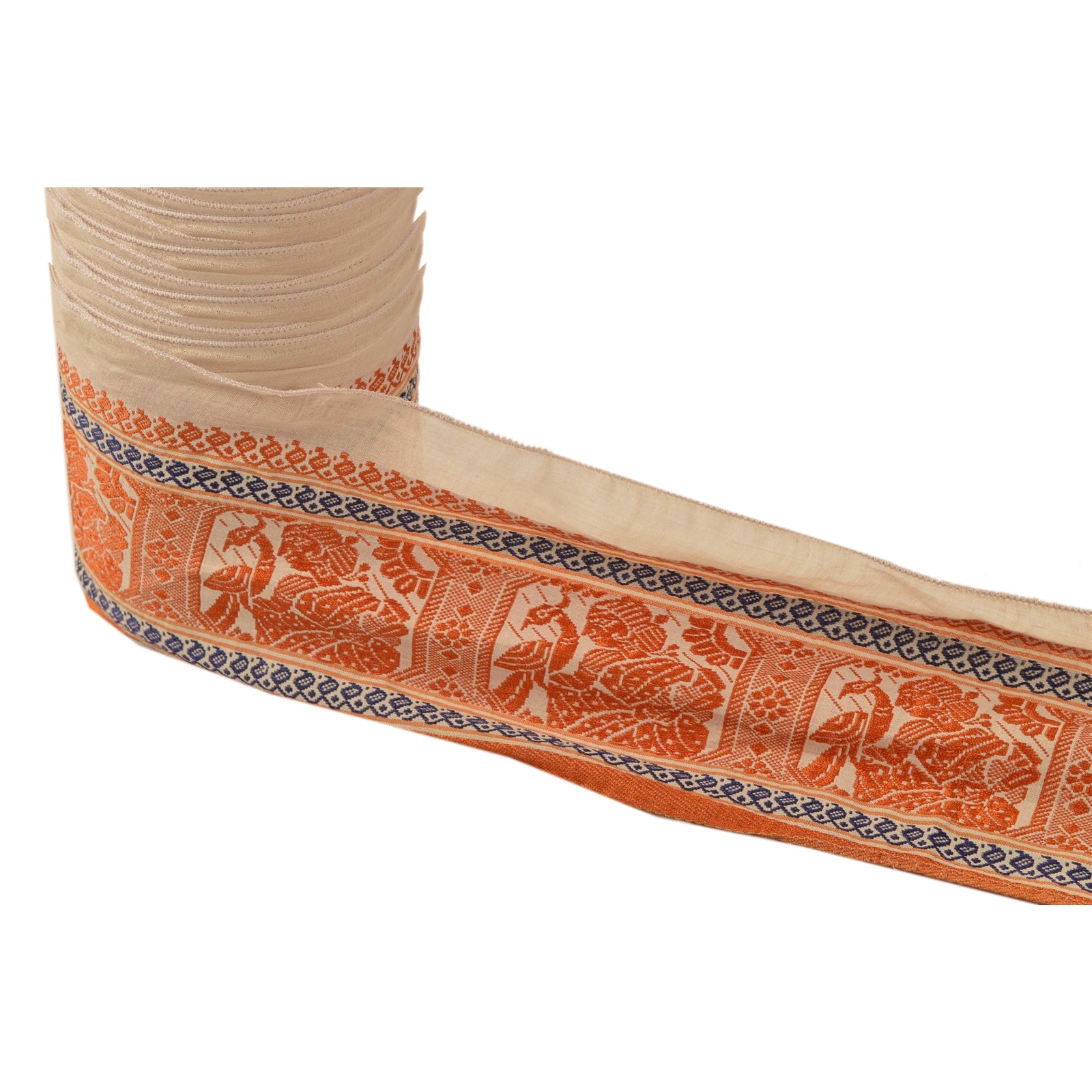 Amazing cotton woven sari border in cream color highlighting traditional Baluchari work from Odisha (Eastern India). Border has beautiful orange & blue weaving pattern showcasing woman design . Floral, paisley and peacock motifs further add to the beauty of the trim. WOW!! and awesome one of a kind versatile border. 1 Quantity = 1 Yard